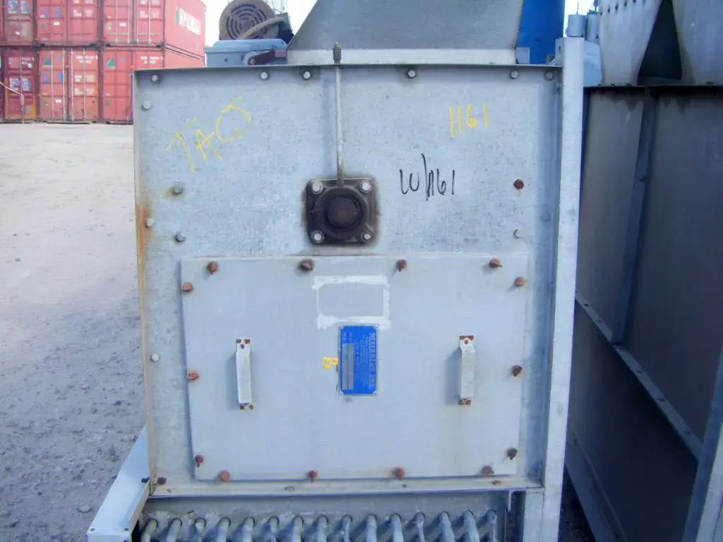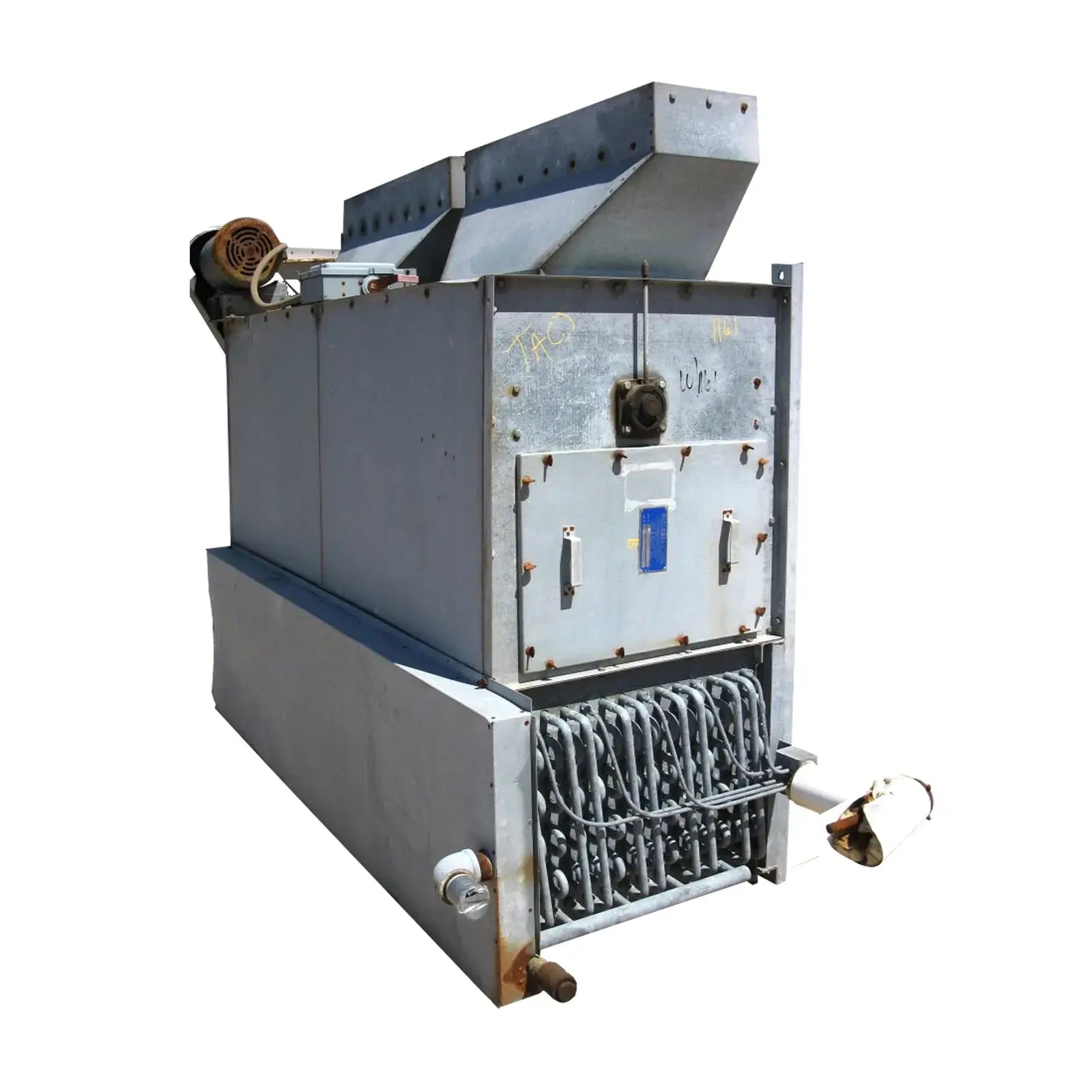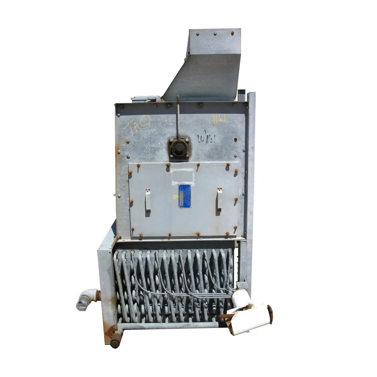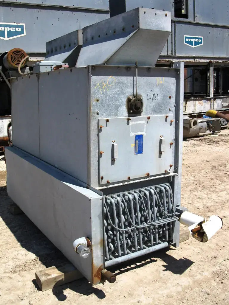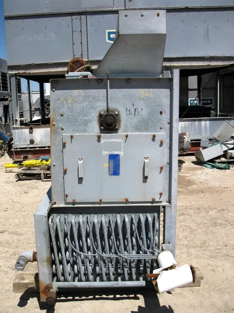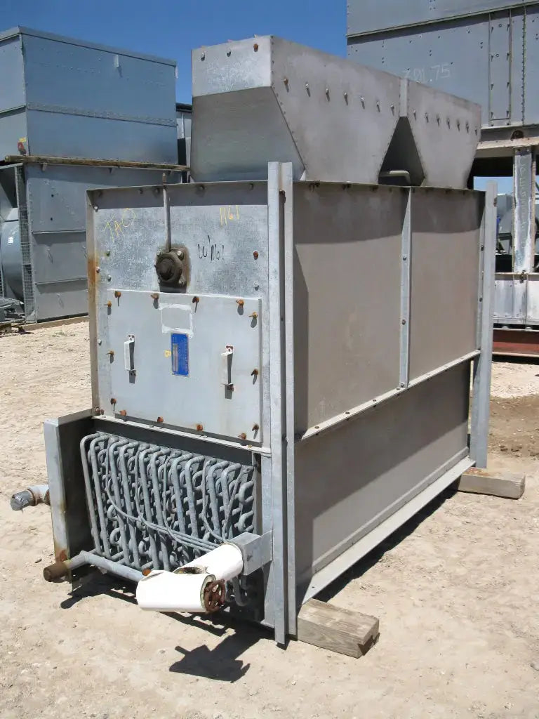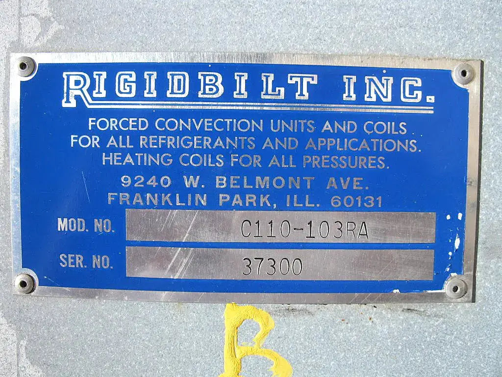 Rigidbilt Inc. Hanging Evaporator. Model: C110-103RA. Estimated nominal capacity: 8.5 tons or 11,000 BTUH using direct expansion ammonia (R-717) for a 40°F room with a suction temperature of 30°F. Coil: 10 rows of a ¾ in. diameter tube with 3 fins per inch. (2) squirrel cage design fans, 2 ft. 1 in. diameter, each with 48 blades. Pulley diameters: (1) 7-1/2 in. driver. (1) 1 ft. 1-3/4 in. driven. U.S. Electrical motor: 5 hp, 1725 rpm, 230/460 V, 14.4/7.2 A, 60 Hz, 3 phase. Cutler-Hammer on/off power box: 20 max hp, 600V, 30A, 3 phase. Front air inlet dimensions: 3 ft. L x 1 ft. W. Inlets/outlets: (1) 2-1/2 in. NPT, (1) 2 in. NPT, (1) ¾ in. NPT. Front air vent dimensions: 3 ft. L. x 1 ft. W. Overall dimensions: 8 ft. 6-1/2 in. L x 3 ft. 7-1/2 in. W x 6 ft. 5-1/4 in. H.(ACN145).