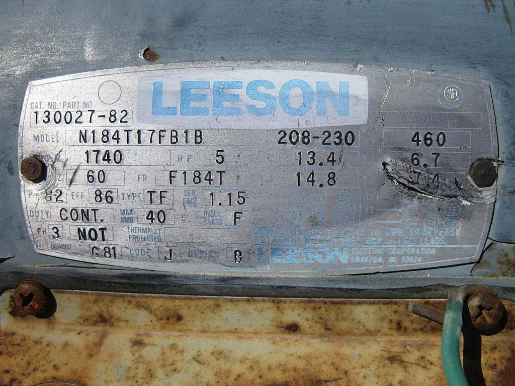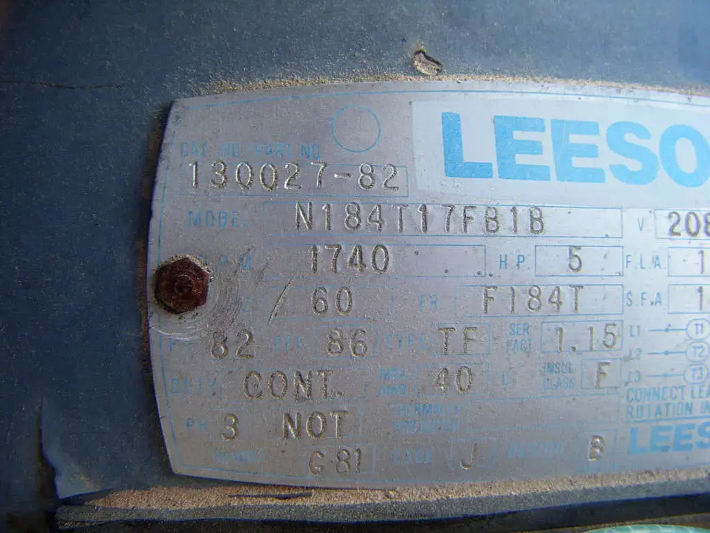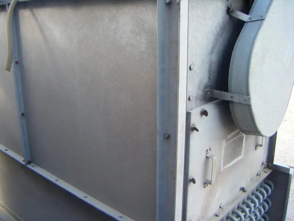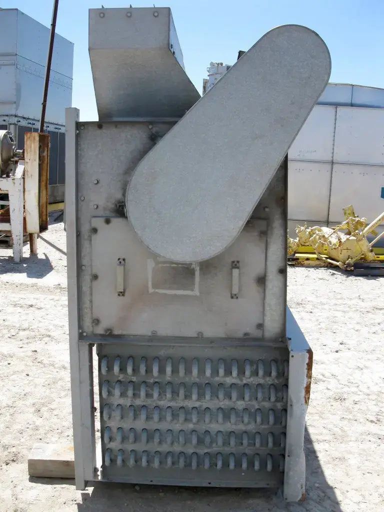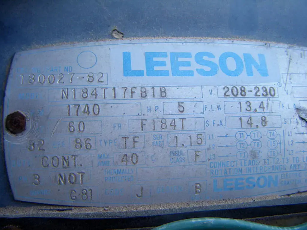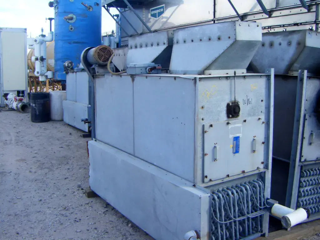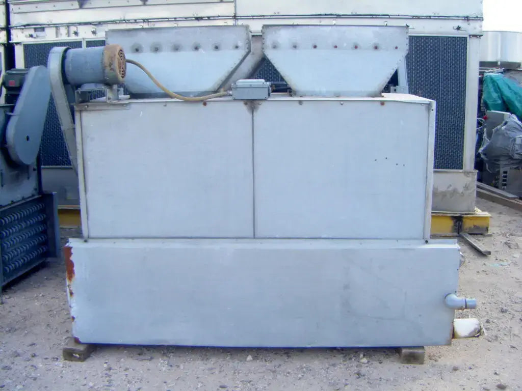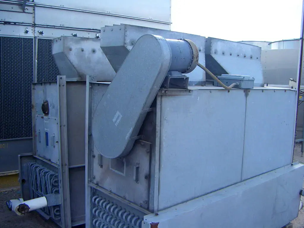 Rigidbilt Inc. Hanging Evaporator. Model: C110-103RA. Estimated nominal capacity: 8.5 tons or 11,000 BTUH using direct expansion ammonia (R-717) for a 40°F room with a suction temperature of 30°F. Coil: 10 rows of a ¾ in. diameter tube with 3 fins per inch. (2) squirrel cage design fans, 2 ft. 1 in. diameter, each with 48 blades. Pulley diameters: (1) 7-1/2 in. driver. (1) 1 ft. 1-3/4 in. driven. U.S. Electrical motor: 5 hp, 1725 rpm, 230/460 V, 14.4/7.2 A, 60 Hz, 3 phase. Cutler-Hammer on/off power box: 20 max hp, 600V, 30A, 3 phase. Front air inlet dimensions: 3 ft. L x 1 ft. W. Inlets/outlets: (1) 2-1/2 in. NPT, (1) 2 in. NPT, (1) ¾ in. NPT. Front air vent dimensions: 3 ft. L. x 1 ft. W. Overall dimensions: 8 ft. 6-1/2 in. L x 3 ft. 7-1/2 in. W x 6 ft. 5-1/4 in. H.(ACN145).