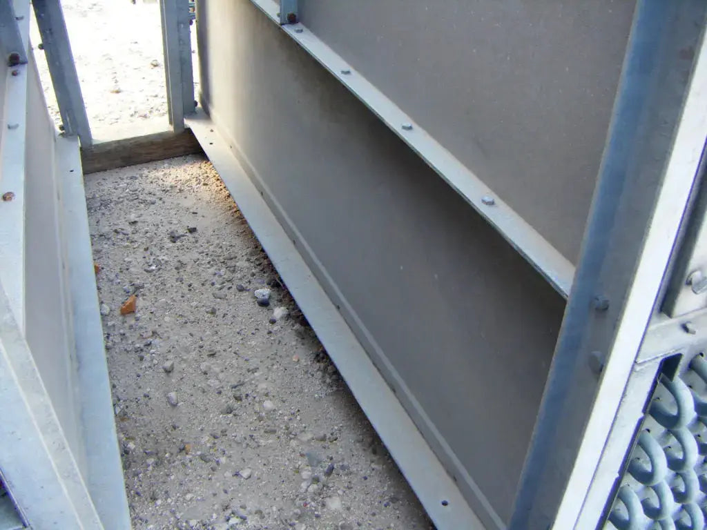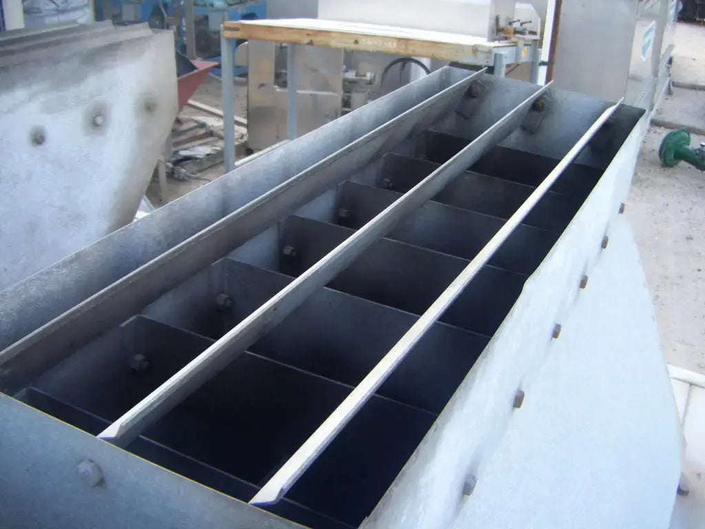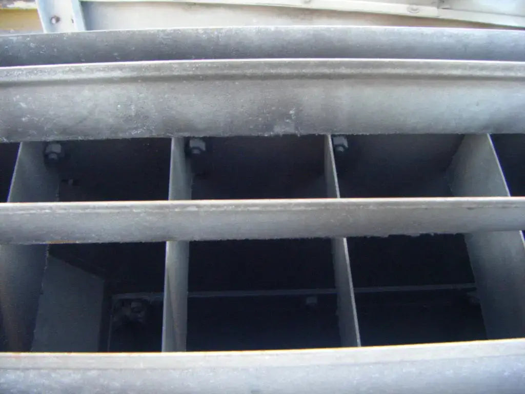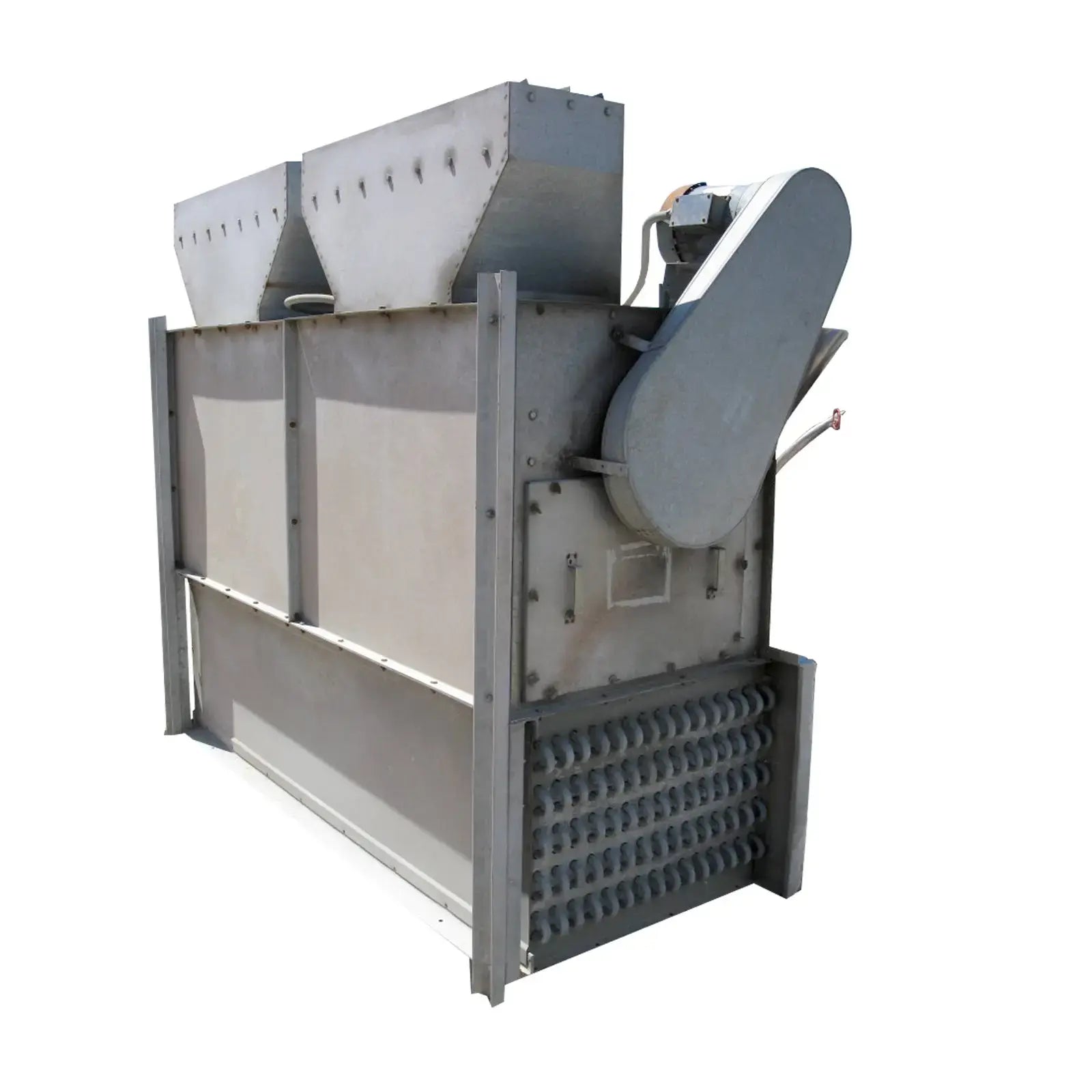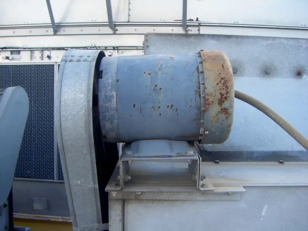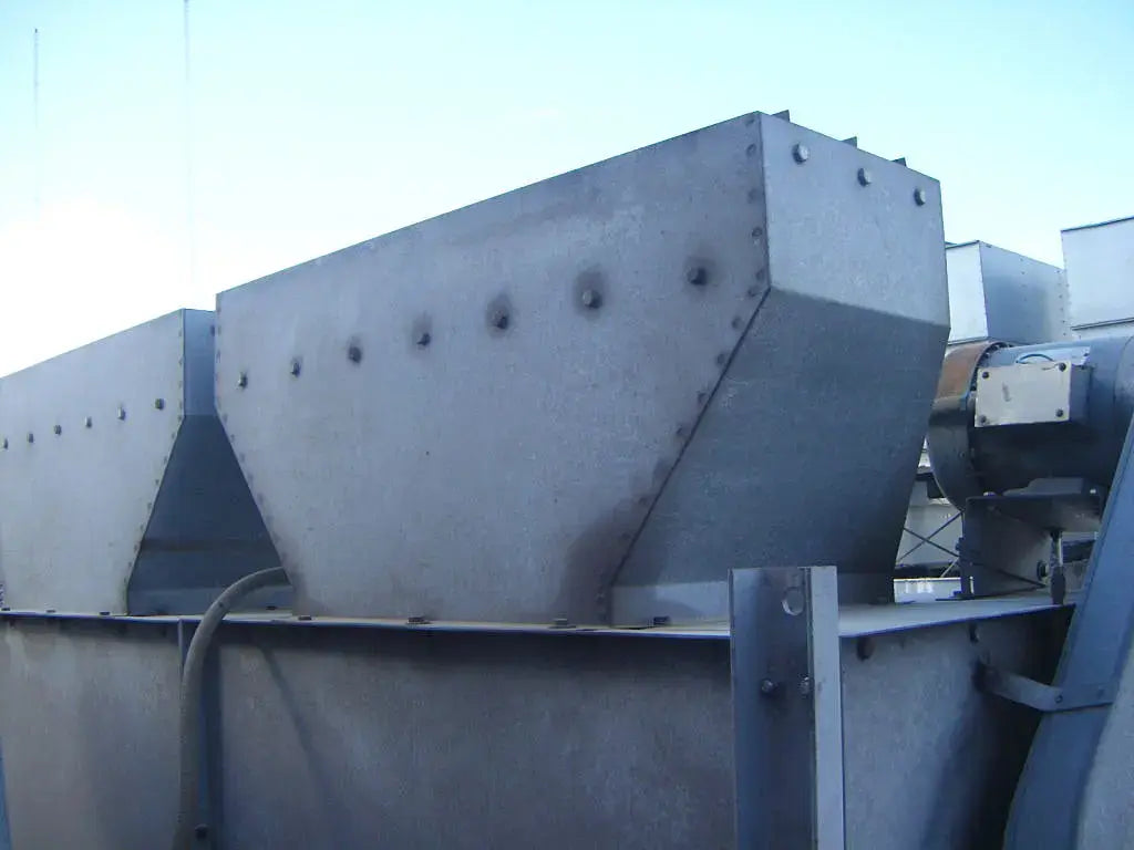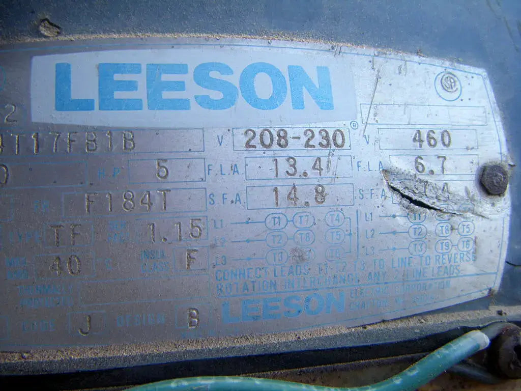 Rigidbilt Inc. Hanging Evaporator. Model: C110-103RA. Estimated nominal capacity: 8.5 tons or 11,000 BTUH using direct expansion ammonia (R-717) for a 40°F room with a suction temperature of 30°F. Coil: 10 rows of a ¾ in. diameter tube with 3 fins per inch. (2) squirrel cage design fans, 2 ft. 1 in. diameter, each with 48 blades. Pulley diameters: (1) 7-1/2 in. driver. (1) 1 ft. 1-3/4 in. driven. U.S. Electrical motor: 5 hp, 1725 rpm, 230/460 V, 14.4/7.2 A, 60 Hz, 3 phase. Cutler-Hammer on/off power box: 20 max hp, 600V, 30A, 3 phase. Front air inlet dimensions: 3 ft. L x 1 ft. W. Inlets/outlets: (1) 2-1/2 in. NPT, (1) 2 in. NPT, (1) ¾ in. NPT. Front air vent dimensions: 3 ft. L. x 1 ft. W. Overall dimensions: 8 ft. 6-1/2 in. L x 3 ft. 7-1/2 in. W x 6 ft. 5-1/4 in. H.(ACN145).