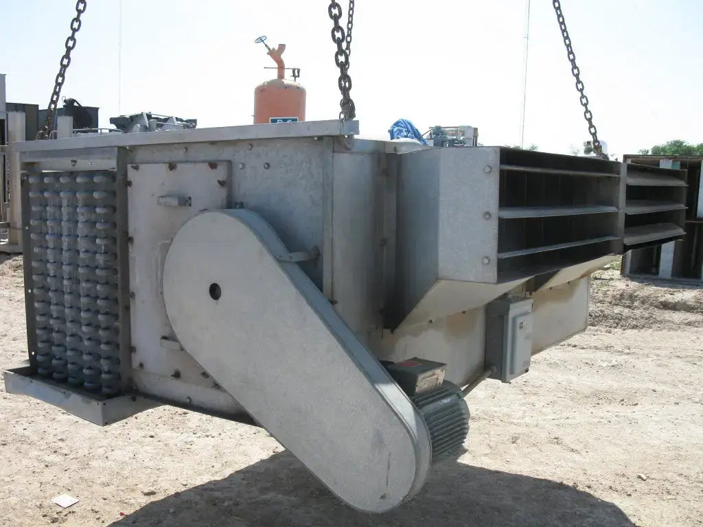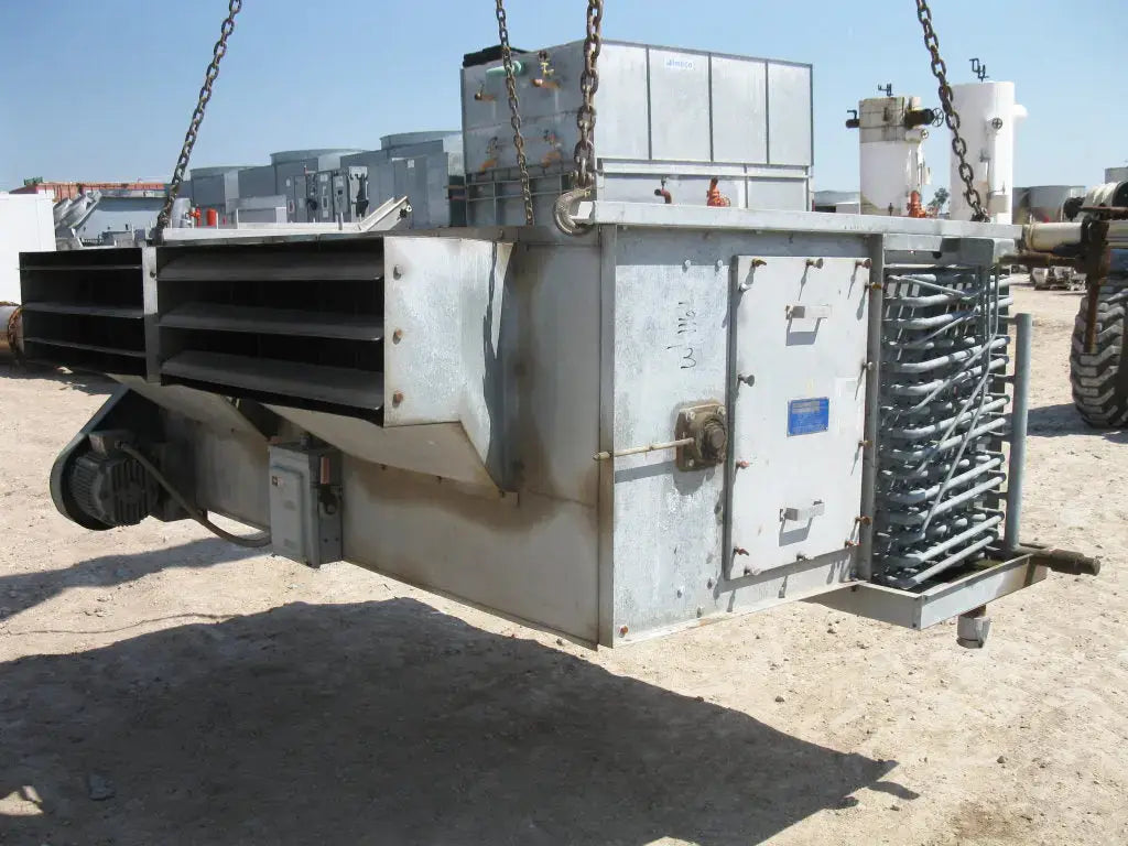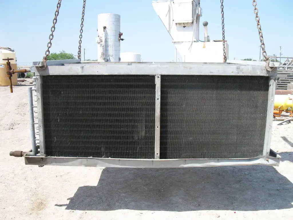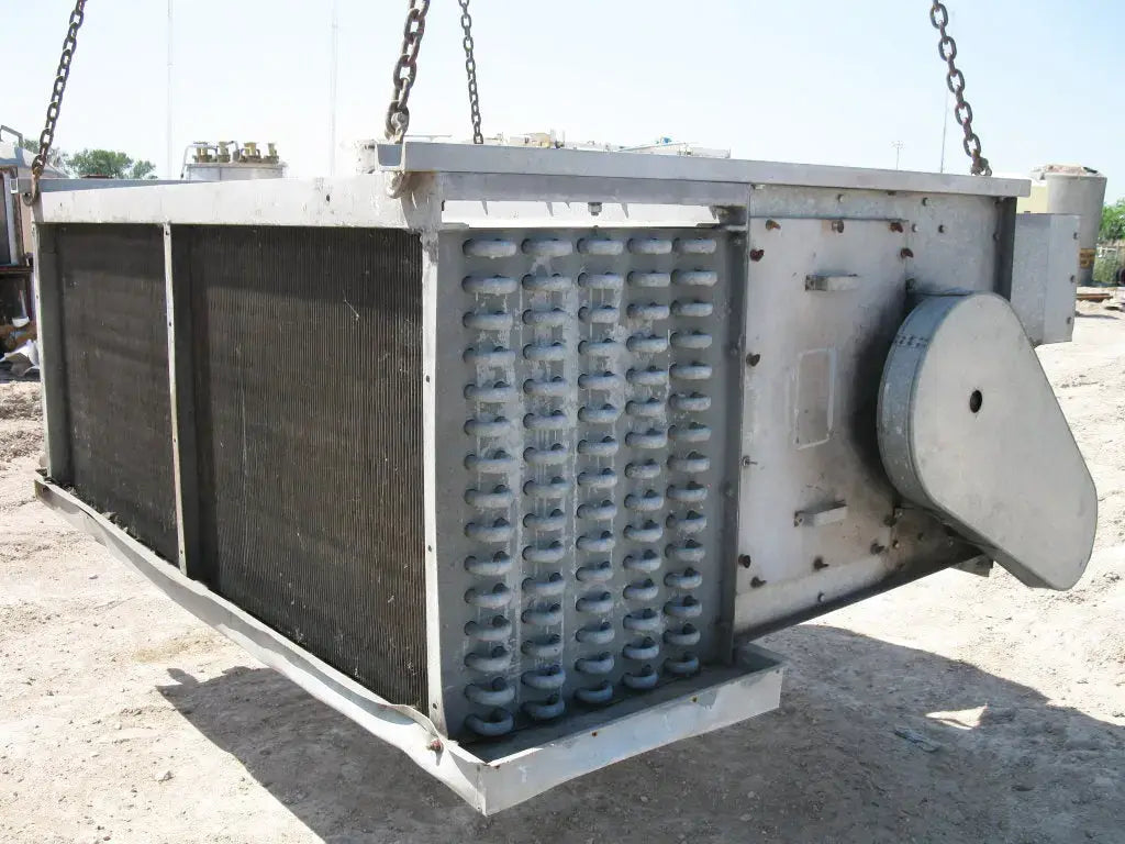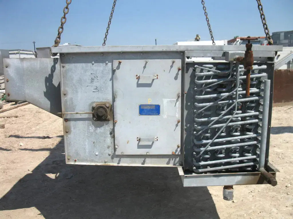 Rigidbilt Inc. Hanging Evaporator. Model: C110-103RA. Estimated nominal capacity: 8.5 tons or 11,000 BTUH using direct expansion ammonia (R-717) for a 40°F room with a suction temperature of 30°F. Coil: 10 rows of a ¾ in. diameter tube with 3 fins per inch. (2) squirrel cage design fans, 2 ft. 1 in. diameter, each with 48 blades. Pulley diameters: (1) 7-1/2 in. driver. (1) 1 ft. 1-3/4 in. driven. U.S. Electrical motor: 5 hp, 1725 rpm, 230/460 V, 14.4/7.2 A, 60 Hz, 3 phase. Cutler-Hammer on/off power box: 20 max hp, 600V, 30A, 3 phase. Front air inlet dimensions: 3 ft. L x 1 ft. W. Inlets/outlets: (1) 2-1/2 in. NPT, (1) 2 in. NPT, (1) ¾ in. NPT. Front air vent dimensions: 3 ft. L x 1 ft. W. Overall dimensions: 8 ft. 6-1/2 in. L x 3 ft. 7-1/2 in. W x 6 ft. 5-1/4 in. H.(ACN145).