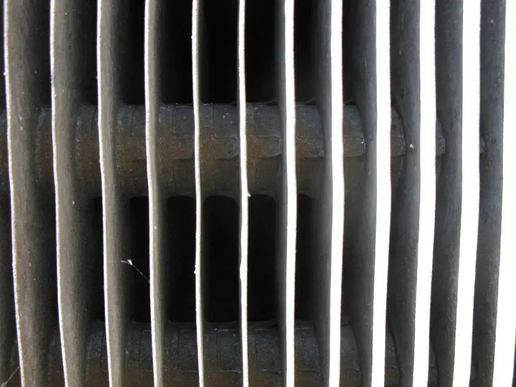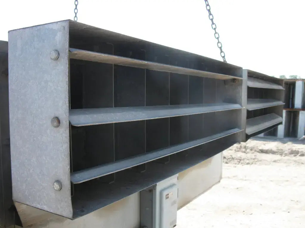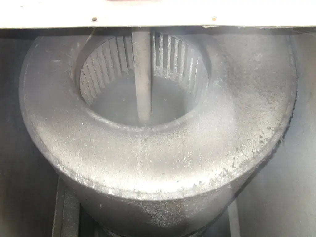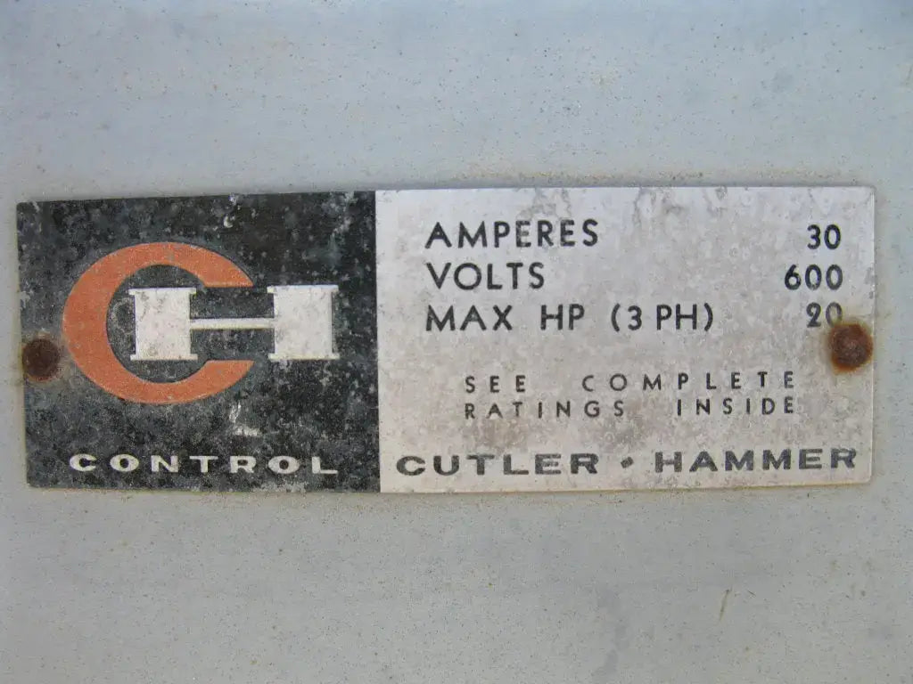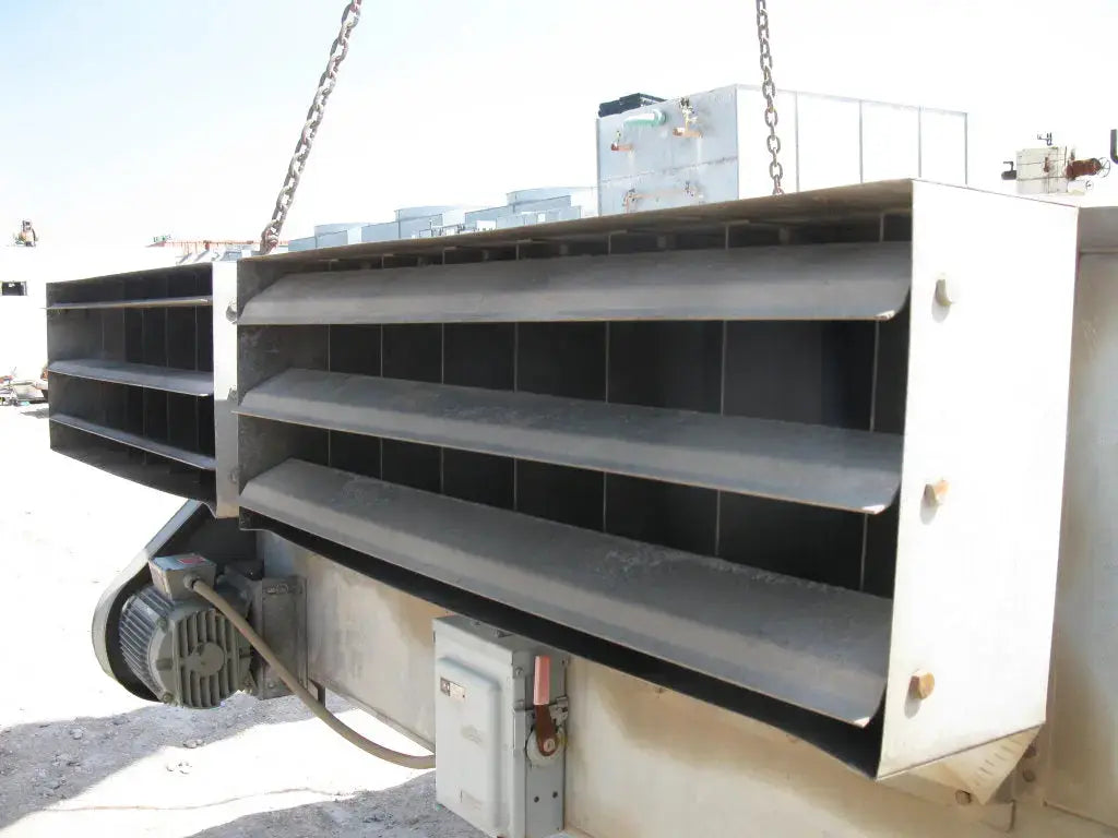 Rigidbilt Inc. Hanging Evaporator. Model: C110-103RA. Estimated nominal capacity: 8.5 tons or 11,000 BTUH using direct expansion ammonia (R-717) for a 40°F room with a suction temperature of 30°F. Coil: 10 rows of a ¾ in. diameter tube with 3 fins per inch. (2) squirrel cage design fans, 2 ft. 1 in. diameter, each with 48 blades. Pulley diameters: (1) 7-1/2 in. driver. (1) 1 ft. 1-3/4 in. driven. U.S. Electrical motor: 5 hp, 1725 rpm, 230/460 V, 14.4/7.2 A, 60 Hz, 3 phase. Cutler-Hammer on/off power box: 20 max hp, 600V, 30A, 3 phase. Front air inlet dimensions: 3 ft. L x 1 ft. W. Inlets/outlets: (1) 2-1/2 in. NPT, (1) 2 in. NPT, (1) ¾ in. NPT. Front air vent dimensions: 3 ft. L x 1 ft. W. Overall dimensions: 8 ft. 6-1/2 in. L x 3 ft. 7-1/2 in. W x 6 ft. 5-1/4 in. H.(ACN145).