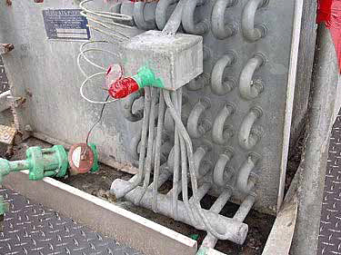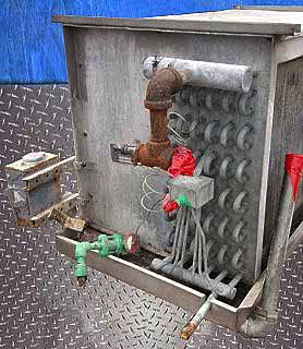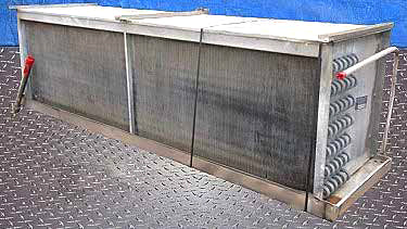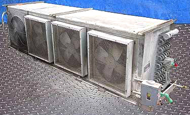 Rigidbilt Inc. 4-Fan Ammonia Evaporator. Model: UC4-420XA. S/N: 29862. Nominal capacity: 5 tons. Internal volume: 7.69 gal. Nominal fin spacing: 4 fpi. (4) General Electric fan motors, 1/3 hp, 1723 rpm, 230 V, 2.5 amps, 60 Hz, single phase. Fan diameter: 20 in. Inlets: (1) 3/4 in. dia. refrigerant infeed. Outlets: (1) 1 in. suction discharge. Overall dimensions: 10 ft. L x 2 ft. 11 in. W x 2 ft. 9-1/2 in. H.