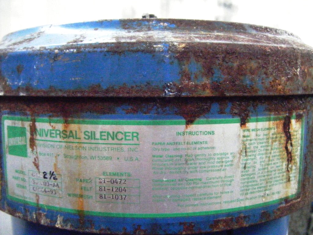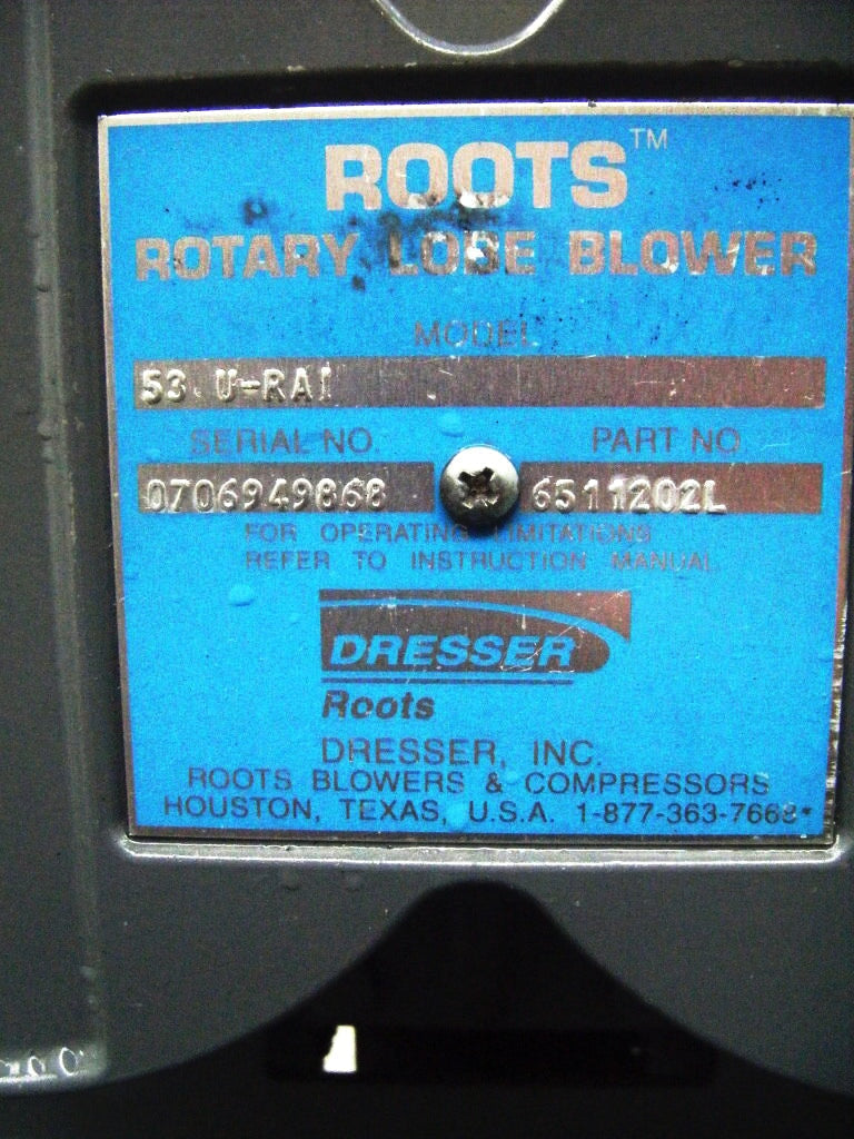 Roots Rotary Lobe Blower. Model: 53-U-RAI. S/N: 0706949868. Displacement for new blower is 186 cfm with required horsepower and pressure. Roots Universal RAI blower series is heavy-duty rotary-lobe blowers in compact, sturdy designs engineered for continues and maximum reliability. Universal silencer model: CCS-2-1/2. S/N: C1864-93. Leeson motor, 5 hp, 1725 rpm, 230/460 V, 13.2/6.6 amps, 60 Hz, 3 phase. Driver pulley diameter: 4 in. Driven pulley diameter: 6-5/8 in. Ratio: 1.65:1. Final rpm: 1042. Overall dimensions: 4 ft. 2 in. L x 2 ft. 6 in. W x 3 ft. 9 in. H. (ACN30a)