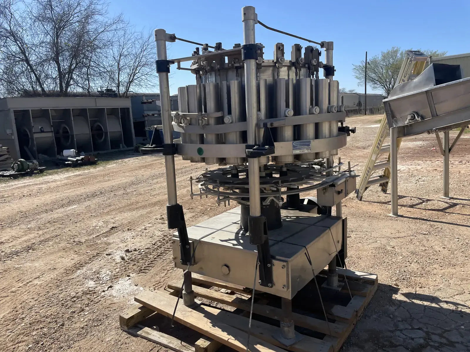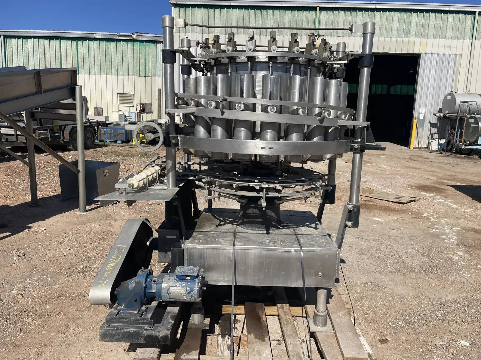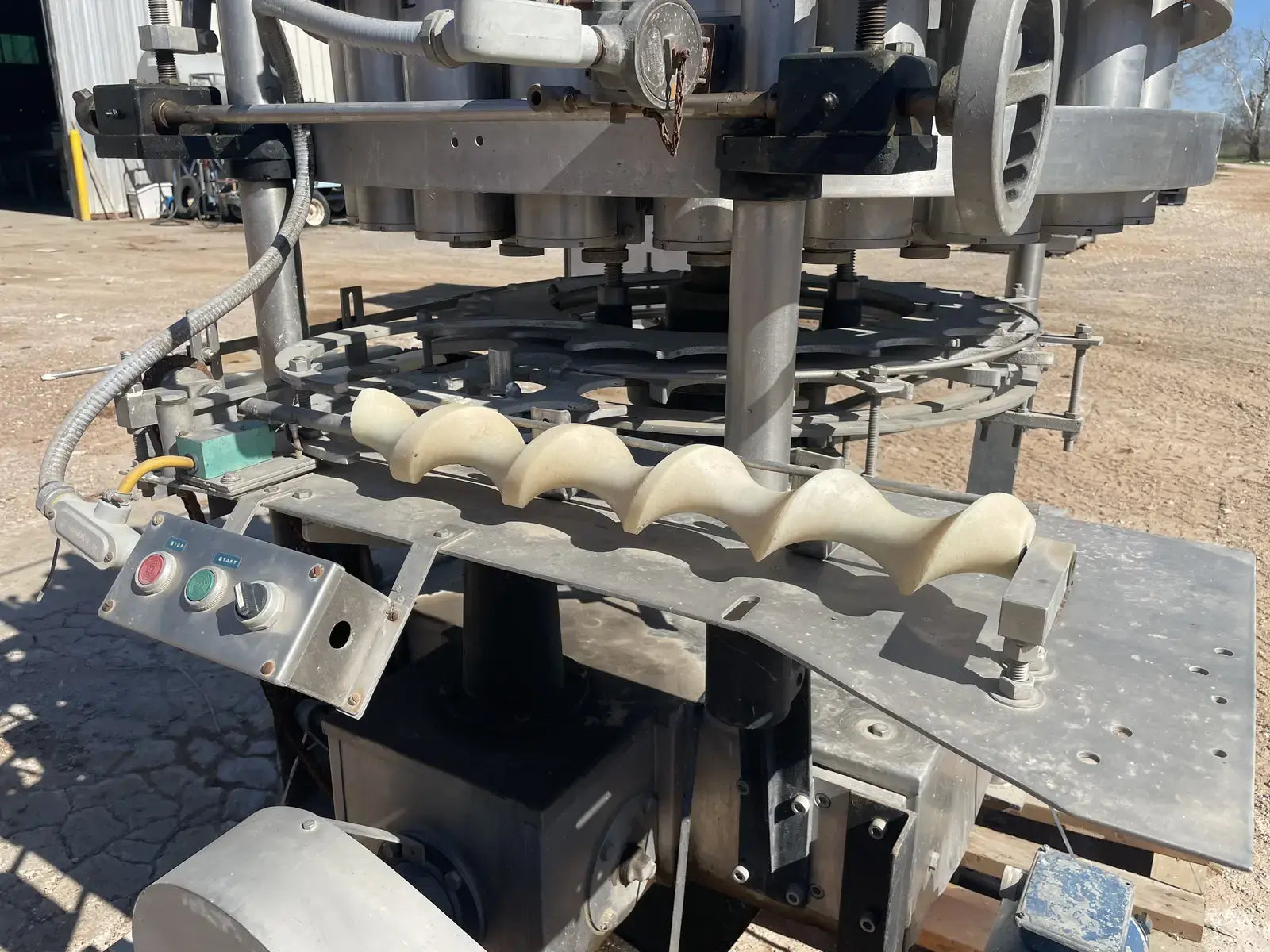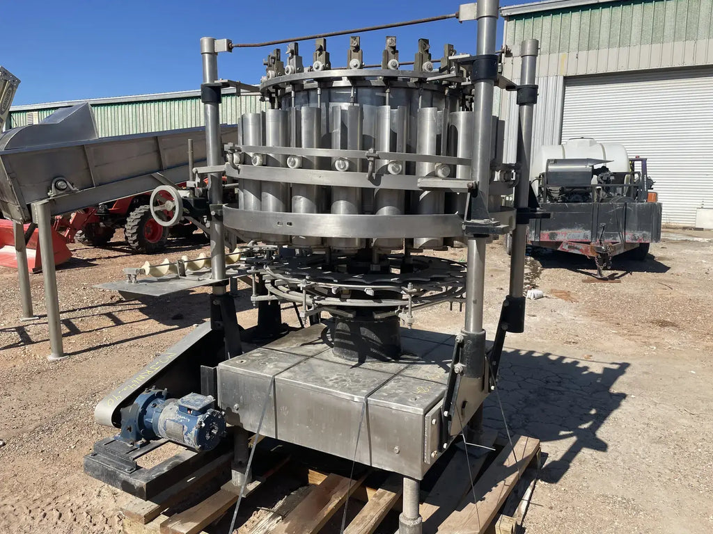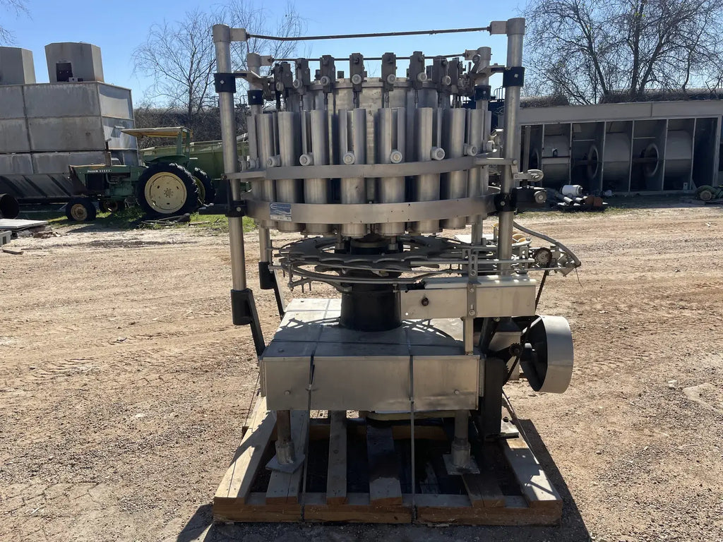 Rotary Piston Filler- 21 Valve. Model P-21-L. Fill ports: 1 in. Centers between valves: 5-1/4 in. Celeron change parts set for 3-3/4 in. dia. bottle x 5-1/4 in. H. 3-3/4 in. dia. pistons x 8 in. stroke. Conveyor to worm to star infeed (worm & drive, and star); counter-clockwise rotation; 90 degree discharge. Infeed starwheel has 6 pockets. Pocket diameter: 4.625 in. Distance between pockets: 7.375 in. Star diameter: 11.375 in. Stainless steel product contacts. (XMR108).