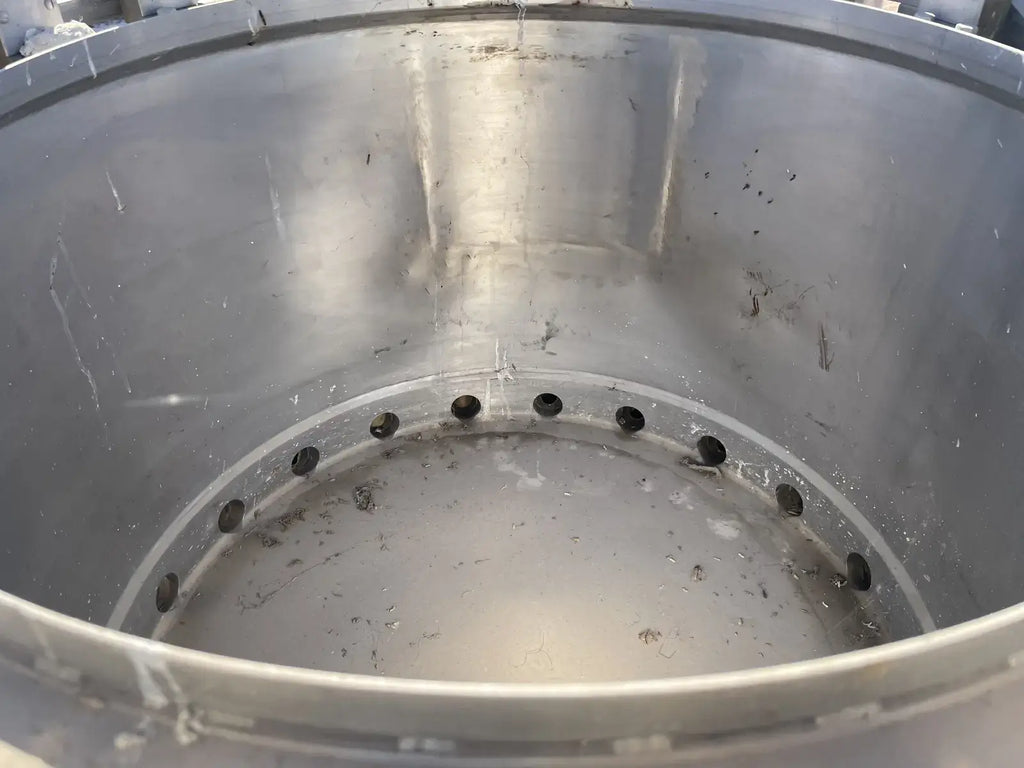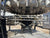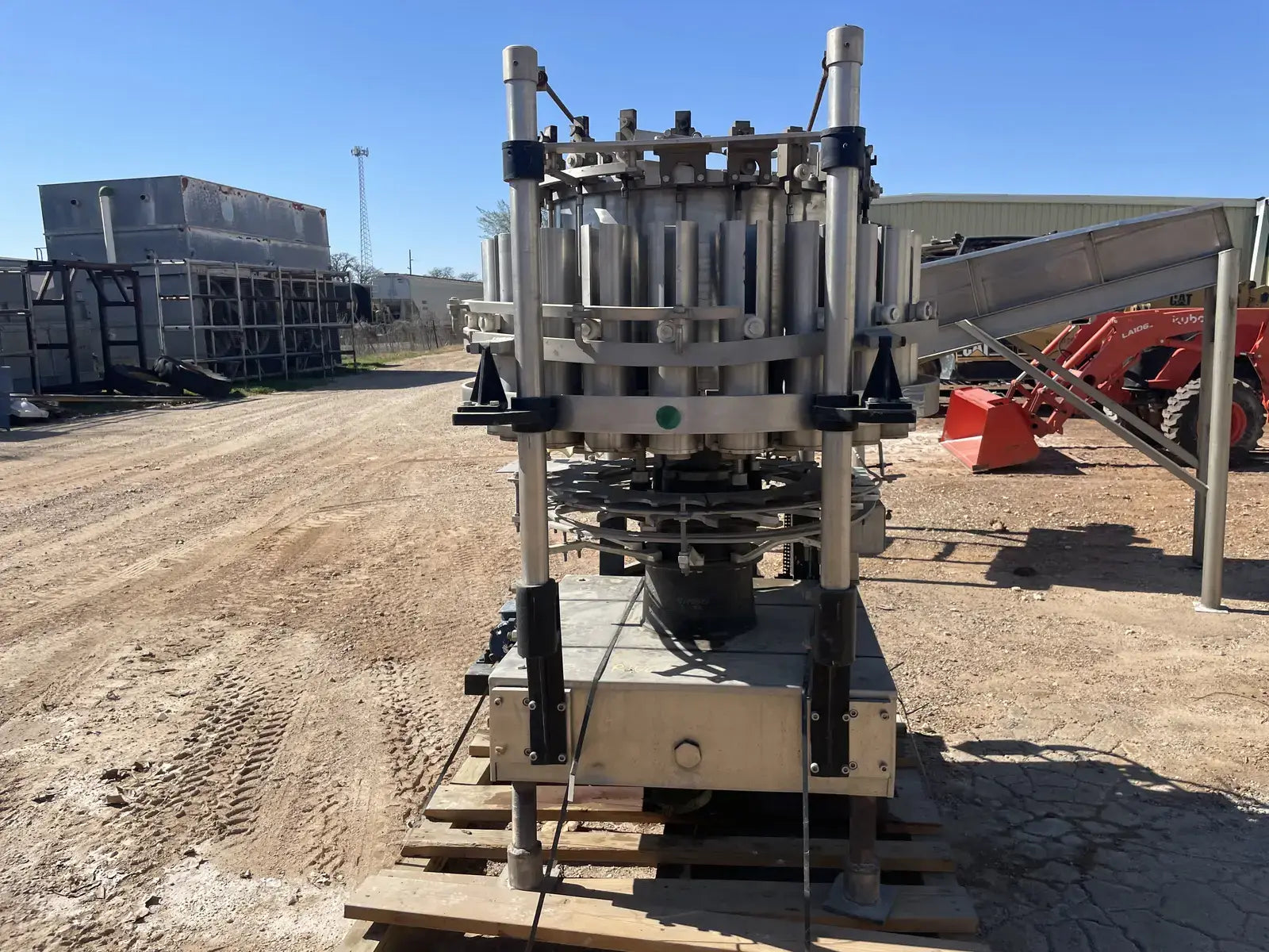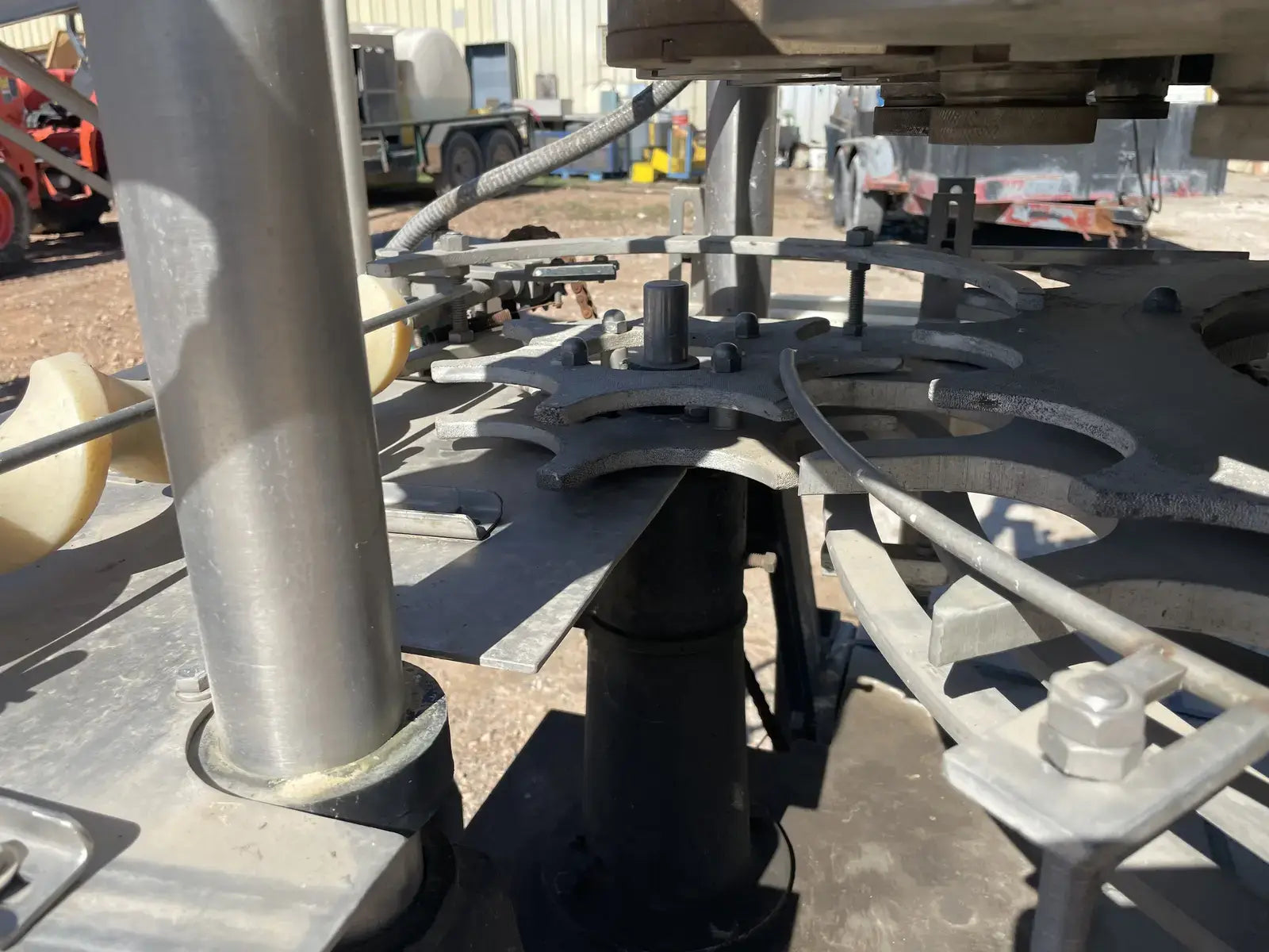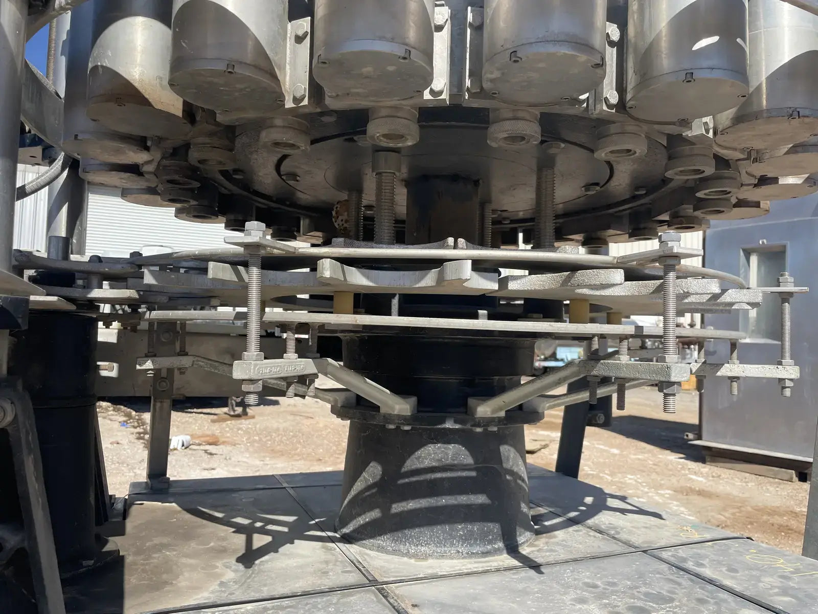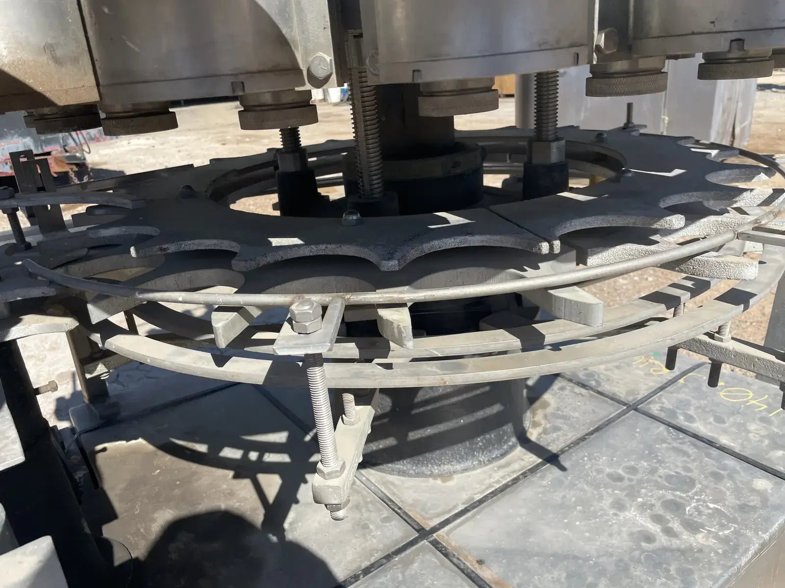 Rotary Piston Filler- 21 Valve. Model P-21-L. Fill ports: 1 in. Centers between valves: 5-1/4 in. Celeron change parts set for 3-3/4 in. dia. bottle x 5-1/4 in. H. 3-3/4 in. dia. pistons x 8 in. stroke. Conveyor to worm to star infeed (worm & drive, and star); counter-clockwise rotation; 90 degree discharge. Infeed starwheel has 6 pockets. Pocket diameter: 4.625 in. Distance between pockets: 7.375 in. Star diameter: 11.375 in. Stainless steel product contacts. (XMR108).