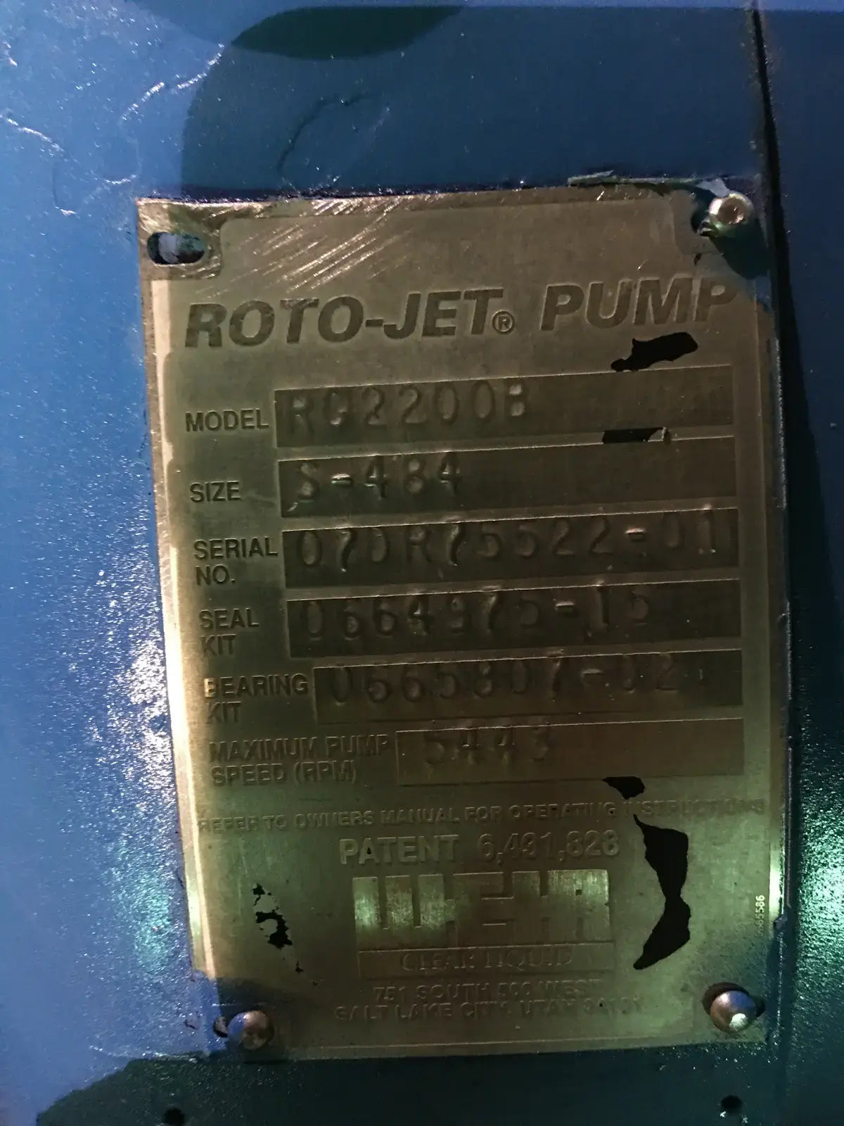 Roto-Jet High Pressure Pilot Tube Pump - Model: RG2200B, Size: S-484, Serial No: 070R75522-01, Seal Kit: 0664975-15, Bearing Kit: 0665807-02, Maximum Pump Speed: 5443 RPM. Maximum Temperature: 180F, Maximum Suction Pressure: 200 PSI. Maximum Head: 2600 Ft. Maximum Speed: 4380 RPM, Maximum Flow: 400 GPM. Pump is Ductile Iron driven by 200 HP Motor belt driven. Unit has been repainted.  Worldwide Industrial Electric Motor - Model: WWE200 8-44, Serial No: 10071 G.F.J.  HP: 200, Encl: -C, IP: 54, FR: 445/7T, Voltage: 230/460, Amps: 446/223, HZ: 60, RPM: 1786, Type: BJHE, S.F: 1.15, Rating: 40c Amb Cont, Usable on 208v Network at 493 Amps. Skid mounted. OD = 63 x 63 x 42