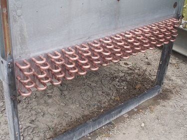 Russell Air Cooled Condenser. Model: VAC-55. Approximate Capacity: 40 tons. Refrigerant: R22, water, glycol. Airflow: 31000 cfm. Design pressure: 380 psig. Number of fans: 3. Fan diameter: 2 ft. 5 in. dia. (3) Marathon Electric Motors, 1-1/2 hp, 1140 rpm, 208-230/460 V, 5.45-5.4/2.7 amps, 60 Hz, 3 phase. Inlets: (1) 2 in. dia. port. Outlets: (1) 1 in. dia. port. Overall dimensions: 13 ft. 9 in. L x 4 ft. W x 3 ft. 8 in. H.
