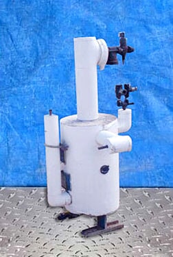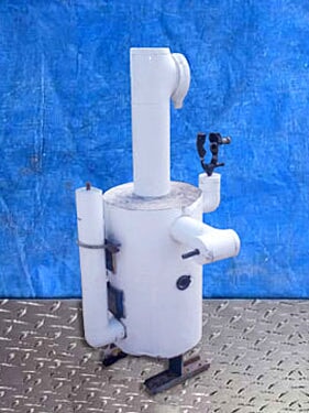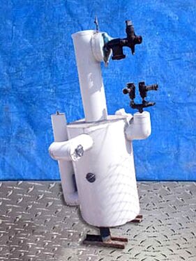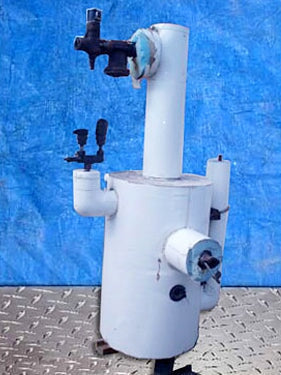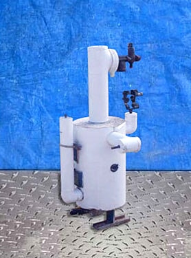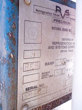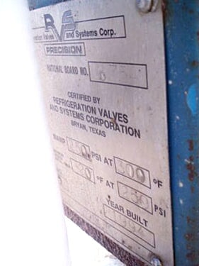 1994 Refrigeration Valves & Systems Vertical Receiver- 18 Gallon. S/N: 94407. Nat'l Bd: 6754. Inside straight-wall dimensions: 12-3/4 in. dia. x 2 ft. 8 in. H. MAWP: 250 psi @ 300ºF. MDMT: -20ºF @ 250 psi. Inlets: (1) 1/2 in. dia. port, (1) 1 in. dia. port. Outlets: (1) 1/2 in. dia. port, (1) 1 in. dia. drain port, (2) 1 in. dia. ports (relief) (1) 1-1/2 in. dia. port. Overall dimensions: 3 ft. 7 in. L x 3 ft. 4 in. W x 6 ft. 4 in. H. (BI)