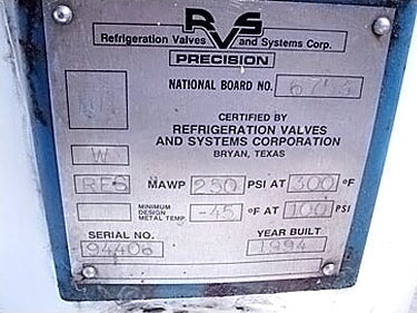 1994 Refrigeration Valves & Systems Vertical Receiver- 18 Gallon. S/N: 94406. Nat'l Bd: 6753. Inside straight-wall dimensions: 12-3/4 in. dia. x 2 ft. 8 in. H. MAWP: 250 psi @ 300ºF. MDMT: -45ºF @ 100 psi. Inlets: (1) 1/2 in. dia. port, (1) 3/4 in. dia. port. Outlets: (1) 1-1/2 in. dia. port (relief), (1) 1 in. dia. drain port, (1) 1/2 in. dia. port, (1) 1-1/2 in. dia. port. Overall dimensions: 4 ft. L x 3 ft. 4 in. W x 5 ft. 1-1/2 in. H.(HB2).