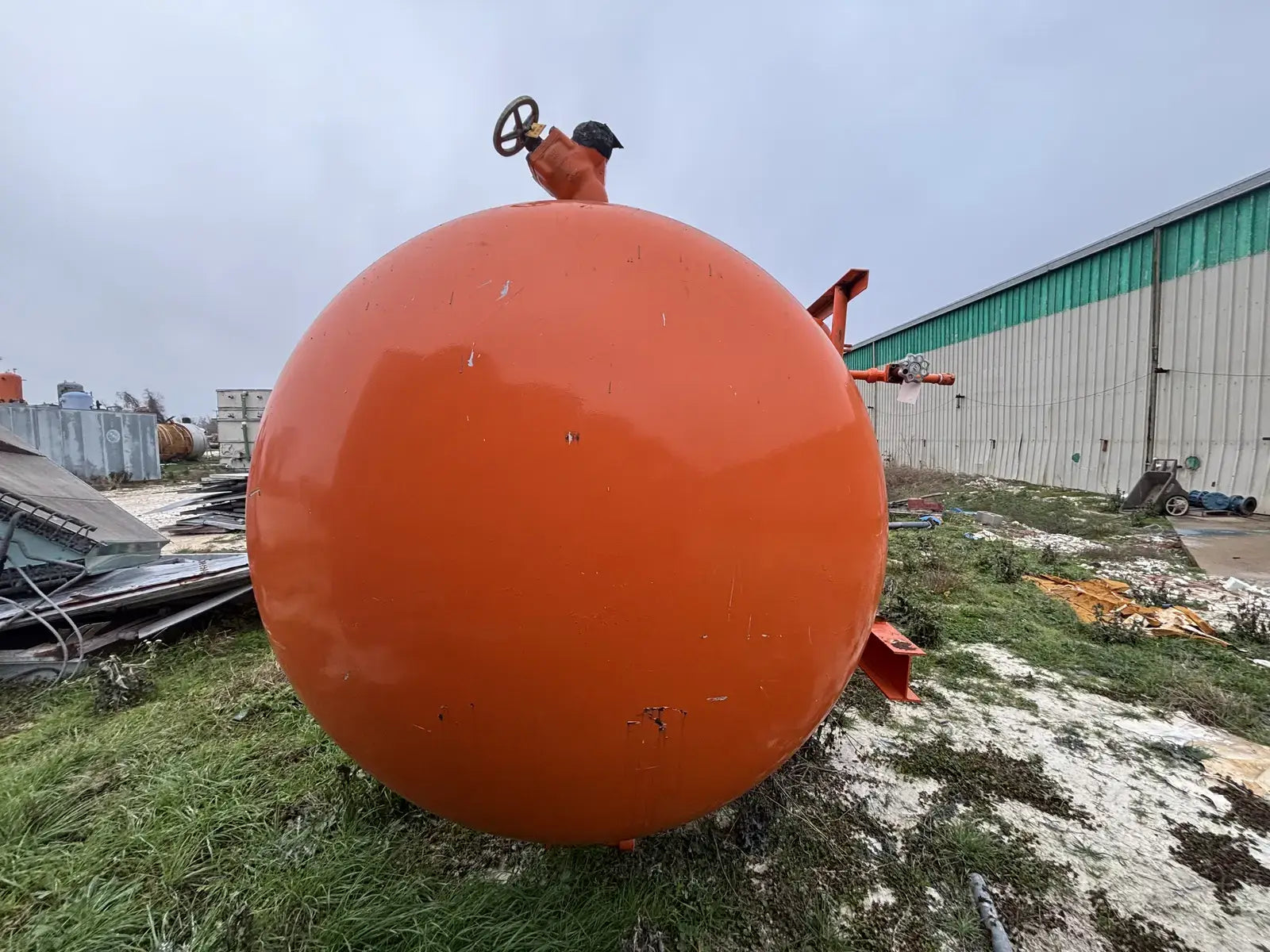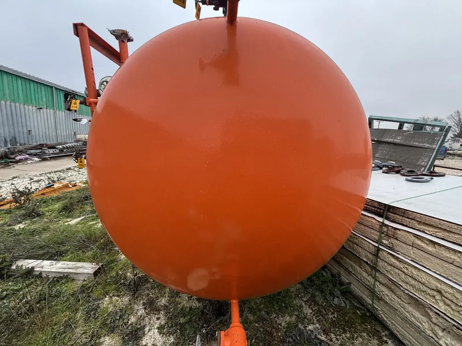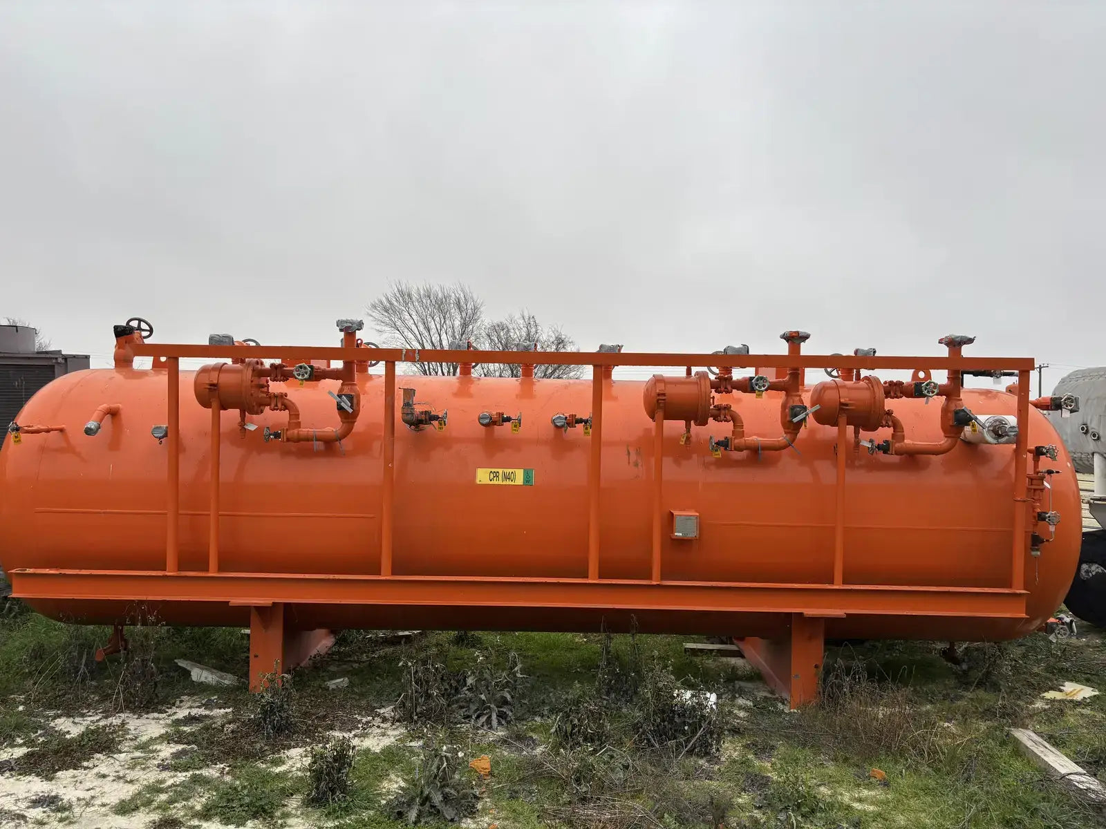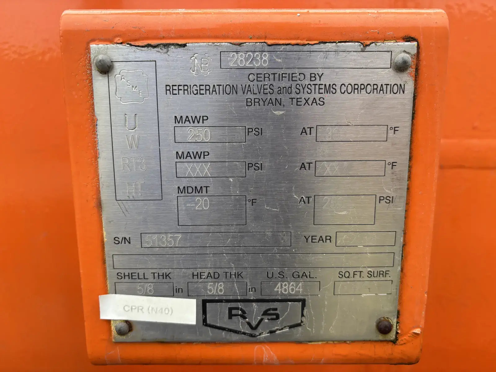 Certified by Refrigeration Valves & Systems Corporation Bryan, Tx. Serial No: 51357. National Board: 28238. Capacity: 4864 Gallons. MAWP: 250 PSI @ 300 F. MDMT: -20 F @ 250 PSI. Shell Thickness: 5/8 in. Head Thickness: 5/8 in.