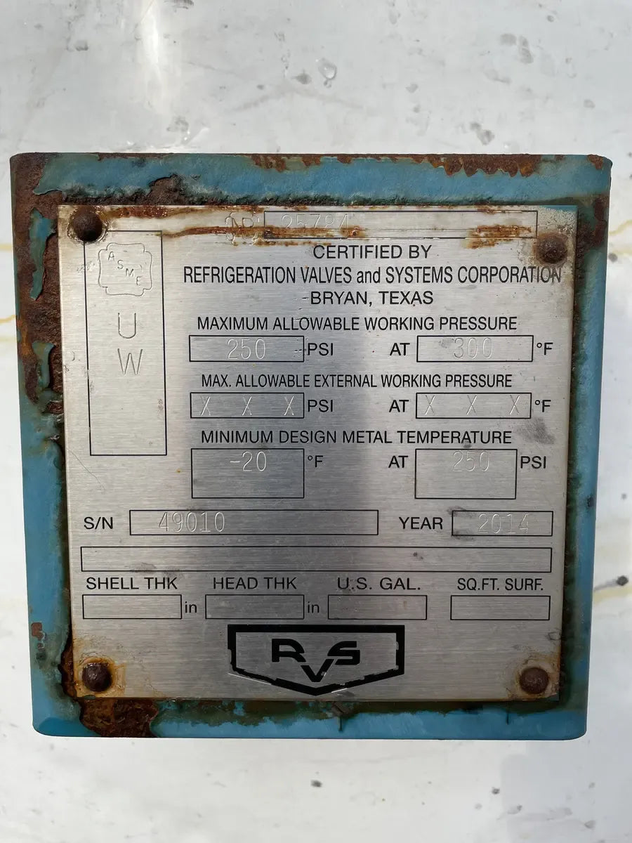 RVS Inc. Vertical Ammonia Receiver ( in x in. Gallons) Serial Number: 49010. Tank National Board Number. Tank Estimated Capacity (Gallons). Tank MAWP (PSI @ Temp): 250 PSI @ 300 F. Tank MAWT (PSI @ Temp): -20 F @ 250 PSI. Previous Refrigerant was Ammonia (R717 | NH3). Manufactured in 2014. Shipping Dimensions (Inches): 41x 41 x 98. 2000 LB