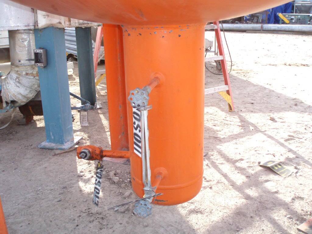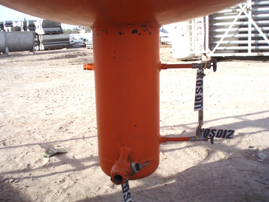 1995 RVS Oil Scrubber Tank. Refrigerant: R-717 (Ammonia). Approximate capacity: 1,165 gallons. Inside straight wall dimension: 60 in. dia. x 7 ft. 2 in. H. MAWP: 250 psi at 300ºF. MDMT: -20ºF at 250 PSI. Radius: 2:1 elliptical ends. Inlets: (1) 3/4 in. dia. port, (1) 8 in. dia. port, (1) 2 1/2 in. dia. port. Outlets: (1) 1in. dia. port, (1) 3/4 in. dia. port, (1) 8in dia. port. Overall dimensions: 6 ft. 5 in. L x 6 ft. 5 in. W x 17 ft. 5 in. H.