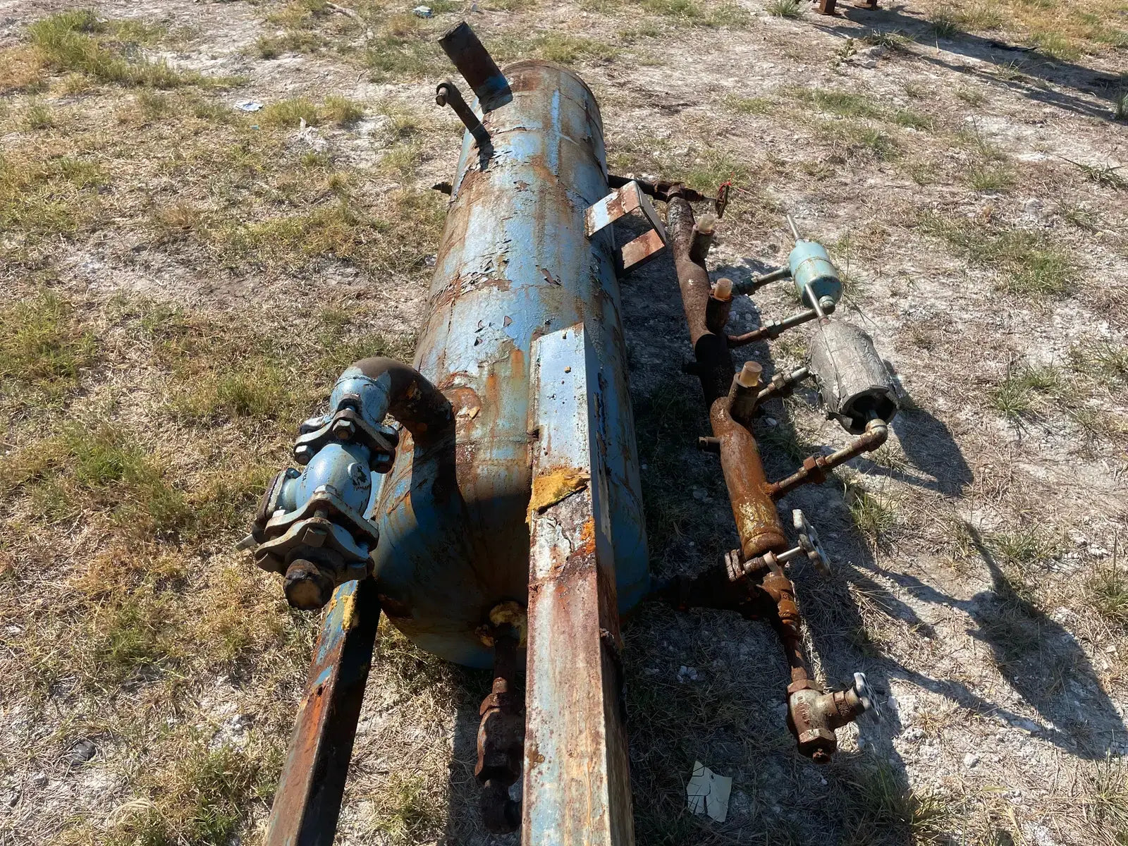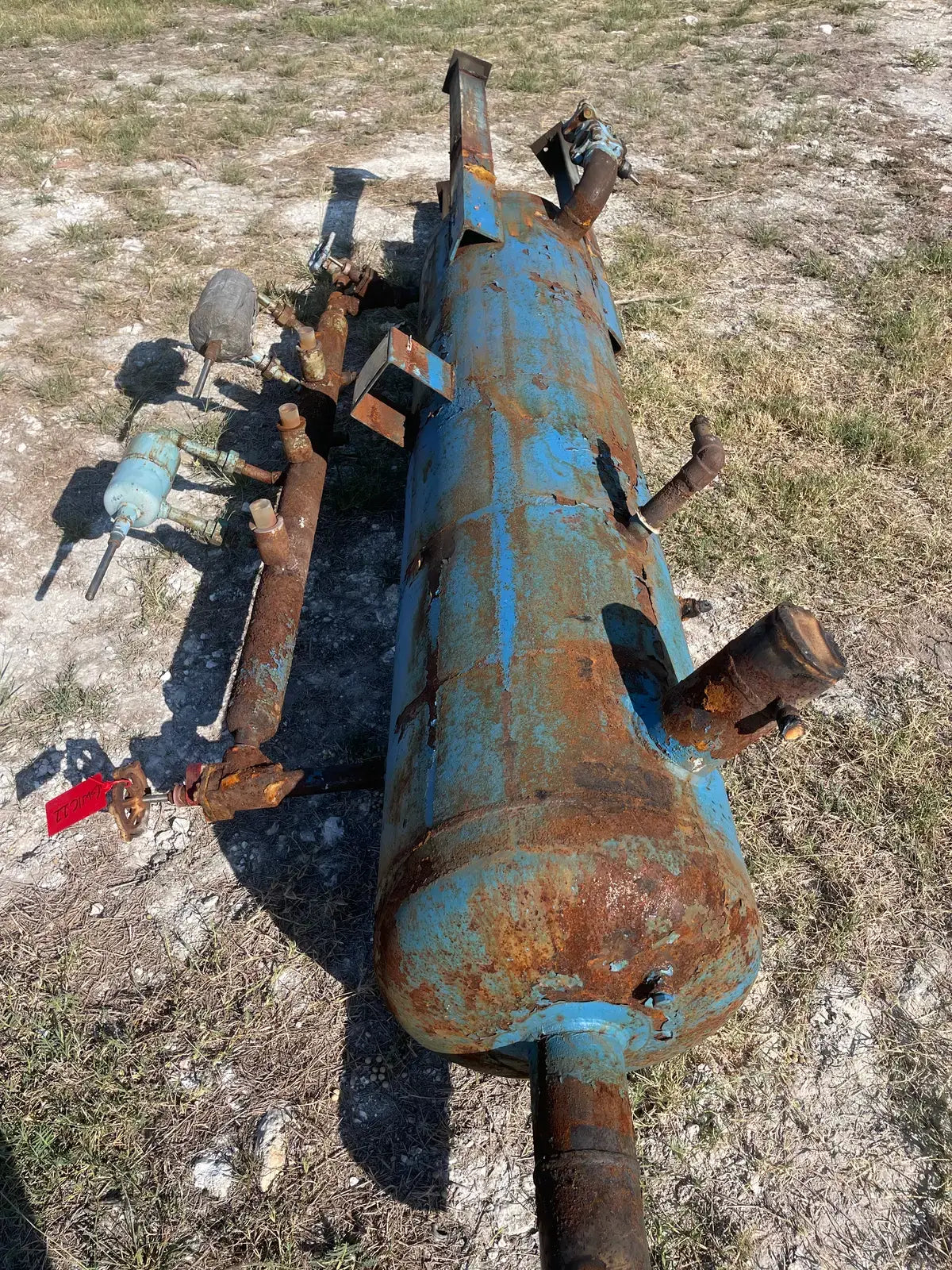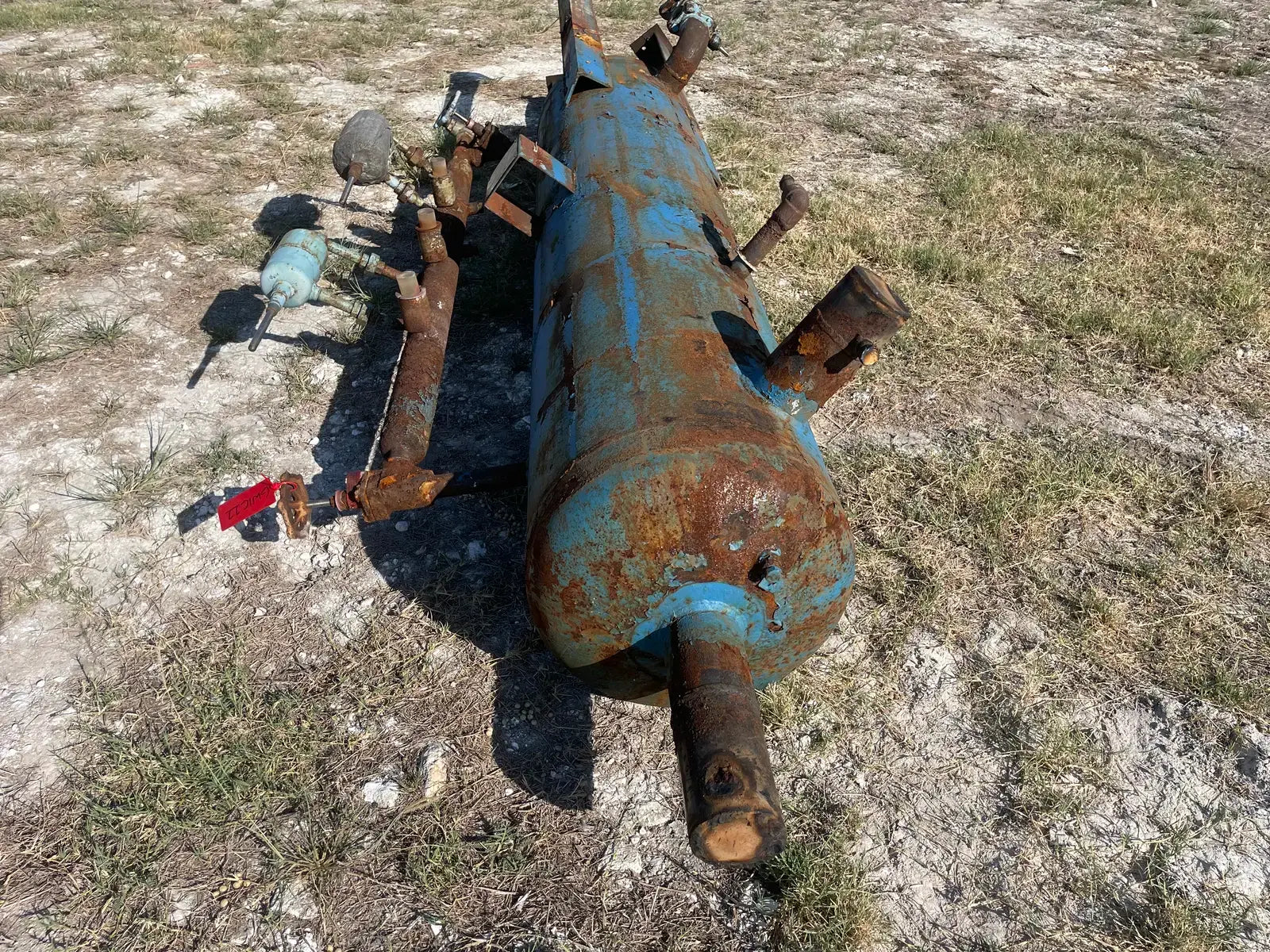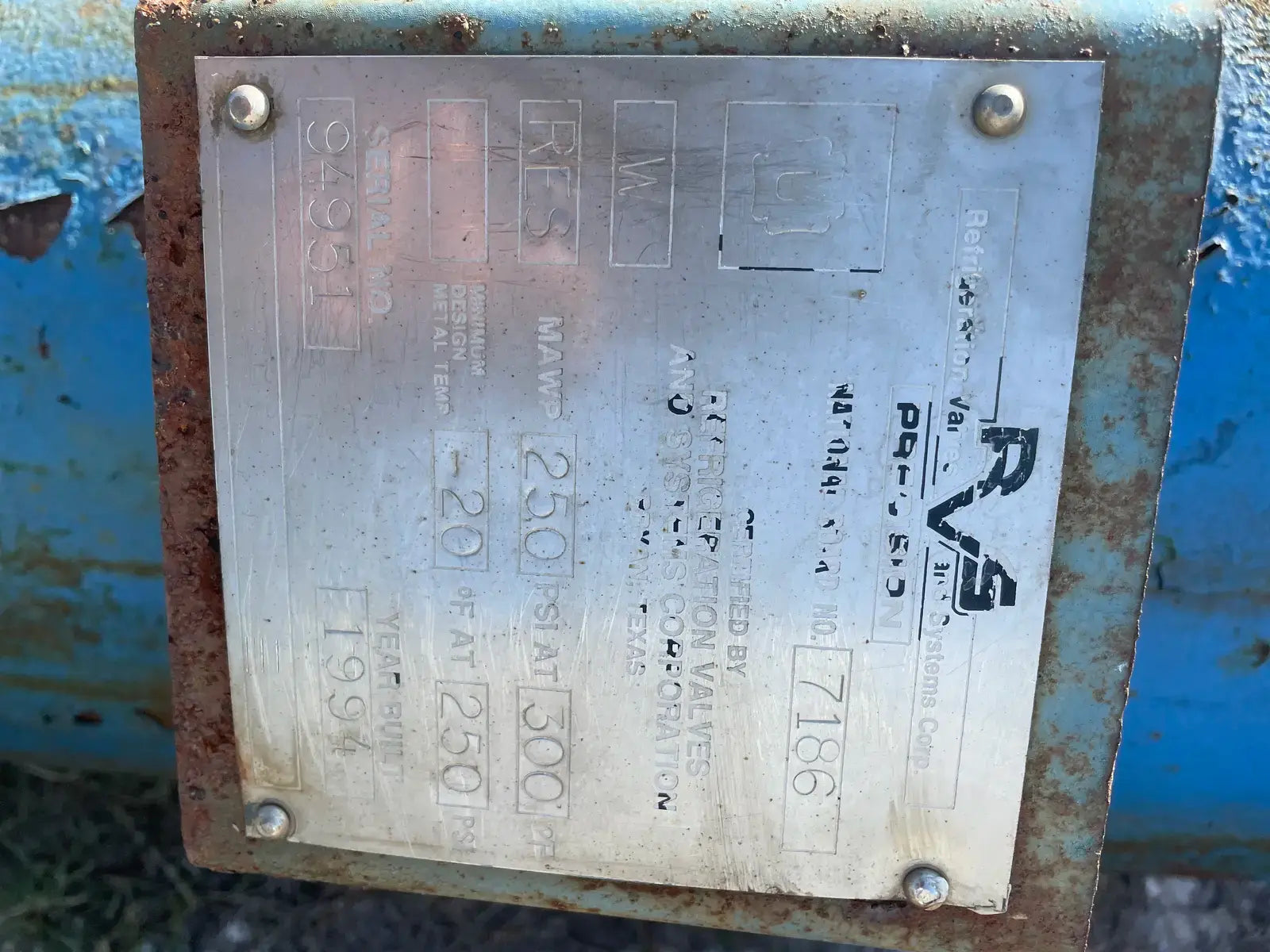 Certified by RVS Vertical Receiver. Serial No: 94951. National Board: 7186. MAWP: 250 PSI @ 300 F. MDMT: -20 F @ 250 PSI. Year Built: 1994. Estimated Vessel Dimensions: 20 in X 84 in. Estimated Gallons: 140 Gallons.
