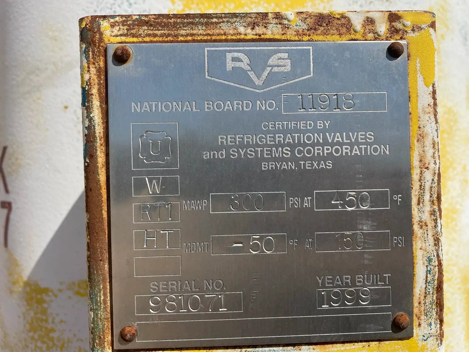 Certified by Refrigeration Valves and Systems Corporation Vertical Ammonia Receiver. National Board: 11918. Serial No: 981071. Year Built: 1999. MAWP: 300 PSI @ 450 F. MDMT: -50 F @ 150 PSI.
