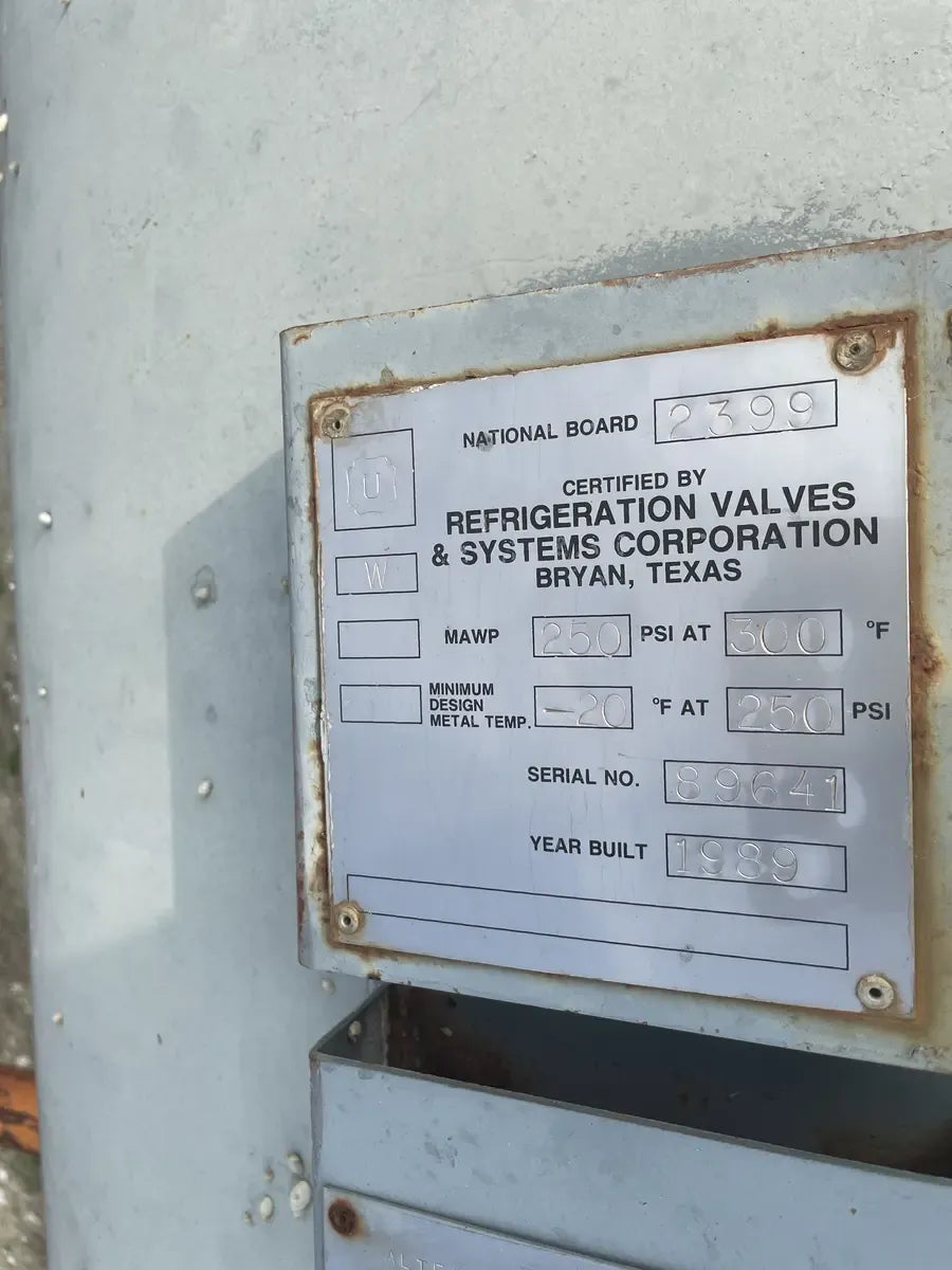 RVS Vertical Ammonia Receiver ( 48in x 118in. 935 Gallons) Serial Number: 89641. Tank National Board Number: 2399. Tank Estimated Capacity (Gallons): 935. Tank MAWP (PSI @ Temp): 250 PSI @ 300F. Tank MAWT (PSI @ Temp): -20F @ 250 PSI. Previous Refrigerant was Ammonia (R717 | NH3). Manufactured in 1989. Shipping Dimensions (Inches): 78 x 78 x 147. 4000 LB