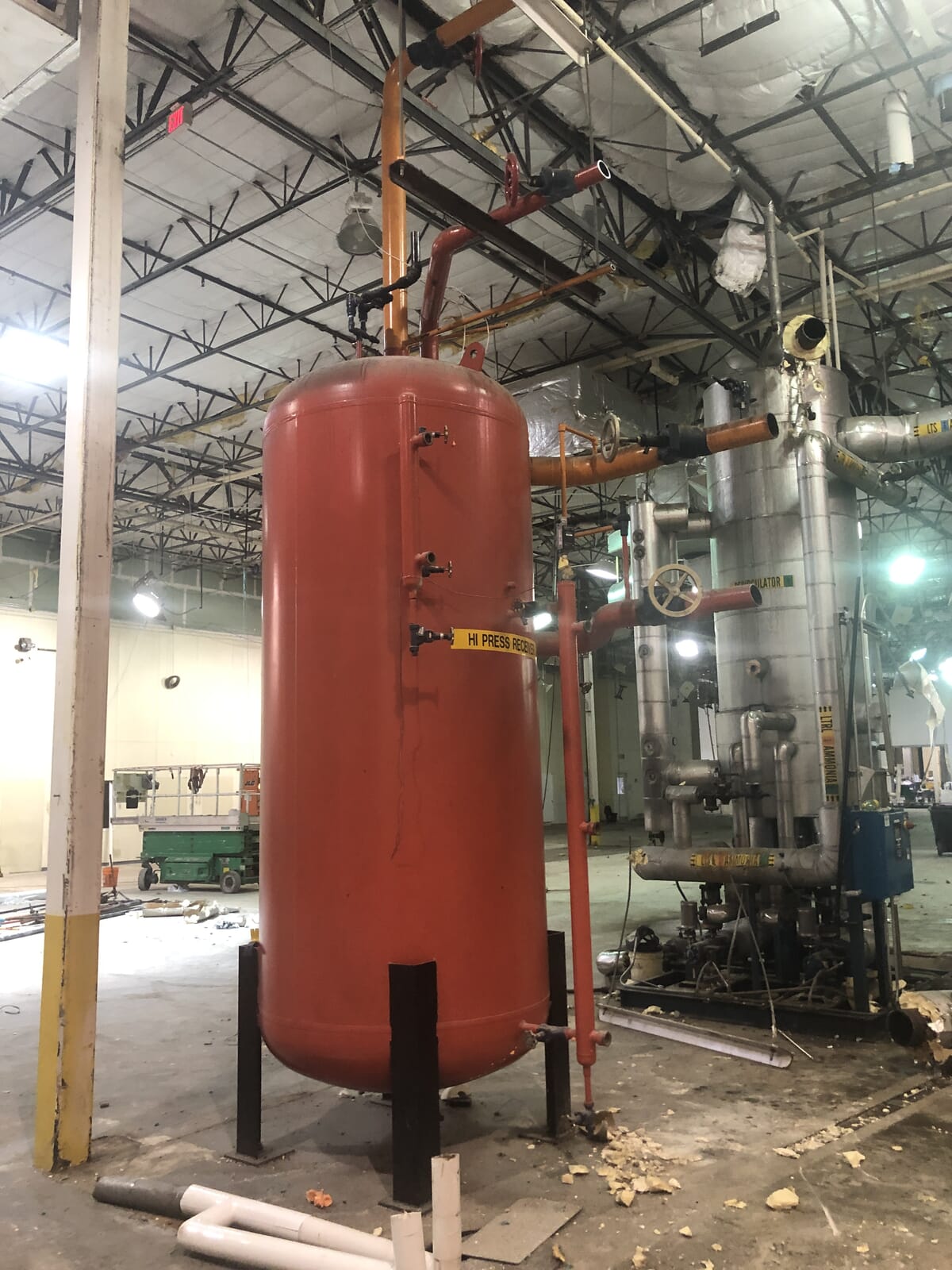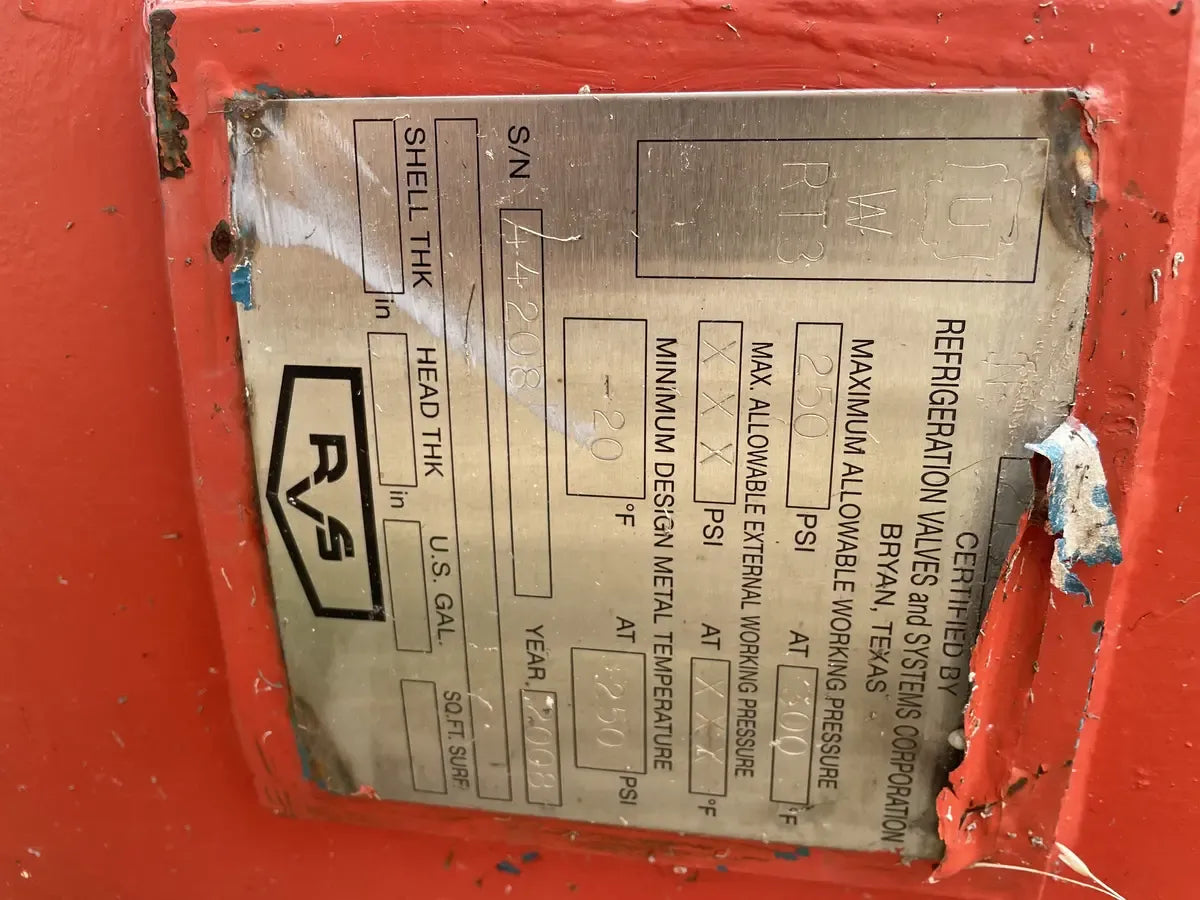 RVS Vertical Ammonia Receiver ( 55in x 216 in. Gallons) Serial Number: 44208. Tank National Board Number: WRT3. Tank Estimated Capacity (Gallons). Tank MAWP (PSI @ Temp): 250 PSI @ 300 F. Tank MAWT (PSI @ Temp): -20F @ 250 PSI. Previous Refrigerant was Ammonia (R717 | NH3). Manufactured in 2008. Shipping Dimensions (Inches): 216 x 96 x 216. LB