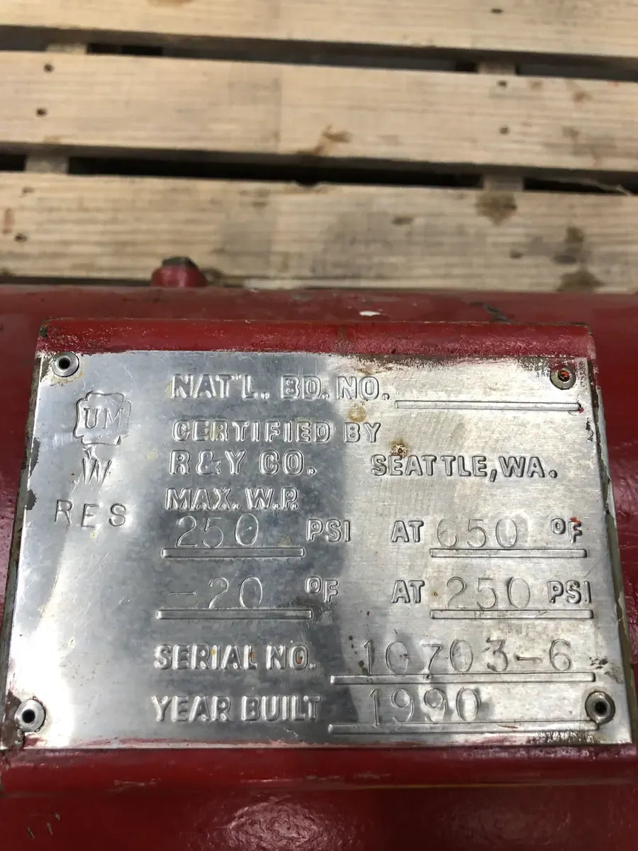 R&Y Horizontal Oil Separator (10in x 32in. 15 Gallons) Serial Number: 10703-6. Tank National Board Number. Tank Estimated Capacity (Gallons): 15. Tank MAWP (PSI @ Temp): 250 PSI @ 650F. Tank MAWT (PSI @ Temp): -20F @ 250 PSI. Previous Refrigerant was Ammonia (R717 | NH3). Shipping Dimensions (Inches): 34 x 11 x 18. 320 LB