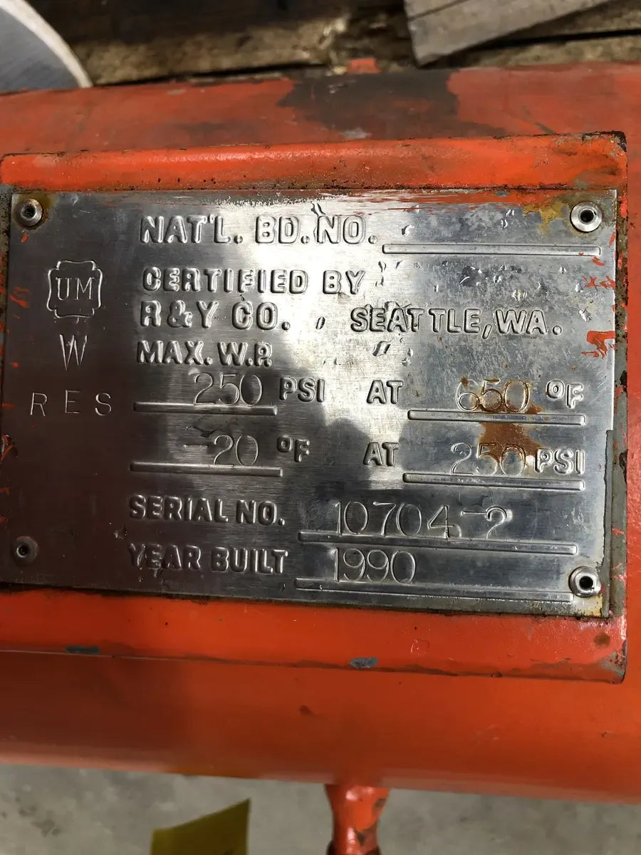 R&Y Horizontal Oil Separator (12in x 32in. 15 Gallons) Serial Number: 10704-2. Tank National Board Number. Tank Estimated Capacity (Gallons): 15. Tank MAWP (PSI @ Temp): 250 PSI @ 650F. Tank MAWT (PSI @ Temp): -20F @ 250 PSI. Previous Refrigerant was Ammonia (R717 | NH3). Manufactured in 1990. Shipping Dimensions (Inches): 48 x 27 x 23. 185 LB