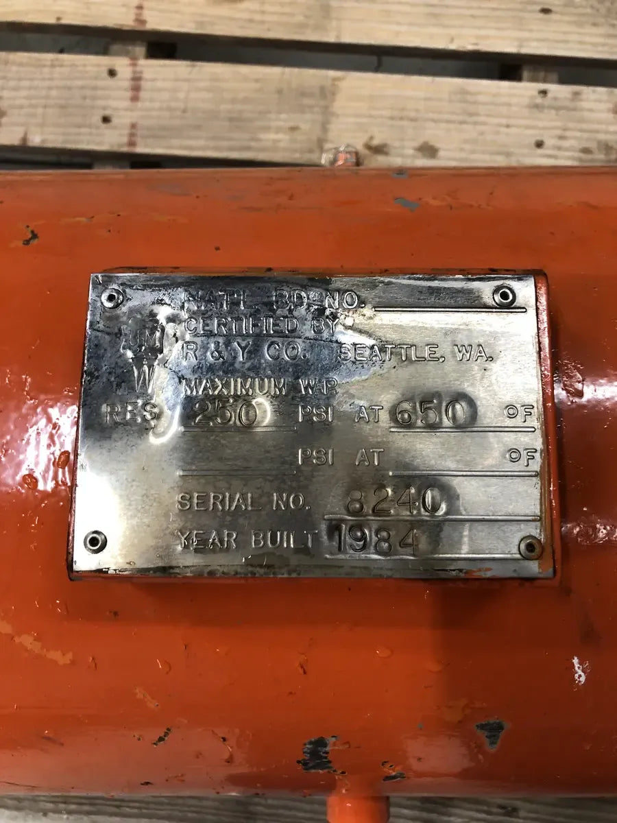 R&Y Horizontal Oil Separator (13in x 37in. 20 Gallons) Serial Number: 8240. Tank National Board Number. Tank Estimated Capacity (Gallons): 20. Tank MAWP (PSI @ Temp): 250 PSI @ 650F. Tank MAWT (PSI @ Temp). Previous Refrigerant was Ammonia (R717 | NH3). Shipping Dimensions (Inches): 37 x 13 x 19. 320 LB