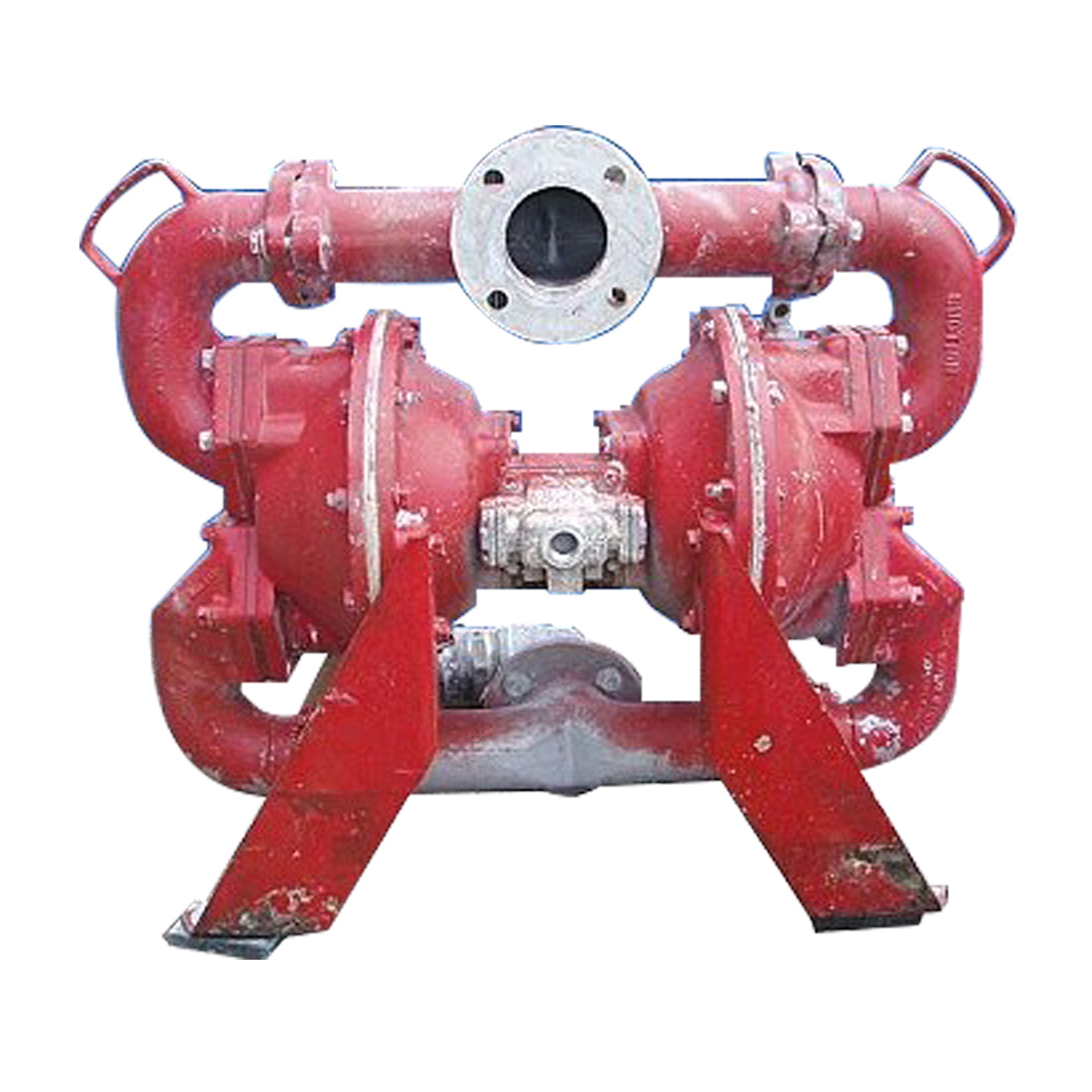 Sandpiper Air Operated Diaphragm Pump. Model: SA3-A. Nominal capacity: 260 gpm @ 125 psi. Displacement per stroke: 1.62 gal. Aluminum construction. Maximum diameter solids handling: up to 3 in. SA series pumps are designed for slurries and liquids with suspended solids. The equipped flap valves allow passage of entrained line-size solids without damage. Inlets: (1) 3/4 in. dia. NPT (female, air), (1) 3/4 in. dia. NPT (female, air exhaust), (1) 3 in. dia. port with a 7-1/2 in. dia. flange and (4) 3/4 in. dia. attachment holes at a distance of 4-1/2 in. Outlets: (1) 3 in. dia. port with a 7-1/2 in. dia. flange and (4) 3/4 in. dia. attachment holes at a distance of 4-1/2 in. Overall dimensions: 3ft. 1 in. L x 1ft. 5 in. W x 2ft. 6 in. H.(ACN31a). (GK).