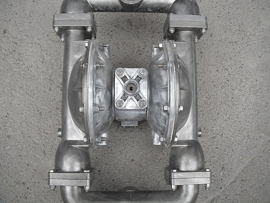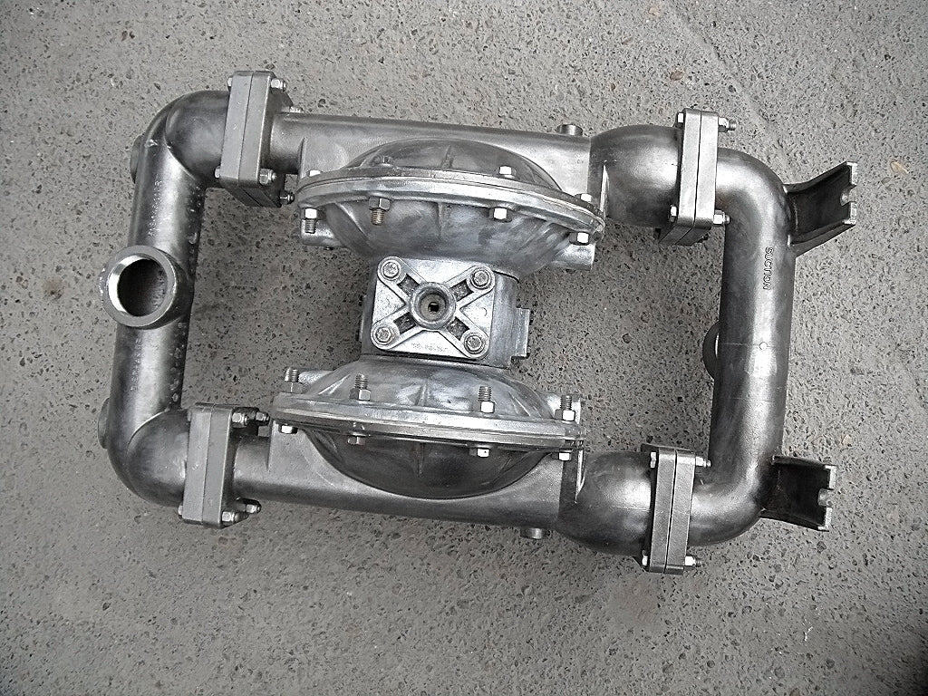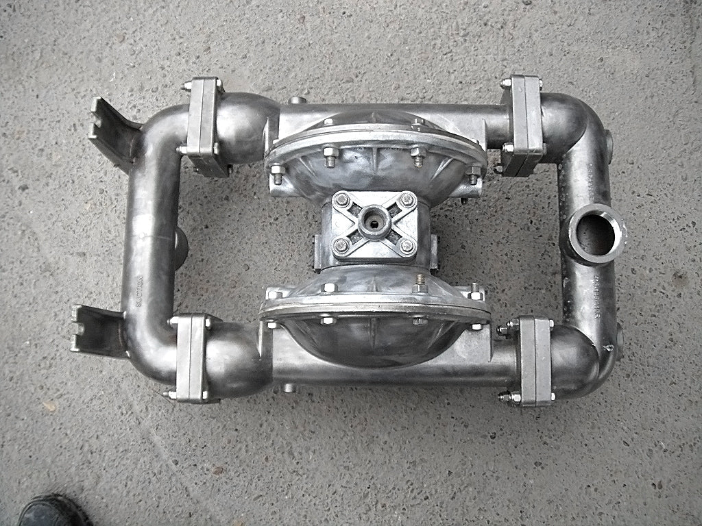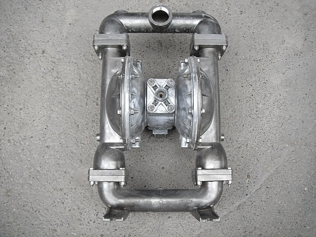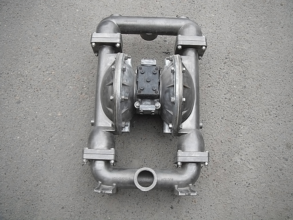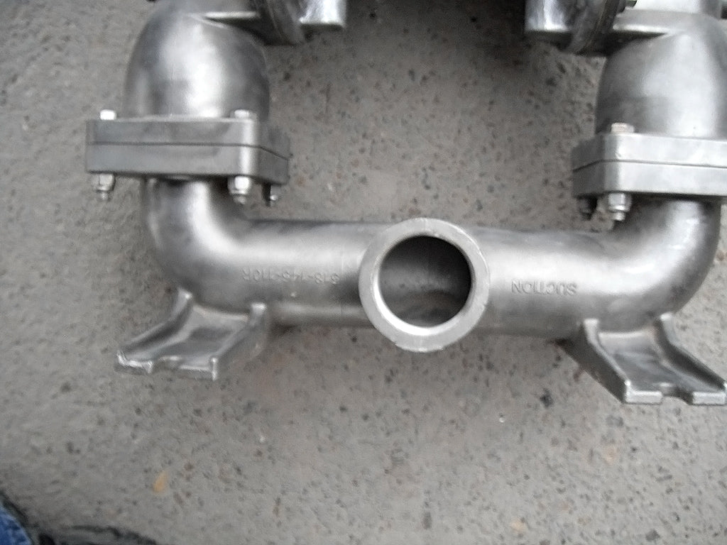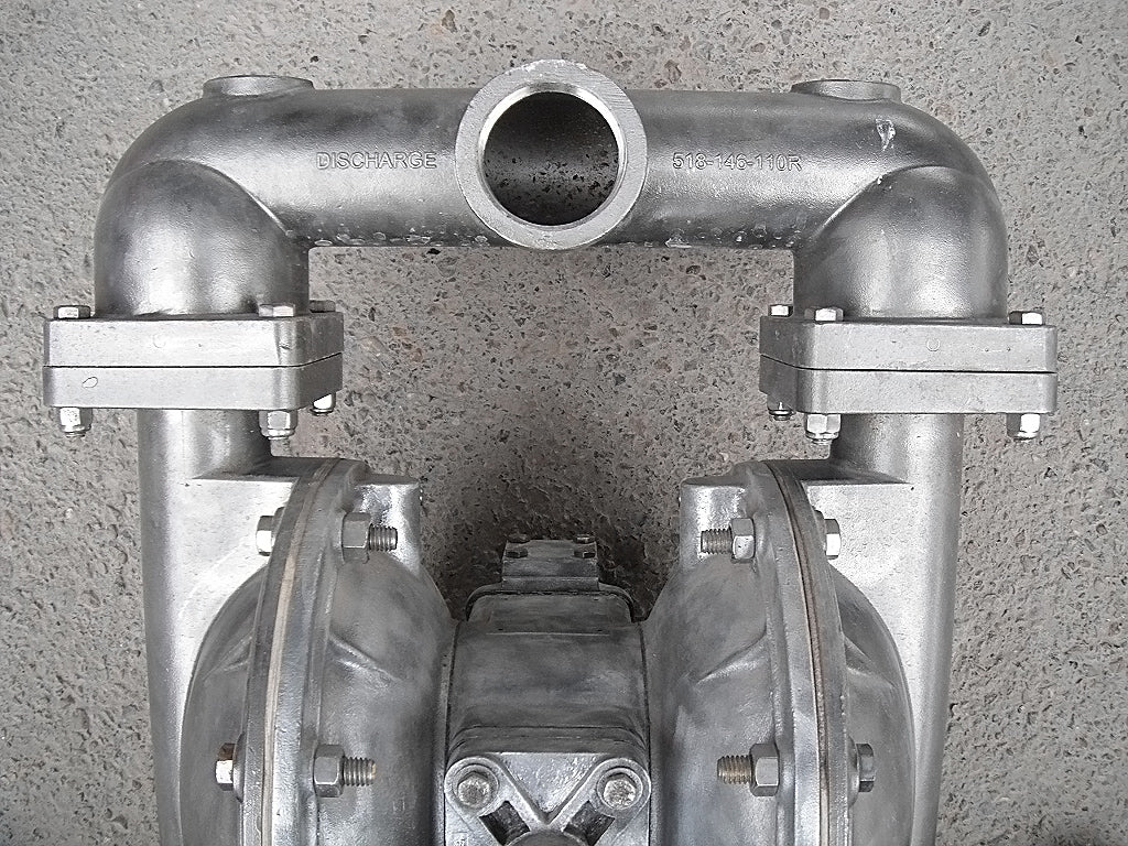 Sandpiper Double Diaphragm Stainless Steel Pump, 2 in., Pneumatic Powered. This appears to be a G20 Metallic design level 1 ball valve unit. Nameplate missing. The G20 has these specs: .42 gallon displacement, 150 GPM max flow, 0.25 inch solids handling, and max discharge of 100 PSI. (ACN49)