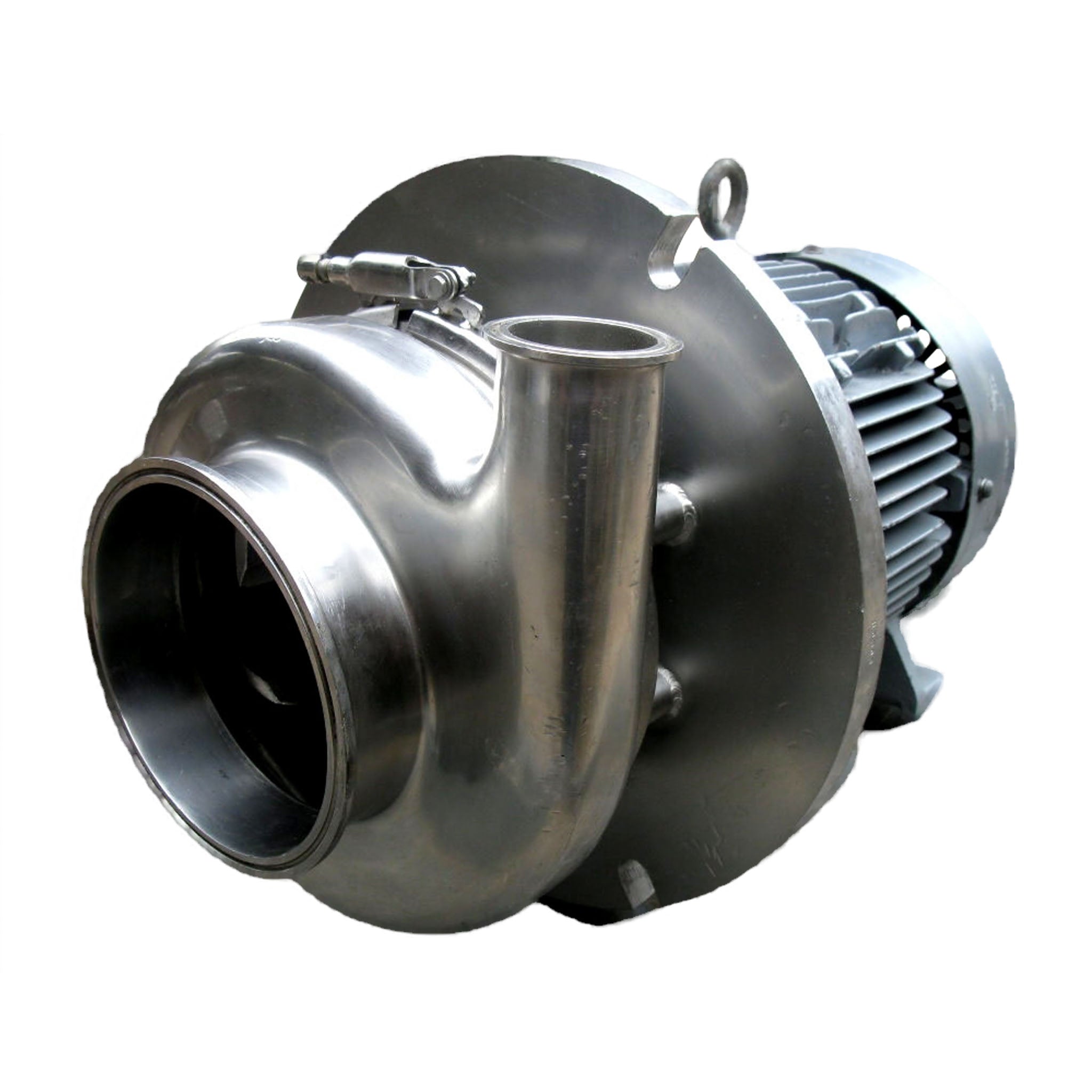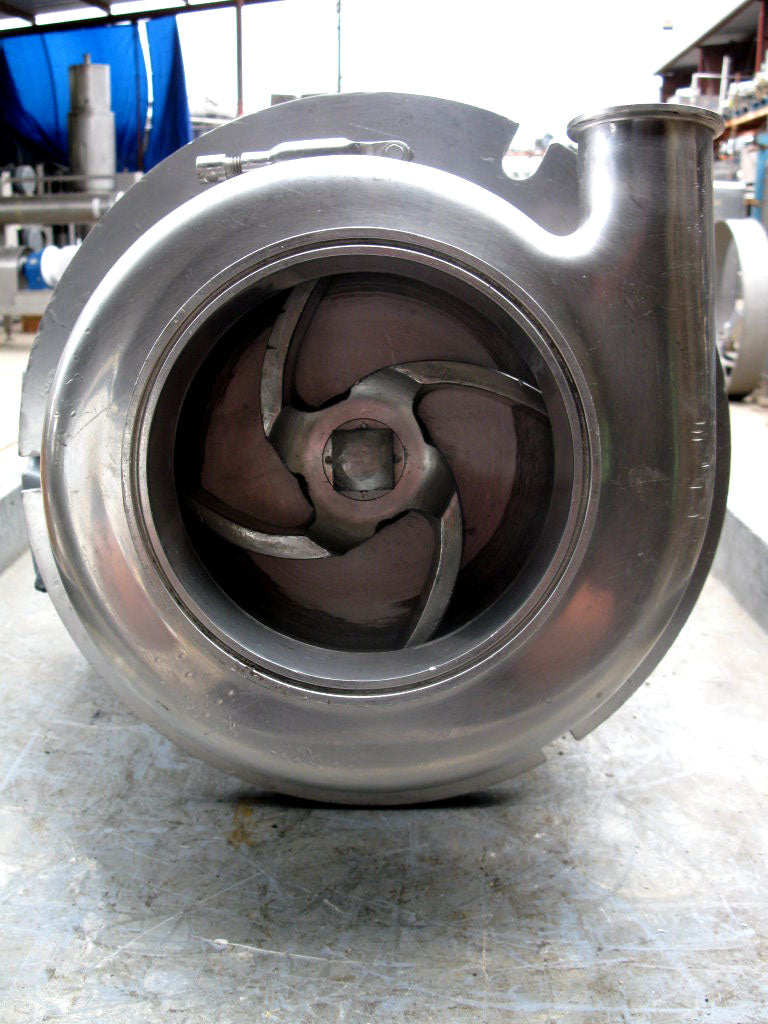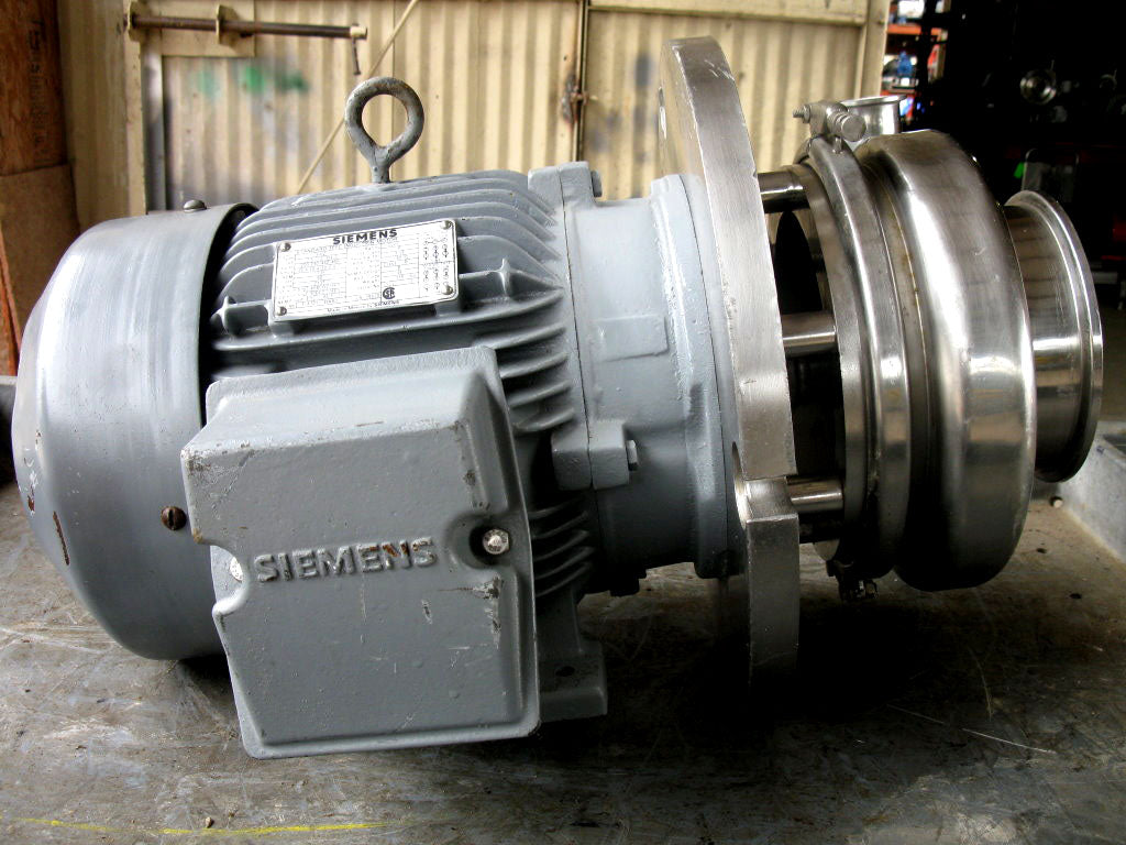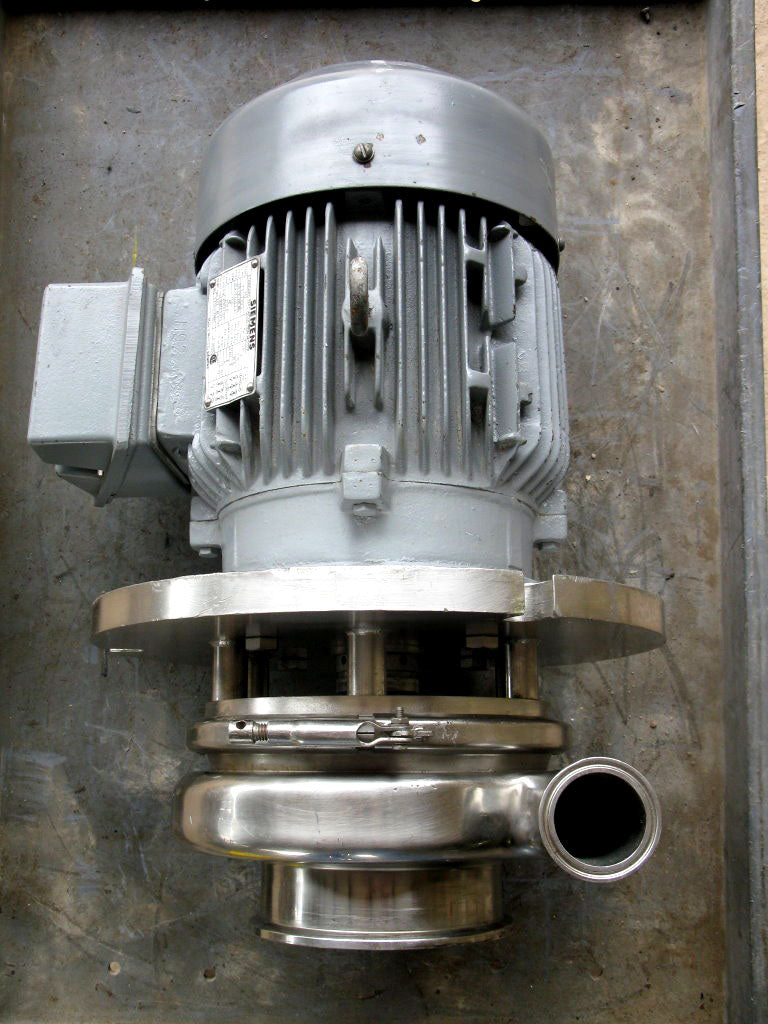 Sanitary Centrifugal Pump. Impeller diameter: 6-1/2 in. Siemens Electric Motor, 7-1/2 hp, 1735 rpm, 220-230/440/460 V, 20.4-19.4/10.2-9.7, 60 Hz, 3 phase. Inlet/outlet: (1) 6-1/2 in. S-line, (1) 2 in. S-line. Overall dimensions: 1 ft. 10-1/4 in. L x 1 ft. 2-1/2 in. W x 1 ft. 2-3/4 in. H.