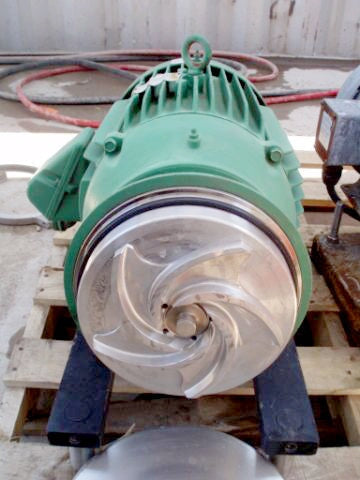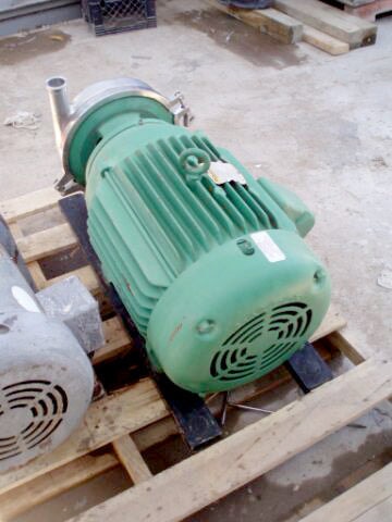 Sanitary Centrifugal Pump. Impeller diameter: 7-1/2 in. Baldor Industrial Motor, 20 hp, 3525 rpm, 208-230/460 V, 48-46/28 amps, 60 Hz, 3 phase. Inlets: (1) 2 in. dia. S-line fittings. Outlets: (1) 1-1/2 in. dia. S-line fittings. Overall dimensions: 2 ft. 2 in. L x 1 ft. 7 in. W x 1 ft. 5 in. H.