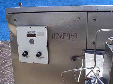 Sariete Homogenizer. Model: DA61. Approximate rated capacity: 3000 gallons/hr. Compliant with 3”A” standards. 2- stage hydraulic valve assembly. Equipped with poppet seats. (3) 2-3/4 in. dia. plungers. Pressure and flowrate can be modified / adjusted to suit your needs. ASEA Motor, 100 hp. Elettroaspiratore blower, Type CB-20125, Inlets: (1) 3 in. I-Line product, (1) 1 in. dia. s-line steam, (1) 3/4 in. dia. NPT (male) oil, (1) 3/4 in. dia. NPT (male) air, (1) 1 in. dia. NPT (male) chilled, (1) 1 in. dia. NPT (male) water tower. Outlets: (1) 2-1/2 in. I-Line product, (1) 1 in. dia bevel water tower, (1) 1-1/2 in. dia. NPT (female) chilled. Overall dimensions: 10 ft. L x 6 ft. 1 in. W x 5 ft. 4 in. H.