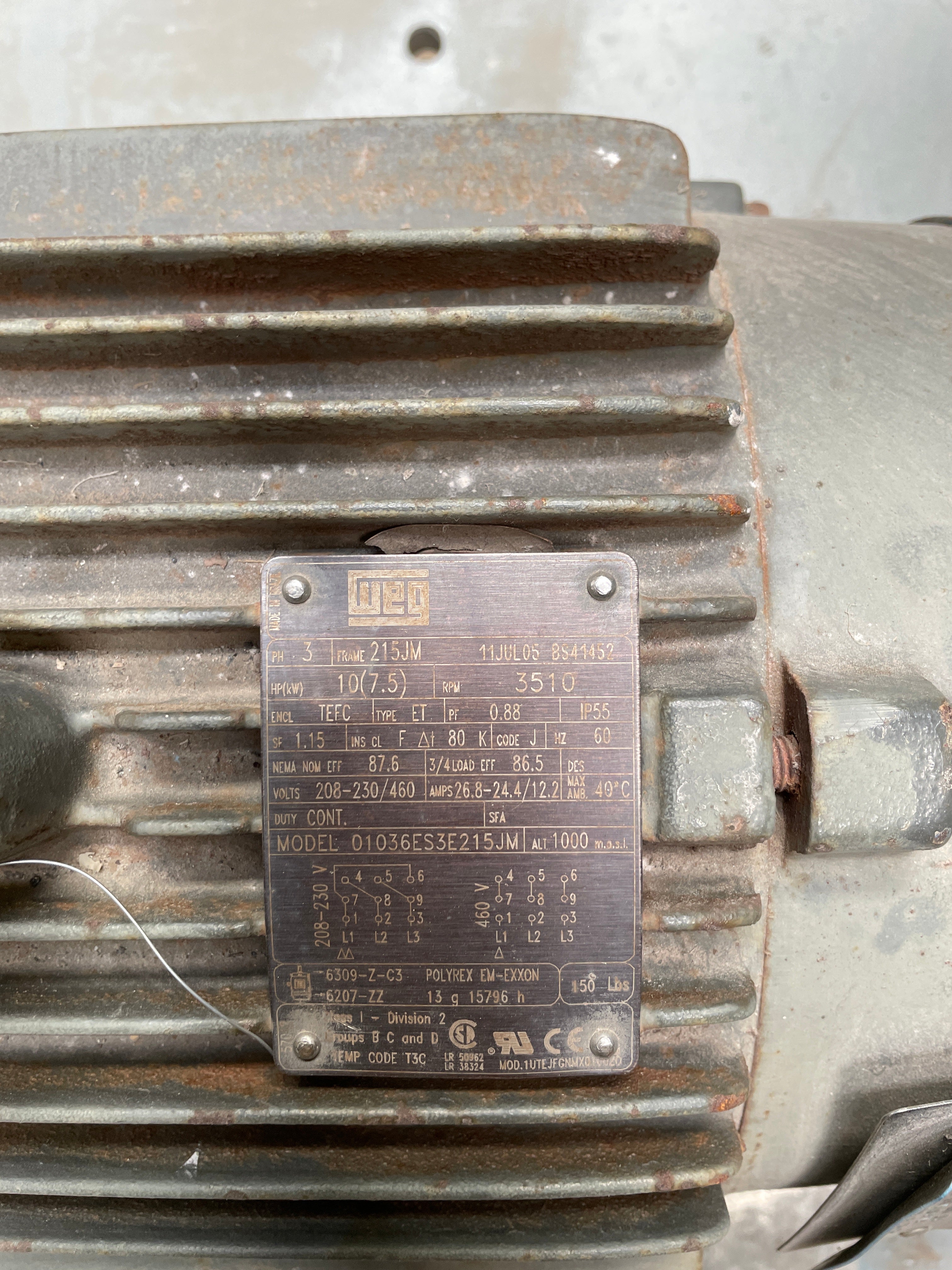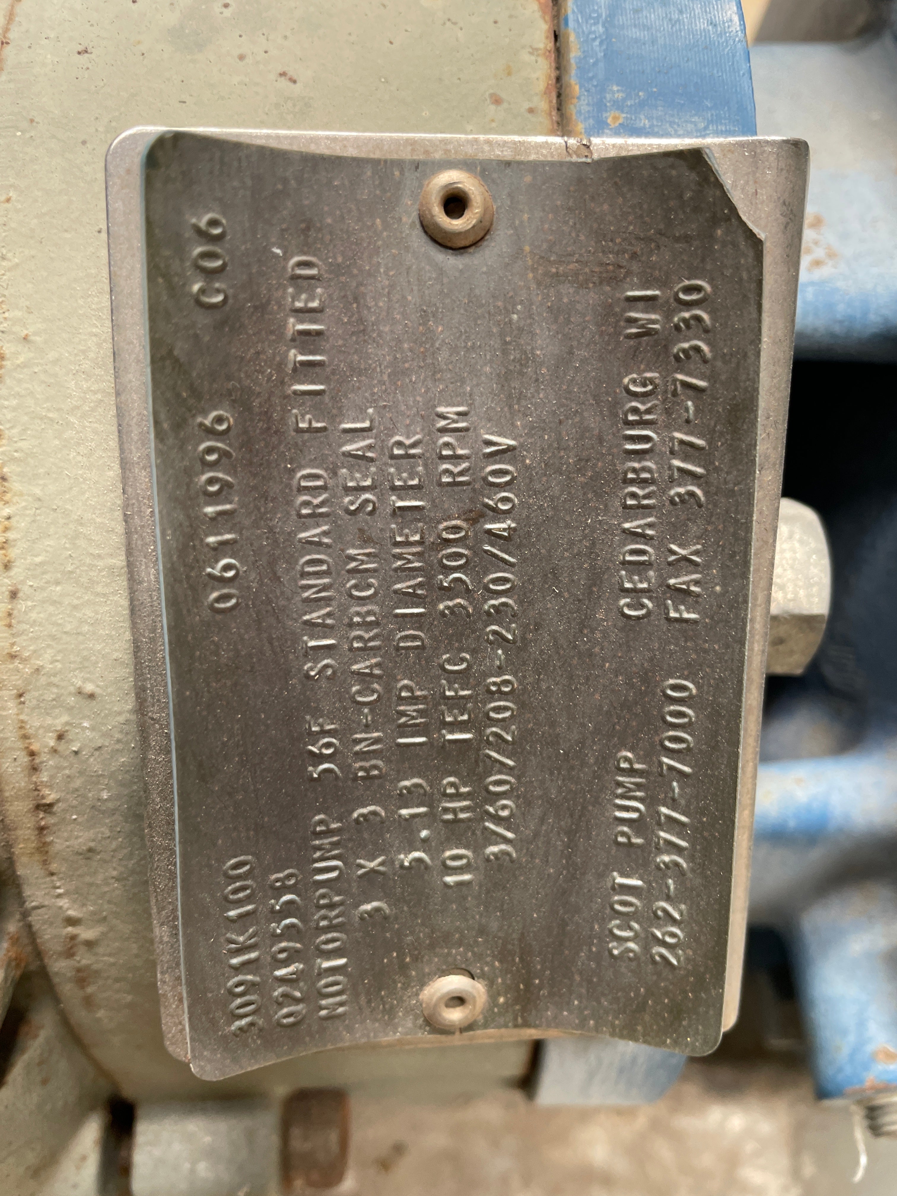 Scot 56F Standard Motor Pump - Cast Irom 3x3 BN-Carbon Seal. Impeller Dia(in): 5.13. 10 HP,TEFC, 3500 RPM, 3 PH, 60 HZ, 208-230/460 Volts. Max PSI: 78, Max Flow: 550 GPM. WEG Motor - PH: 3, Frame: 215JM, HP: 10, RPM: 3510, ENCL: TEFC, Volts: 208-230/460, Amps: 26.8-24.4/12.2.
