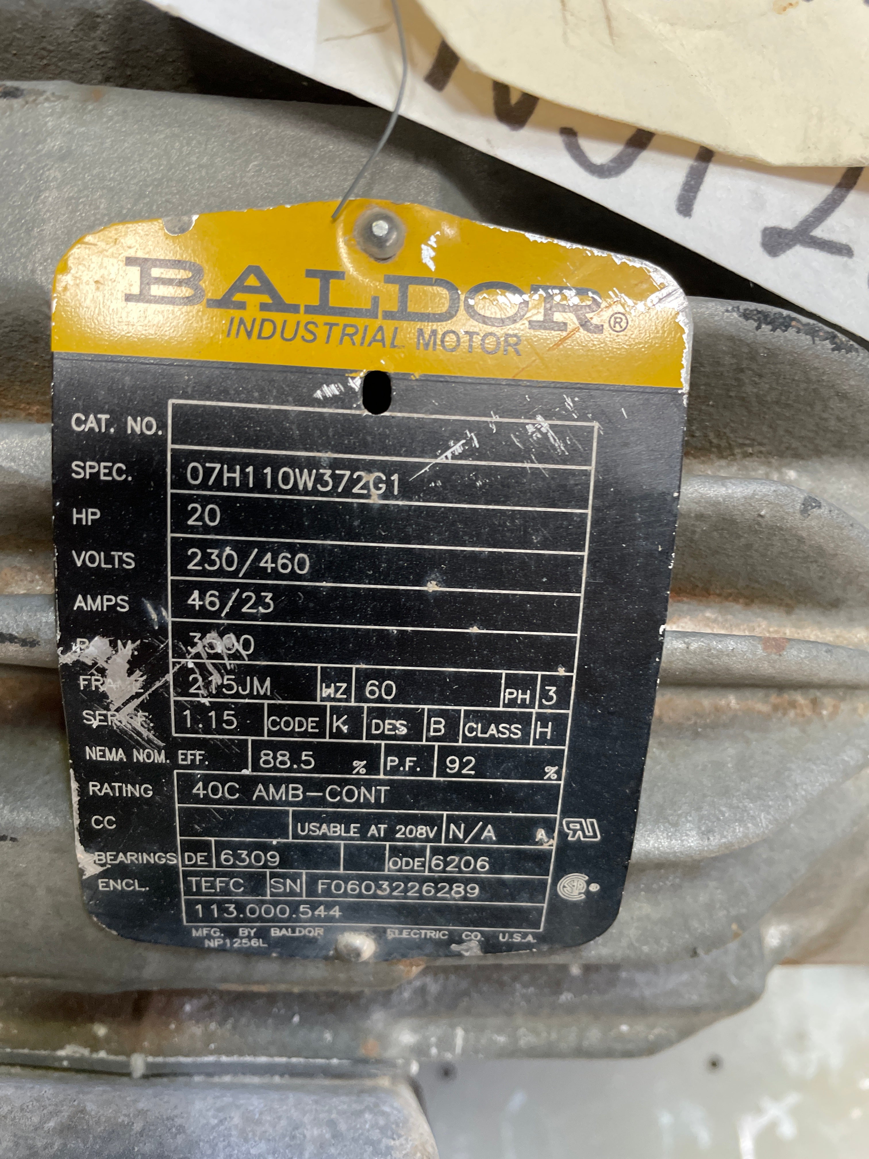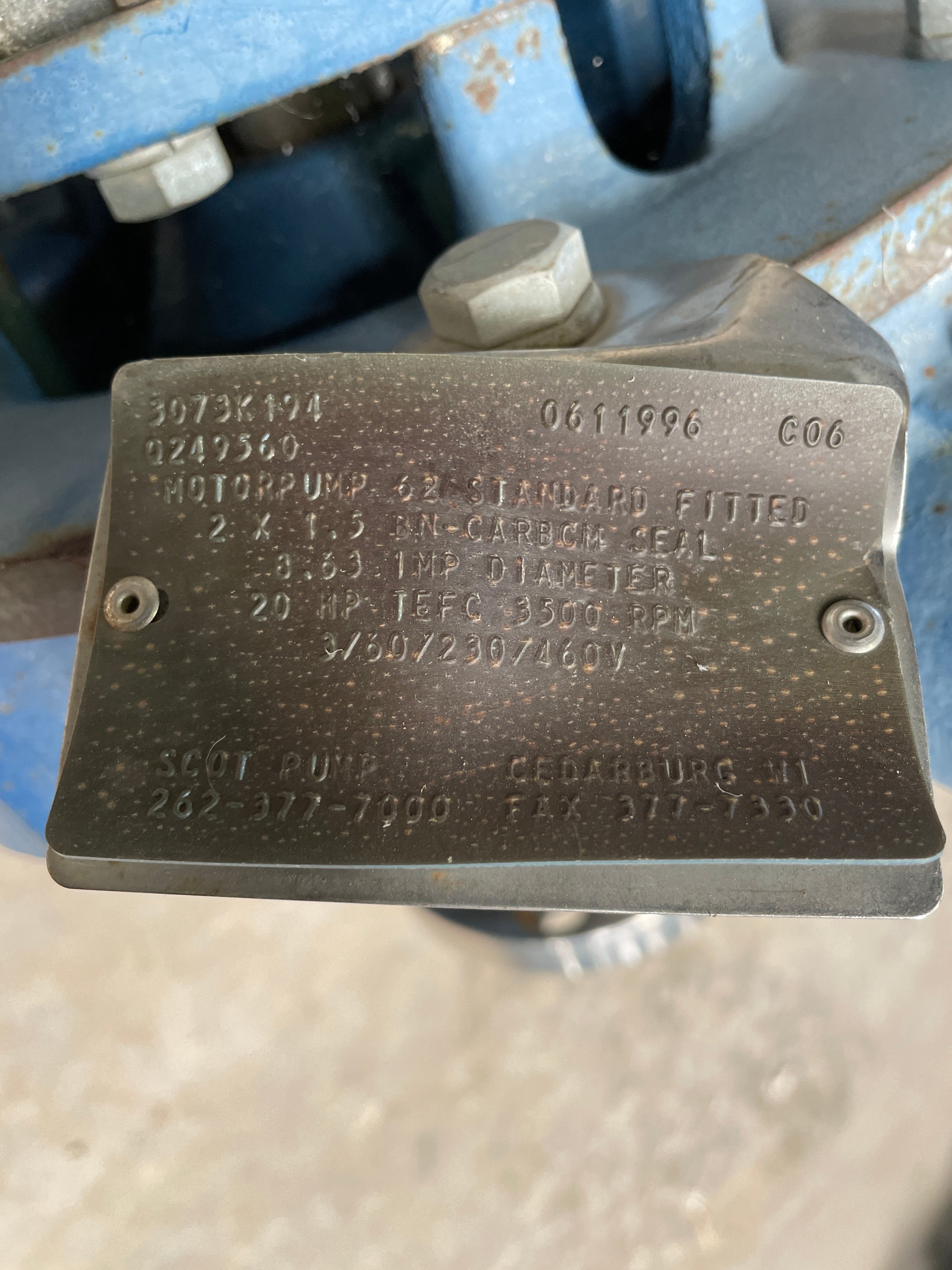 Scot Motorpump 62 Circulating Pump - Motorpump 62 Standard Fitted 2 x 1.5 BN-Carbon Seal. 8.63 Impeller Diameter. 20 HP, TEFC, 3500 RPM, PH: 3, 60 Hz, 230/460 Volts. Impeller Type: Enclosed. Maximum Pressure: 195 PSI. Max GPM: 175 GPM. Baldor Motor - Spec: 07H110W372G1, HP: 20, Volts: 230/460, Amps: 46/23, RPM: 3500, Frame: 215JM, Hz: 60, Ph: 3, Serf: 1.15, Code: K, Des: B, Class: H, Nema Nom. Eff.: 88.5%, P.F: 92%, Rating: 40C AMB-CONT, CC: Usable at 208v, Bearings:DE: 6309, ODE: 6206, Encl.:Tefc: 113.000.544, SN: F0603226289.