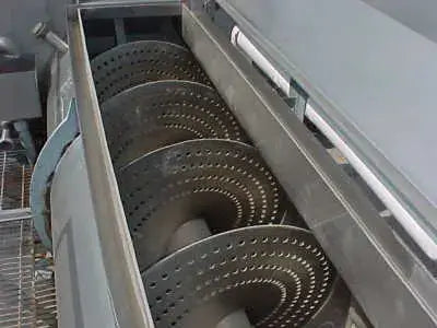 Screw Blancher. Barrel length: 18 ft. Discharge feed length: 16 in. Drive: 1 hp. Steam controls. (19) steam inlets. Total length: 22 ft. 6 in.