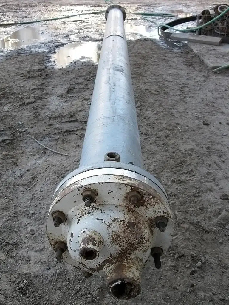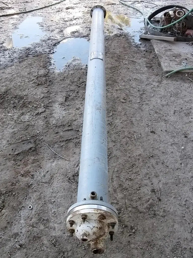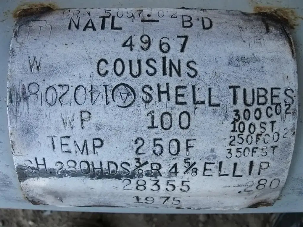 Shell and Tube Heat Exchanger. Estimated heat transfer surface area: 26 sq. ft. (18) ½ in. diameter tubes of 11 ft. length. 2 pass design. Inlets/outlets: (2) 2 in. flange with (4) ¾ in. mounting holes. 3-3/8 in. adjacent, 4-3/4 in. opposite. (1) 2 in. FNPT. (1) 1 in. FNPT. (1) ¾ in. FNPT. Overall dimensions: 11 ft. 10-1/2 in. L x 10-1/4 in. W x 1 ft. 1 in. H.