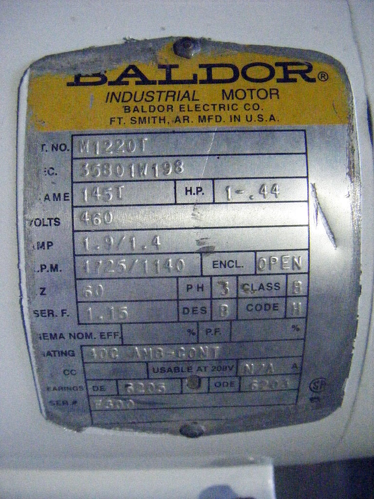 Sherwood Positive Displacement Pump. Baldor Industrial motor: 1-.44 hp, 1725/1140 rpm, 460 v, 1.9/1.4 a, 60 Hz, 3 phase. (2) 1-1/4 in. L. x 1-3/4 in. rotors. Inlet/outlet: (2) 3/4 in. FNPT. Overall dimensions: 1 ft. 7 in. L x 10 in. W x 11-1/2 in. H.