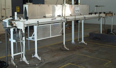 Shibuya Kogyo Motorized Bottle Conveyor with Steam Heat Treatment Unit. Steam Heat Treatment Tunnel is stainless steel. Dimensions: 138 in. L x 8 in. W x 17 in. H. Conveyor belt: 4-1/2 in. Fuji Electric motor: 208/220 V, 3 phase, 50/60 Hz, 2.3/2.0 amp., 1,425/1,710 rpm, type: MLH 3075, Frame: 71. Gear reducer (variable speed drive), Model: PWN-46, ratio: 1:4, MFG: 056114, Belt # 2019. Legs: (7) 42-1/2 in. Overall dimensions: 291 in. L x 23 in. W.