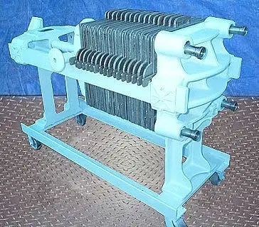 Shriver Plate and Frame Filter Press. Model: 18. S/N: 28342. 316 Stainless steel plates. Maximum filtering pressure: 100 psi. Frame is equipped with (16) plates and (16) dividers. Plates are closed by turning a manual vise. Filtering area: 56.64 sq. ft. (4) Casters allow for easy positioning. Inlets/outlets: (4) 1-1/2 in. dia. threaded fittings. Overall dimensions: 57 in. L x 30 in. W x 43 in. H.