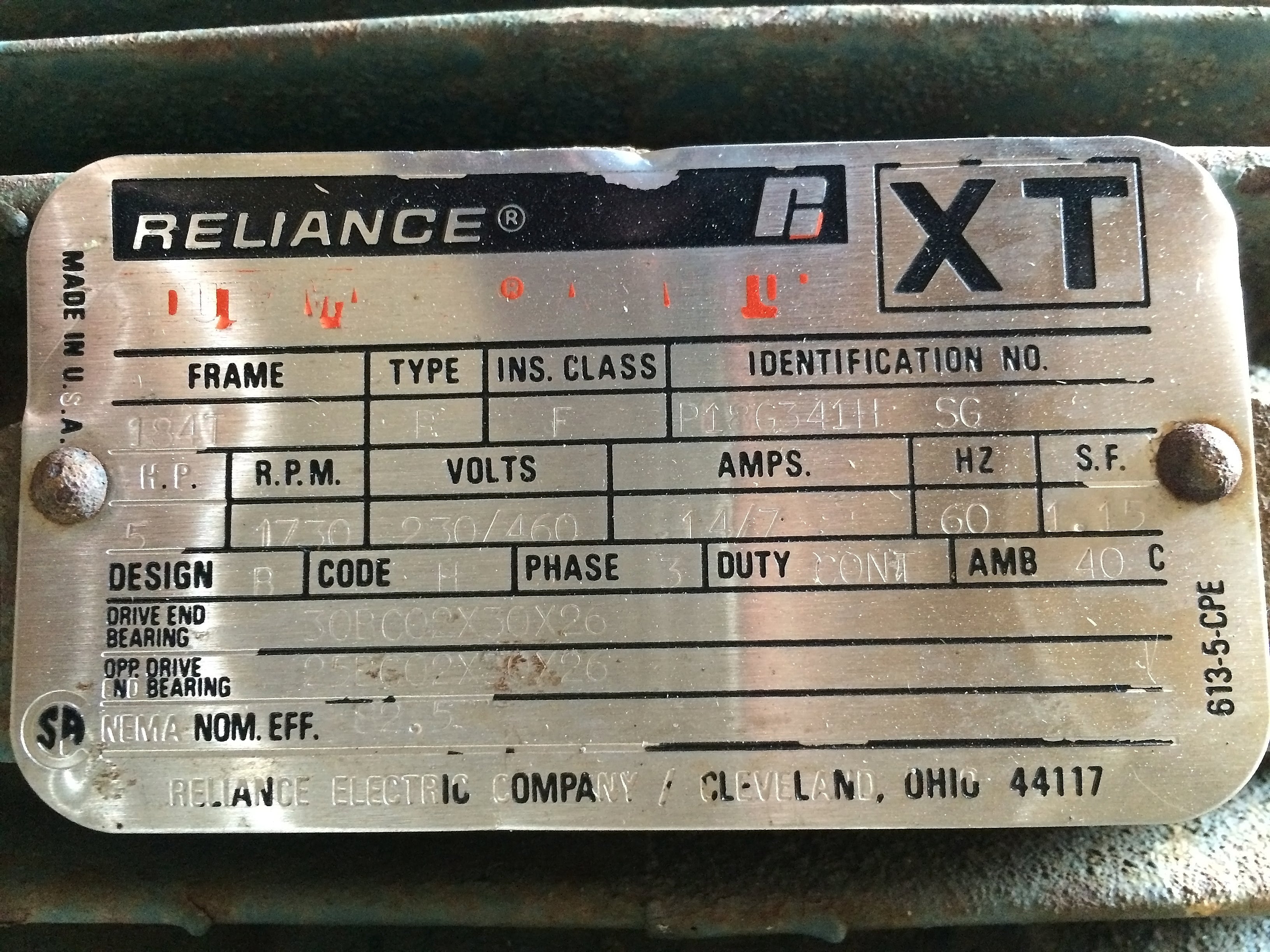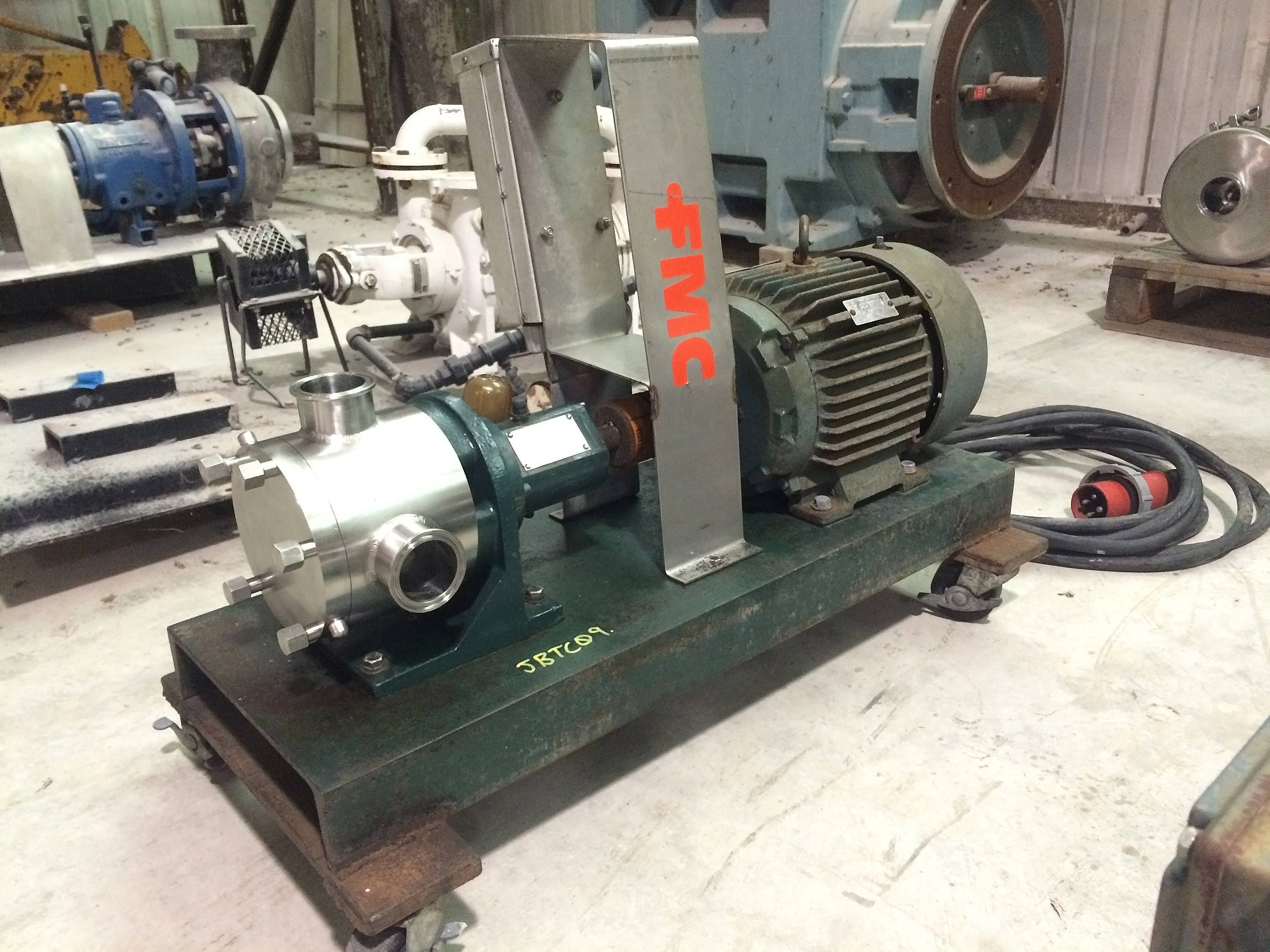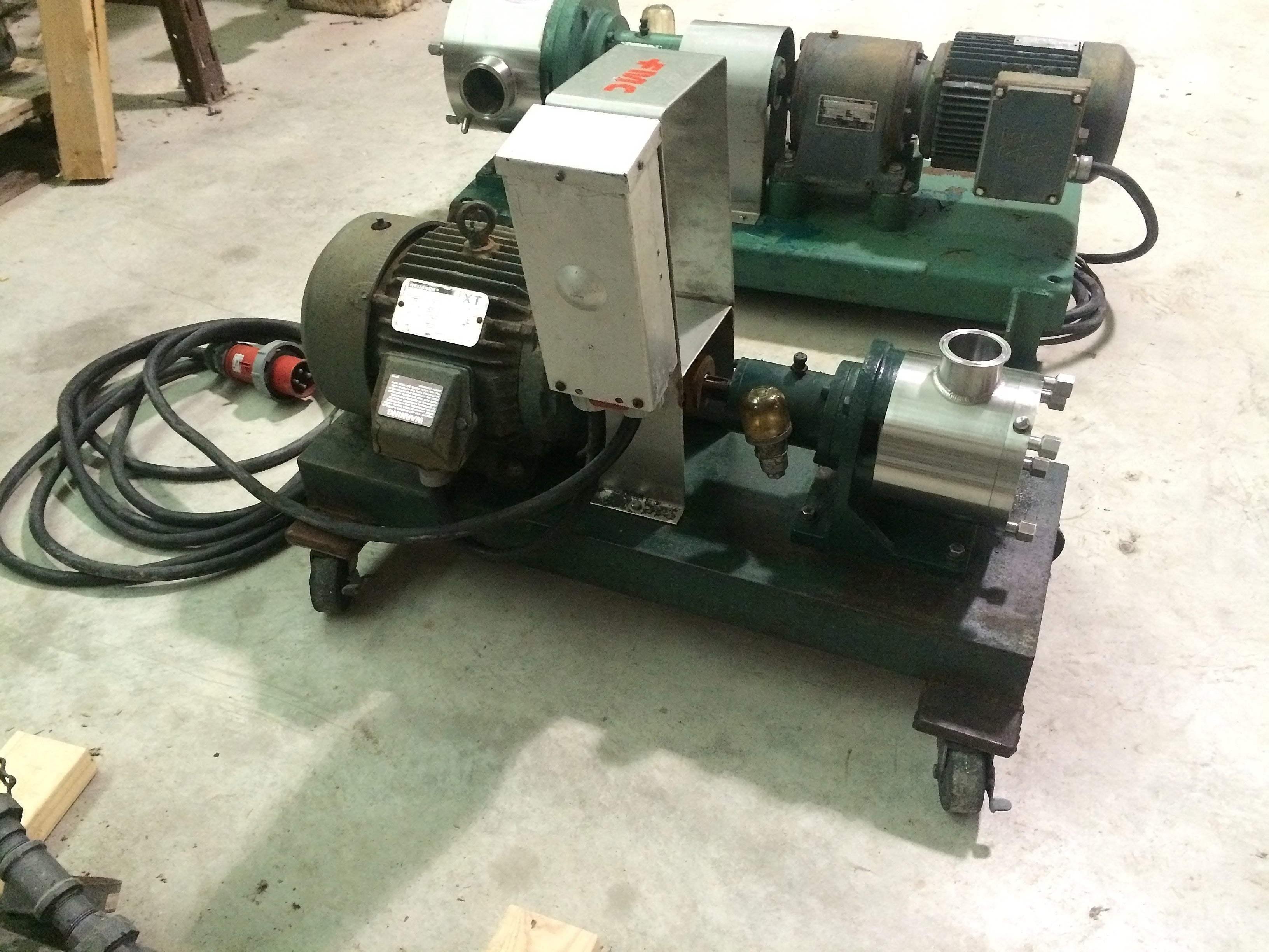 Maso Sine Stainless Steel Positive Displacement Pump, model: SPS-20, ID 209, serial 10930SP-001. Reliance motor: 5 HP, 1730 RPM, 230/460V, 14/7 amps, 60 Hz, 3-phase. SPS2 specs: flow 0.03 gallons/rev, 217 PSI max, 18 GPM at max 600 rpm, 0.25 inch max particle size, 2 inch ports, -40F-212F temp range. Note this unit is direct drive and will need to have a VFD to slow the motor speed to 600 RPM or less.