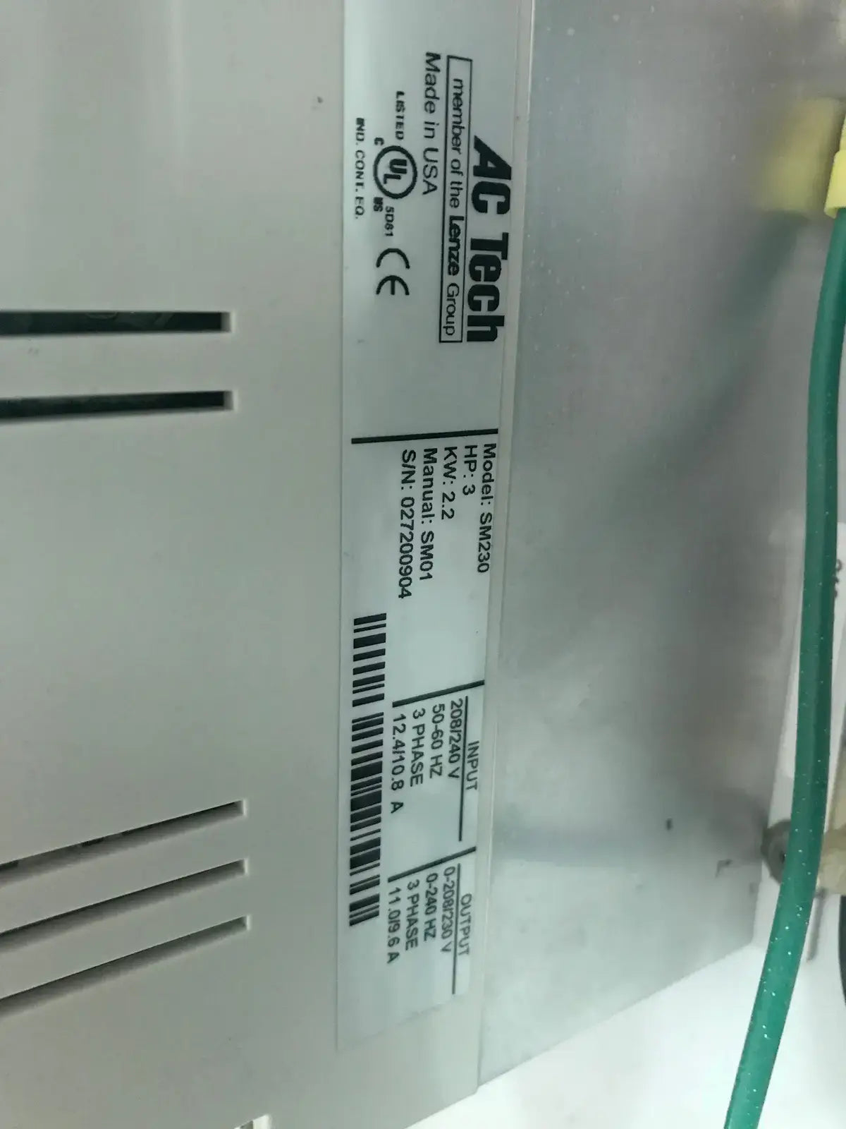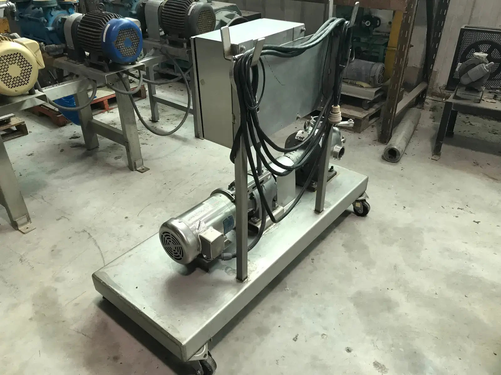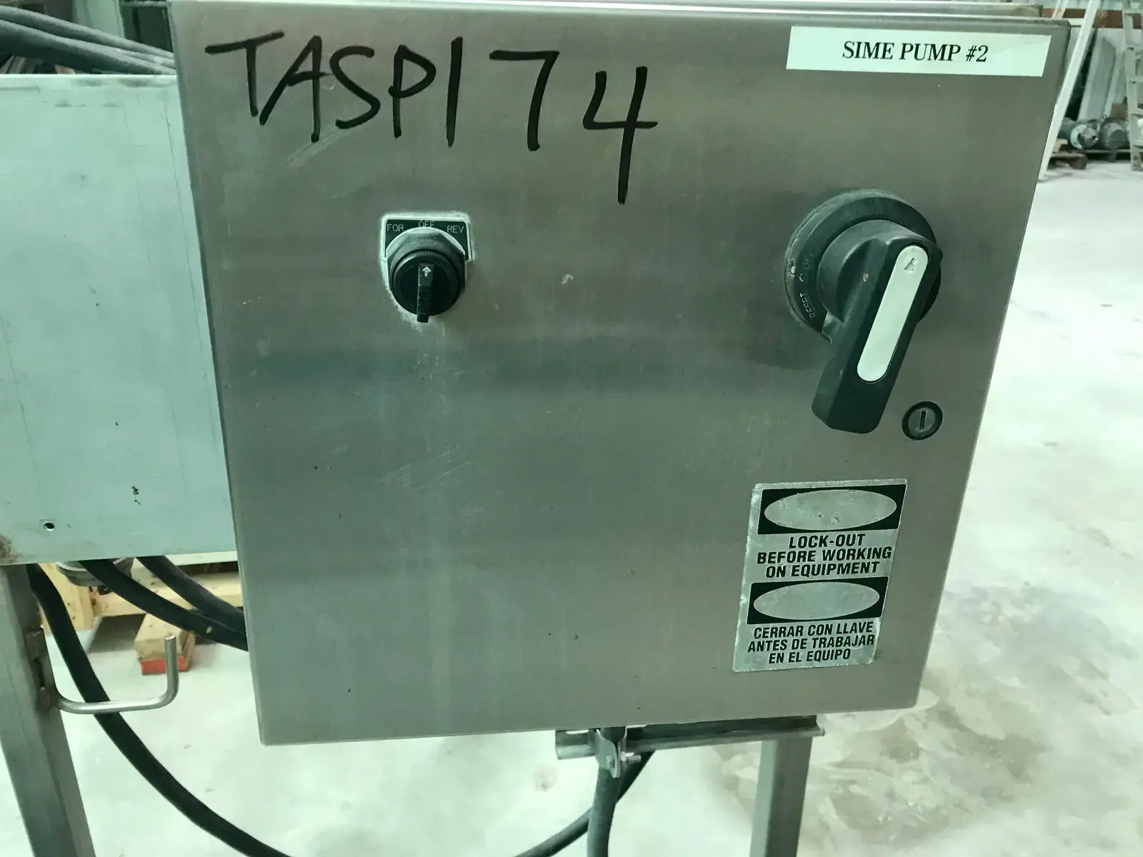 Sine Positive Displacement Pump. Model SPS035NNTCM. Serial: 208767035A472M. Gear drive ratio: 11.4 (154 final RPM). Baldor Washdown Duty Motor: 3 HP, 208-230/460V, 1760 RPM, 60 Hz, 3-phase, 182TC Frame. Control panel features AC Tech Lenze VFD 208/240V motor speed controller. Ports: 3 tri-clamp.