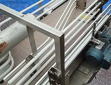 Single Filer Conveyor. The dimensions are: Tracks 1-3 are 80 in. long and 10 in. wide. Tracks 4, 5 & Main are 110 in. but the end has a bracket that attaches to something and it measures 2-3/4 in. So the track itself is not 110 in. it is slightly shorter. These three tracks are a total of 10-1/2 in. wide. The overall length of the single filer from end to end is 142-3/4 in. The first 9 in. of conveyer is 6.5 in. wide The next 2 ft. of conveyer is 3 in. wide plus the 6.5 in. Making 9.5 in. The next 3 ft. of conveyer is 6.5 in. wide plus the 9.5 in. above Making 19 in. The single file conveyer is 3.5 in. by 9 ft. There is one drive on the entire system.