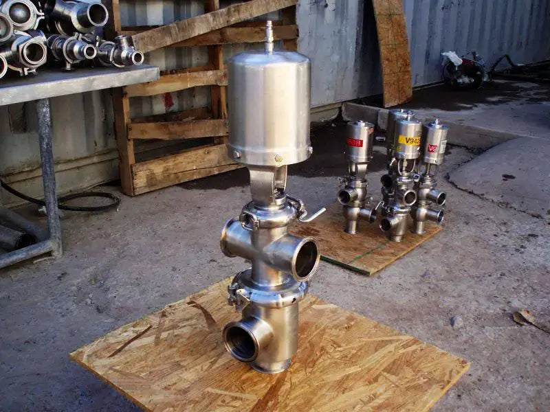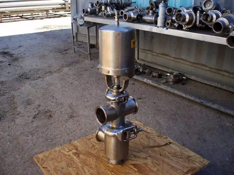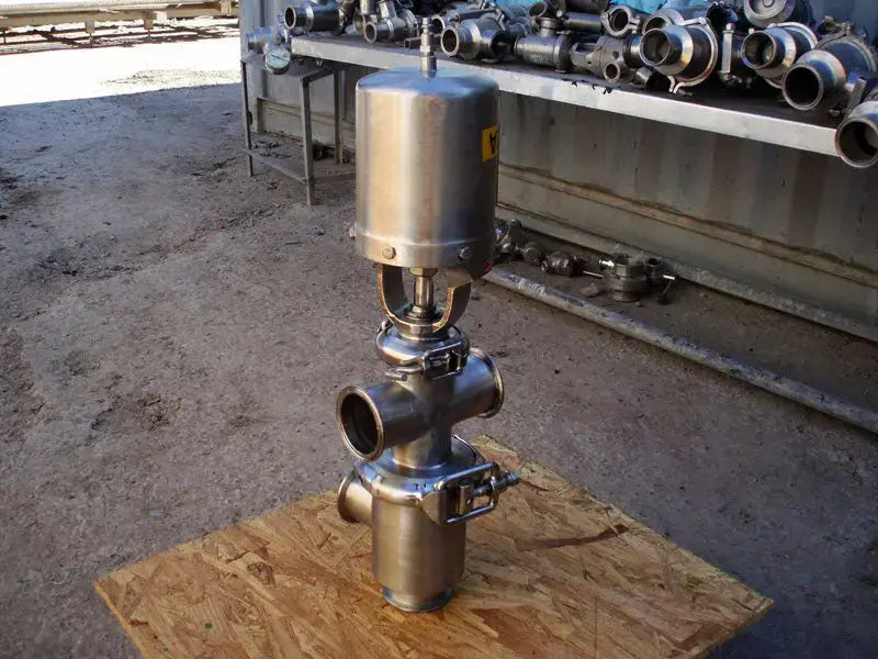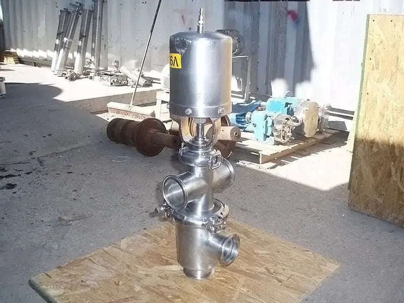 Single Stem Cross Body Divert Valve. Pneumatic actuated valve. Inlets/Outlets: (4) 2-1/2 in. S-Line fittings. Overall dimensions: 7 in L x 6-1/4 in. W x 2 ft. H.