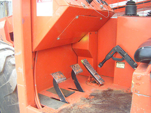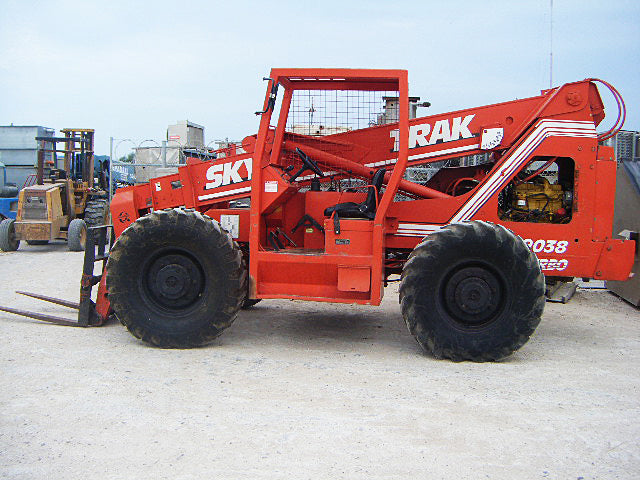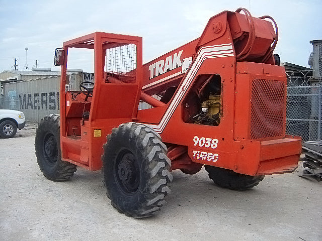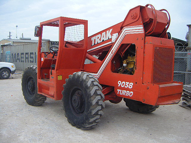 Skytrak 9038T 9,000 LB 4X4X4 Telescopic Forklift. Model: 9038T. Engine: 107 hp, 4 cylinders Diesel. Fuel Tank capacity: 42 gal. 5D0032. John Deere 4 cylinder, 3 section boom, aux hydraulic. Tire size: 14.00-24. Max. Capacity: 9000 lbs. Lift Height: 37 ft. 6 in. Max. Reach: 23 ft. 6 in. Hydraulic oil capacity: 45 gal. Overall dimensions (fully retracted): 22 ft. L x 8 ft. 6 in.W x 8 ft. 9 in. H.(ACN850).