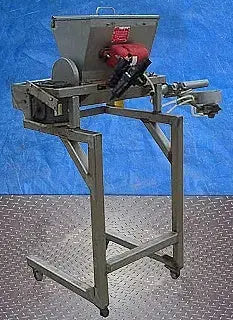 Smalley Mfg. Co. Season Metering Hopper- 1.7 Cu. Ft. Stainless steel construction. Ribbon blender: 6 in. dia. x 17 in. L. Screw auger: 2 in. dia. x 44-1/2 in. L. Features a flip-top lid with a 12 in. L x 11 in. W guard screen. Guard opening dimensions: 3 in. L X 3 in. W. Syntron Electirc rotary vibrator. Gast Air Reversible Motor, Model: 4AM-FRV-13C, weight: 9 lbs, drives a 4 in. dia. 4- vane disc. The Gast air motor's non-electrical operation reduces the possibility of explosion from igniting flammable gases. Boston Gear Drive. Overall dimensions: 55 in. L. x 26 in. W. x 59 in. H.