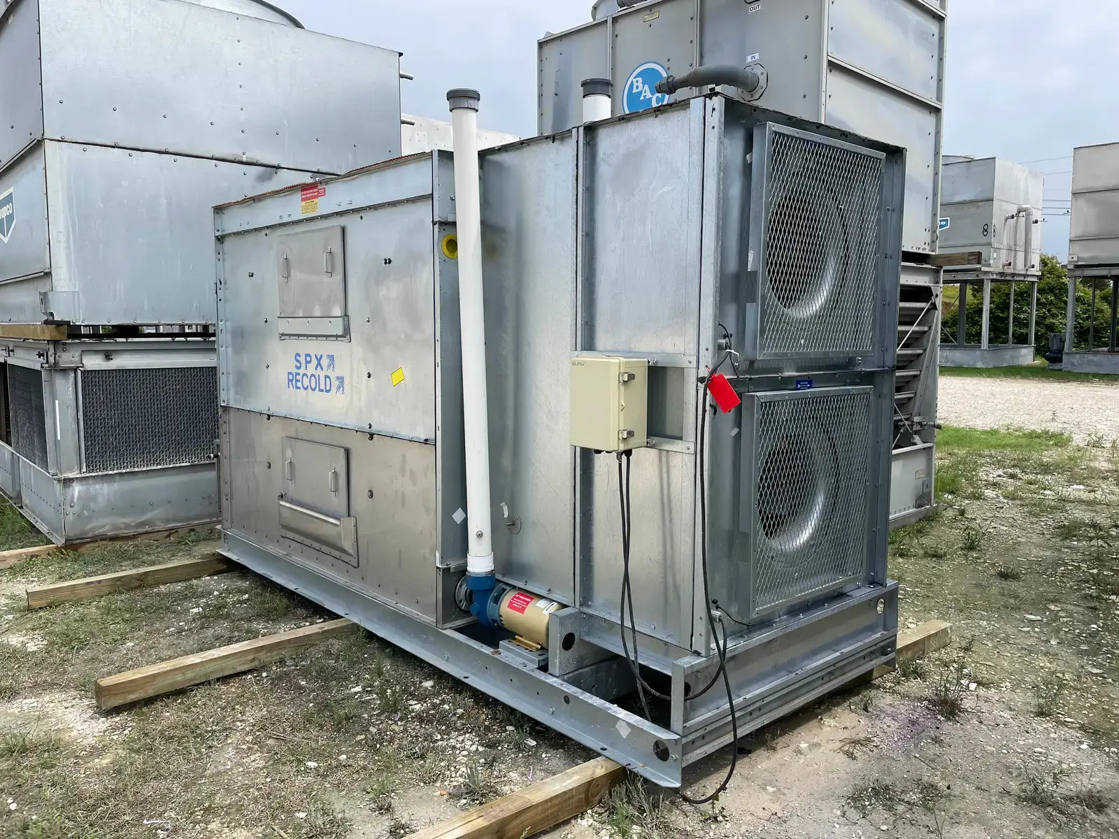 SPX Technologies Recold JW Series Fluid Coolers. Model: JW-35C. Rated capacity: 35 tons with respective entering and leaving water temperature of 95°F and 85°F and a wet bulb of 78°F. 49.6 sq. ft. coil surface area. Baldor Super-E fan motor: 15 HP, 1765 rpm, 200V, 42.4 amps, service factor 1.15, 60 Hz, 3 phase. Emerson pump motor: model AR01, 2 hp, 1725 rpm, 208-230/460V, 6.20-6.00/3.00 amps, service factor 1.25, 60 Hz, 3 phase. Equipped with Clearwater Systems Corp. Dolphin, Pulsed-Power water treatment systems to inhibit corrosion and mineral scale formation, and also control microbial build up. Wiegmann control panel: cat. no. EHC302408, type 1, 3R. These units were intended for a project that was not completed and thus, have never been used. Overall dimensions: 15 ft. 9 in. L x 7 ft. 2 in. W x 7