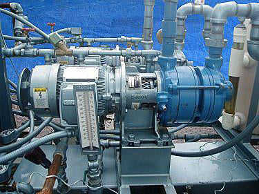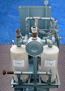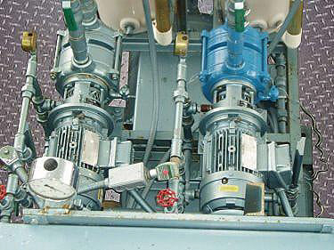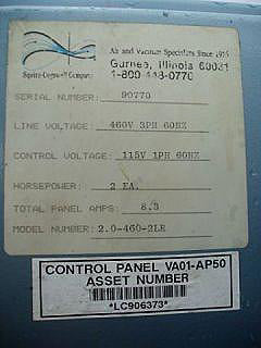 1995 Squire Cogswell Monobloc Full Vacuum Skid. Brunner Engineering and Manufacturing Inc. Vacuum Tank- 70 Gallon, Nat'l Bd: 78673H, P/N: 0673 C-12145-3A, MAWP: 200 psi, @ 450 °F, MDMT -20 °F @ 200 psi, shell thickness: 0.151 in., head thickness: 0.124 in. (2) Squire Cogswell/Robuschi Vacuum Pumps, Model: RVA302, S/N's: 9404242WJ and 9404243WJ. (2) Siemens Motors, 2 hp, 1720 rpm, 230/460 V, 5.8/2.9 amps, 60 Hz, 3 phase. Squire Cogswell Co. Control Panel, Model: 2.0-460.2LR, S/N: 90770, control power supply: 115 V, 8.3 amps, 60 Hz, single phase. (2) Poly Tanks- 7.5 Gallon. (1) Recieving Tank- 8 Gallon. Inlets: (1) 2 in. dia. FNPT, (2) 1 in. dia ports. Outlets: (2) 1-1/2 in dia. NPT. Overall dimensions: 86 in. L x 42 in. W x 80 in. H.(H12).