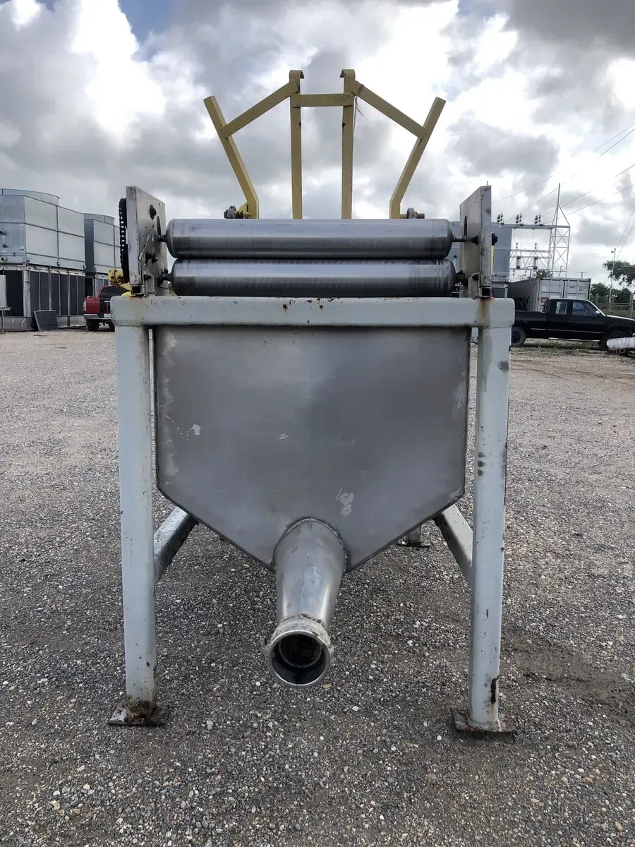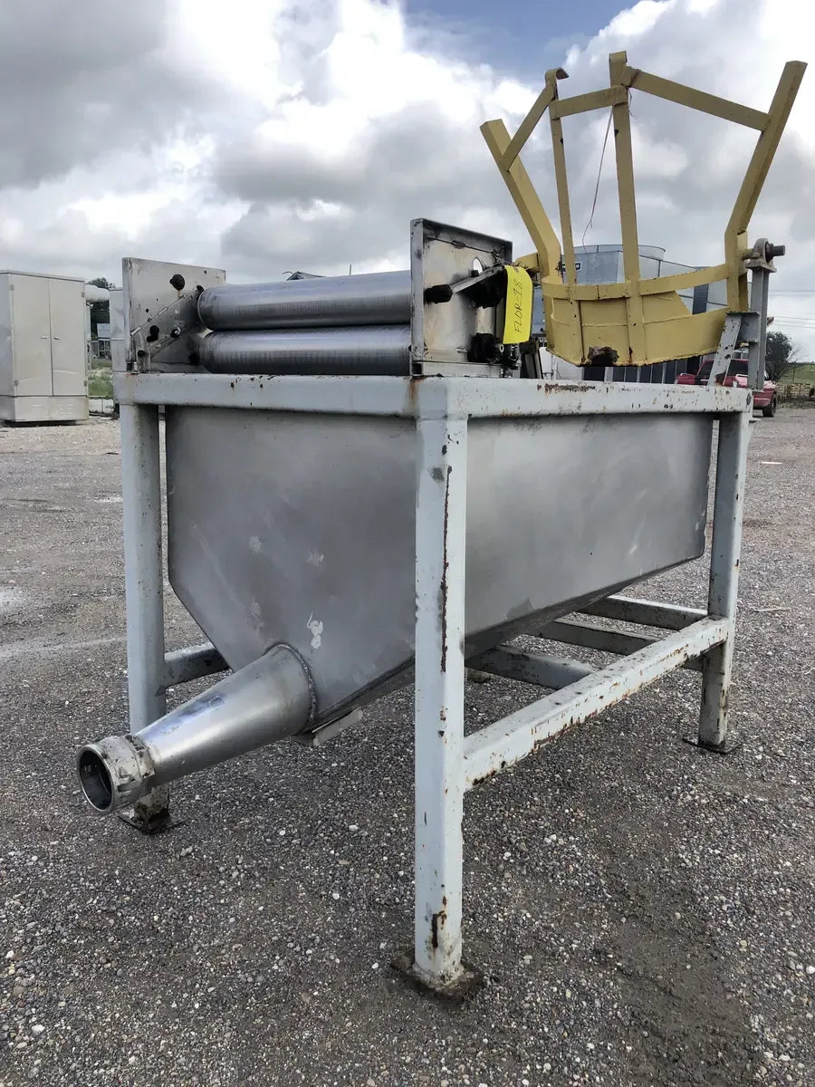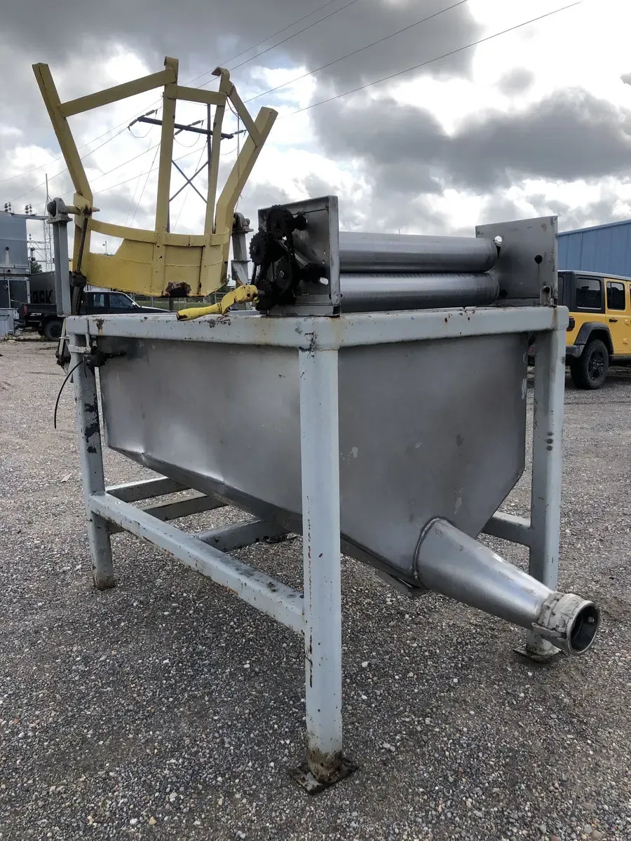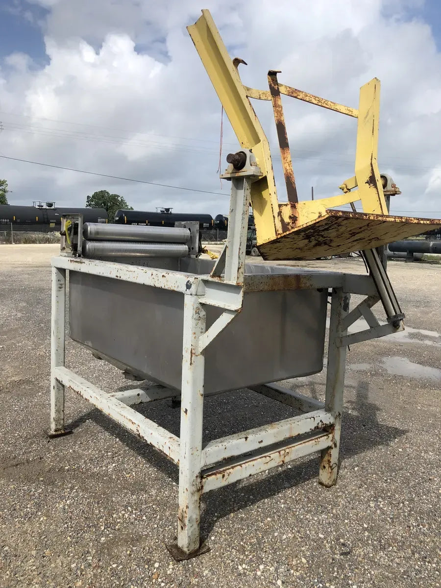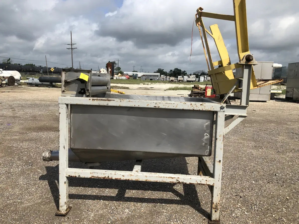 A Stainless Hydraulic Drum Lift with an Outlet of 5 in. The Mixer is Supported by a Steel Built Frame Measuring the Whole Unit at 99L x 46W x 91H.