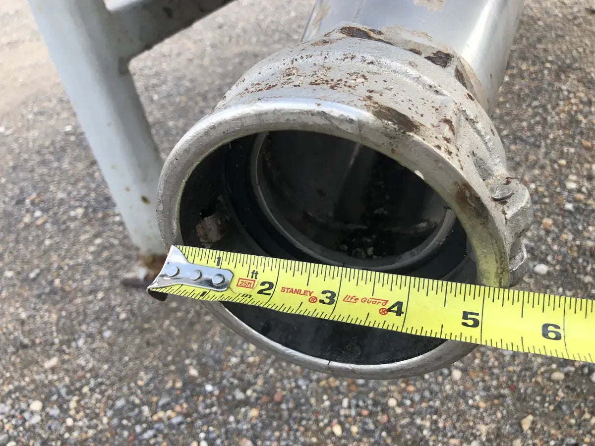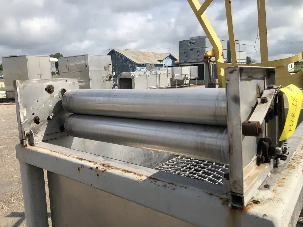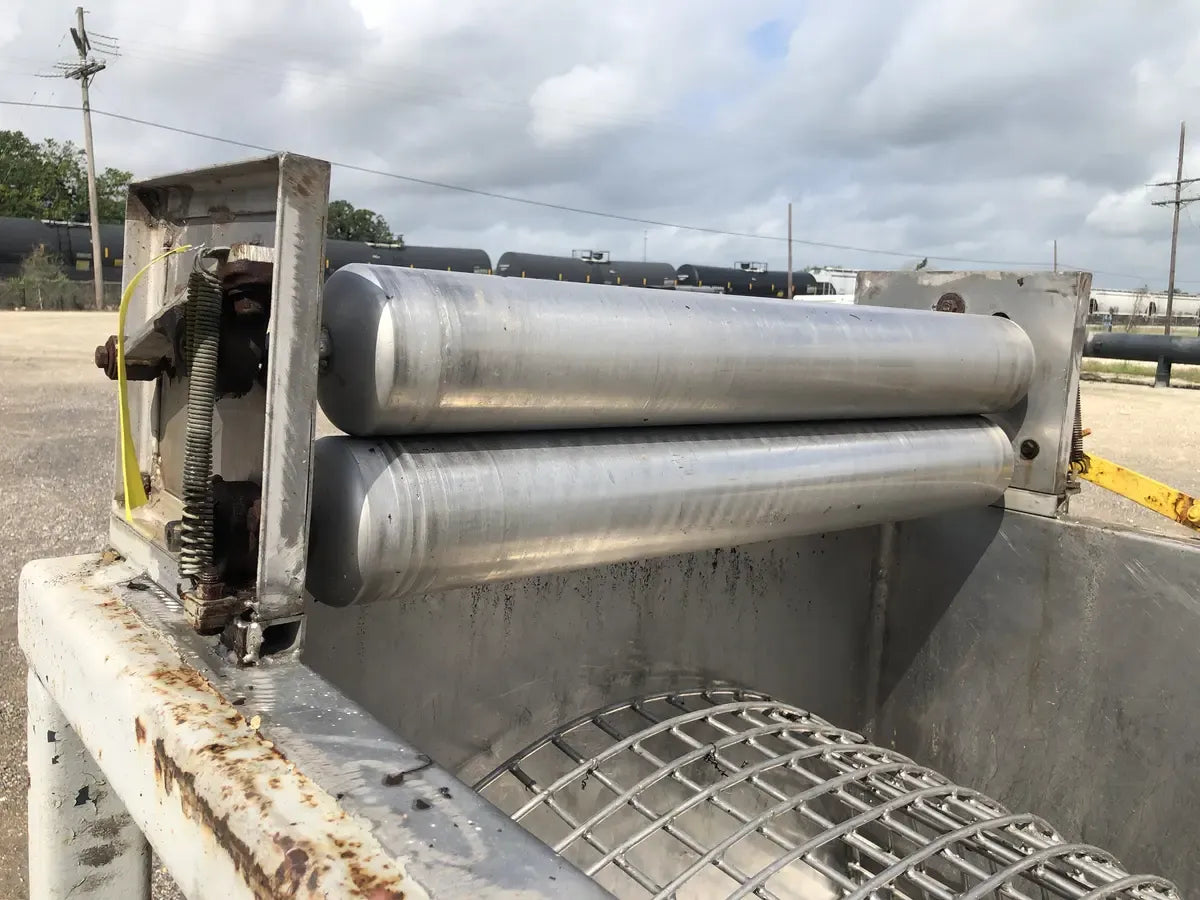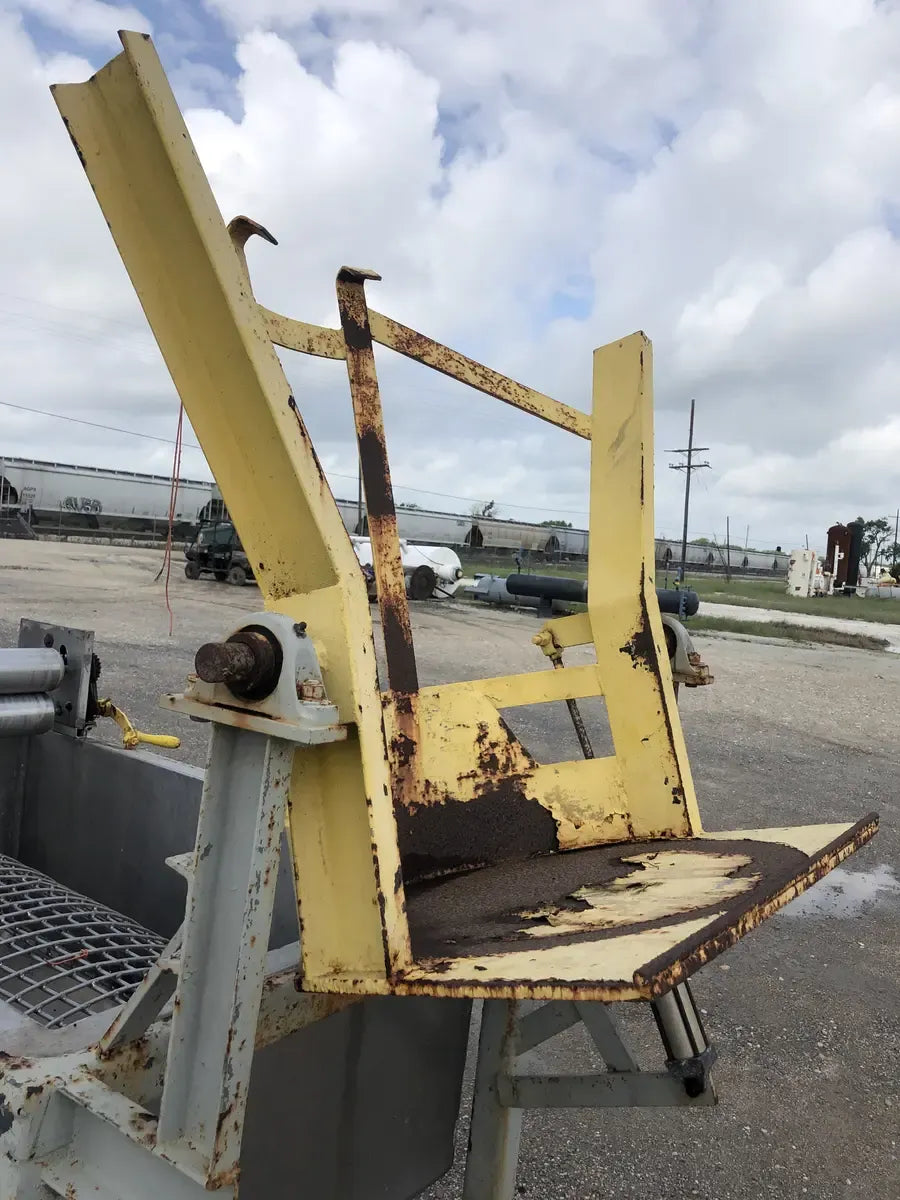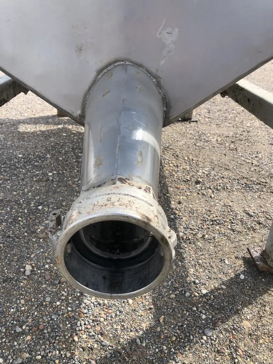 A Stainless Hydraulic Drum Lift with an Outlet of 5 in. The Mixer is Supported by a Steel Built Frame Measuring the Whole Unit at 99L x 46W x 91H.
