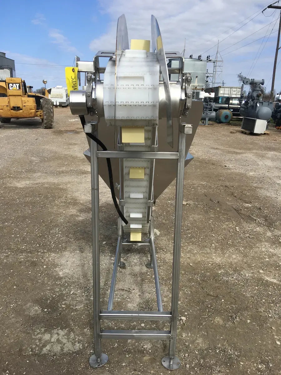 4 wide Elevator Conveyor. Infeed at 36. Discharge at 57. Adjustable 6 foot pads. Hopper is 35 x 24 x 19D. Vander Graaf Inc Motor Model No.TM127A25-675NB-STM, Serial No: NS78795A-8 Class: F, Mp: 1.14, Hz: 60, Ph: 3, HP: 0.75, Volts: 480