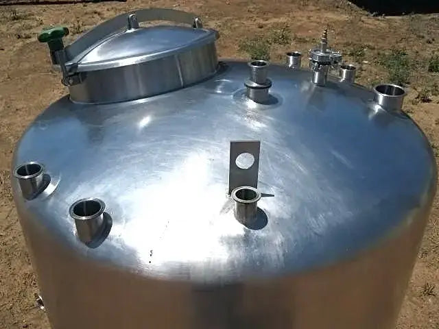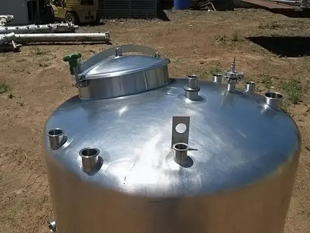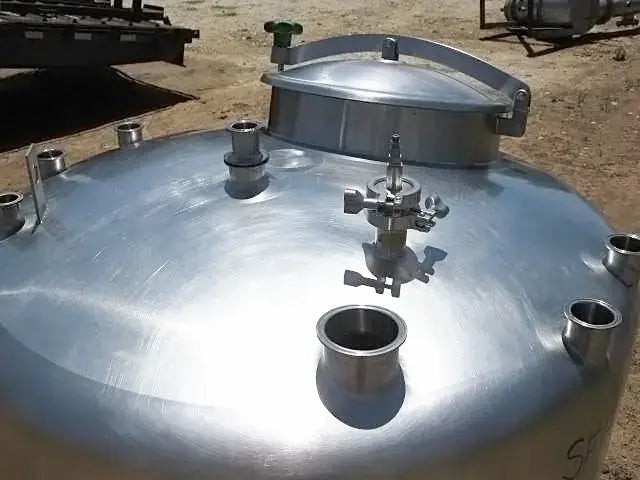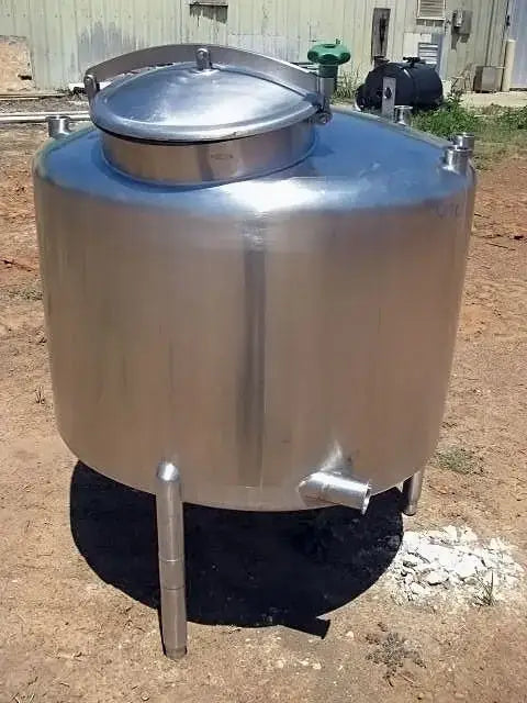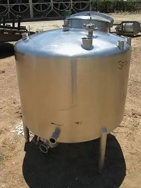 Stainless Steel Balance Tank. S/N: 81109331. Approximate capacity: 120 Gallons. Internal dimensions: 41-1/2 in. diameter x 27 in. straight wall. Manway: 18 in. Inlets / outlets: (1 ) 6 in. (2) 3-1/2, (4) 2-1/2, ( 3) 2 in., (1) 3 in., (1) 2-1/2 in., all tri-clamp. Overall dimensions: 3 ft. 10-1/2 in. L x 3 ft. 9 in. W x 4 ft. 7-1/2 in. H.