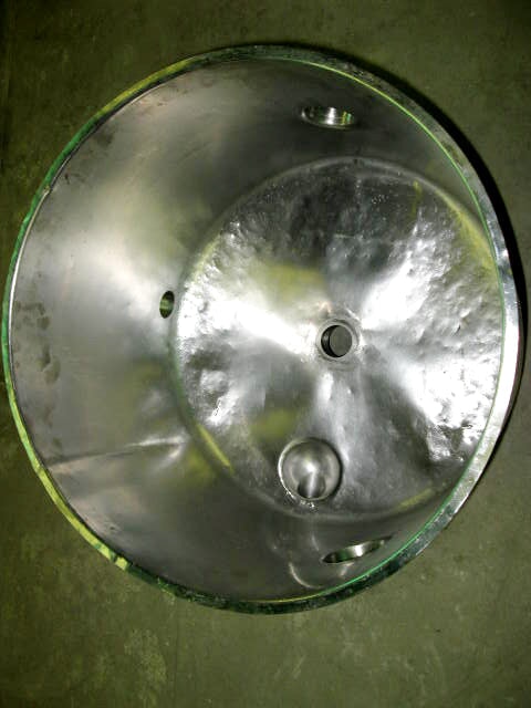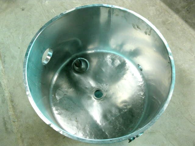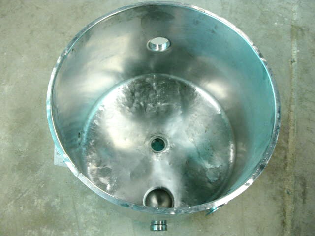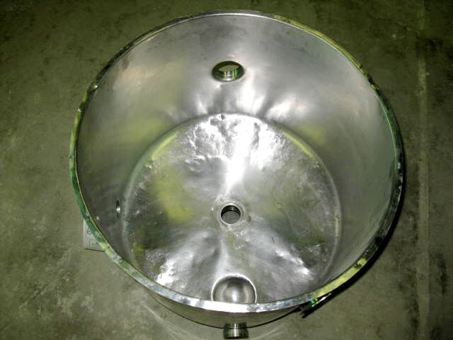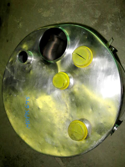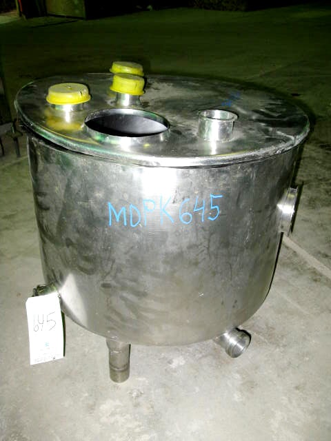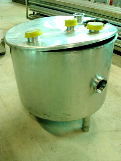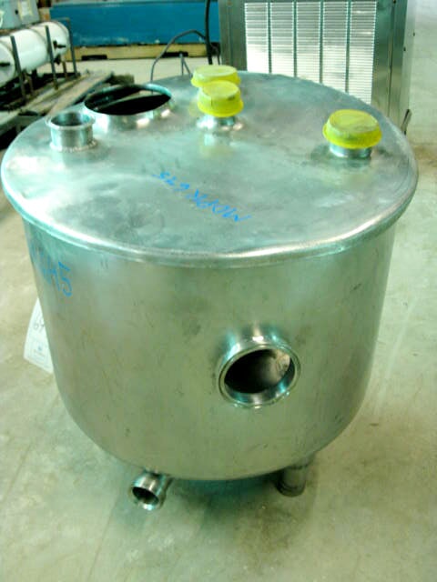 Stainless Steel Balance Tank. Approximate capacity: 23 gallons. Inside dimensions: 24 in dia. x 17 in. straight wall. Inlet/outlet(s): top: (3) sanitary 2-1/2 in., (1) threaded 2 in., (1) raised. Side: (1) of each sanitary 2, 3 and 4 in., (1) threaded 2 in. Bottom: (1) threaded 2 in. Overall dimensions: 2 ft. 3 in. L x 2 ft. 4 in. W x 2 ft. 4 in. H.