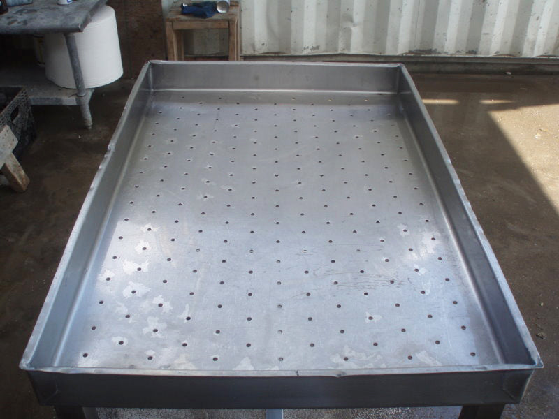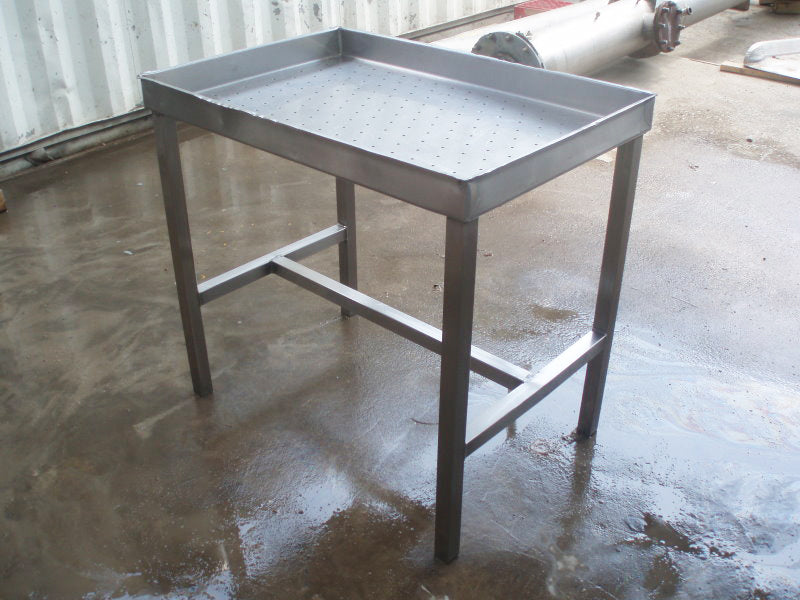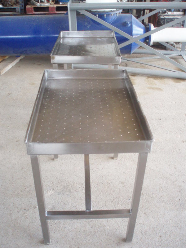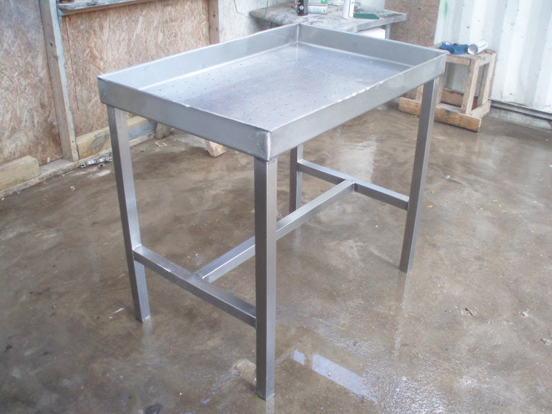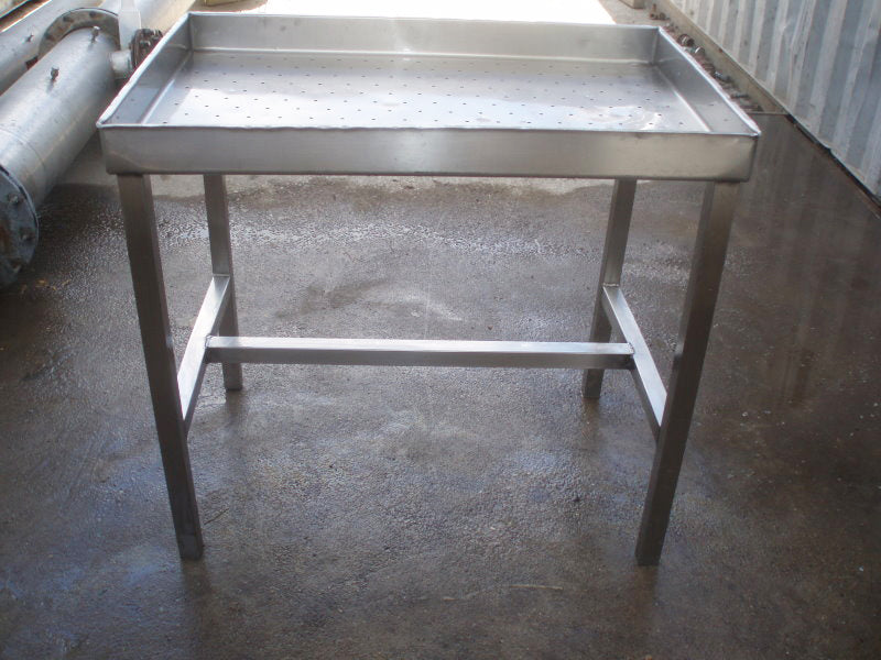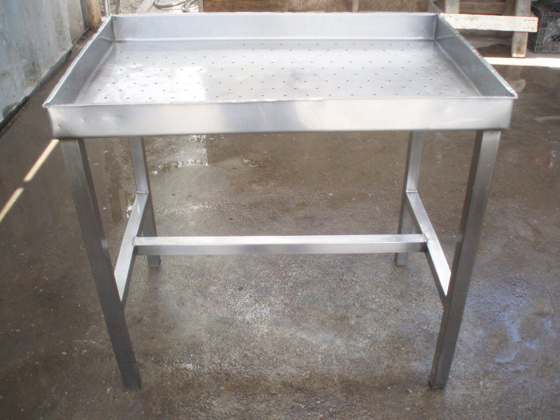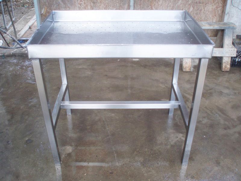 Stainless Steel Cheese Drain Table. Qty available: 1. (216) ¼ in. diameter drain holes. Overall dimensions: 3 ft. 3/8 in. L. x 2 ft. ½ in. W. x 2 ft. 9-3/4 in.