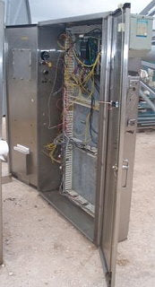 Stainless Steel Control Panel. General Electric 1.5 KVA Transformer. Model: 9T51B11. Primary voltage: 240/480, secondary voltage: 120/240. Allen-Bradley 1336 Variable Frequency Inverter, S/N: 1JAU1AV8, Cat. No: 1336S-BRF100-AN-EN5, Series: E. Overall dimensions: 4 ft. 11 in. L x 1 ft. 3-1/2 in. W x 5 ft. H.(H11).